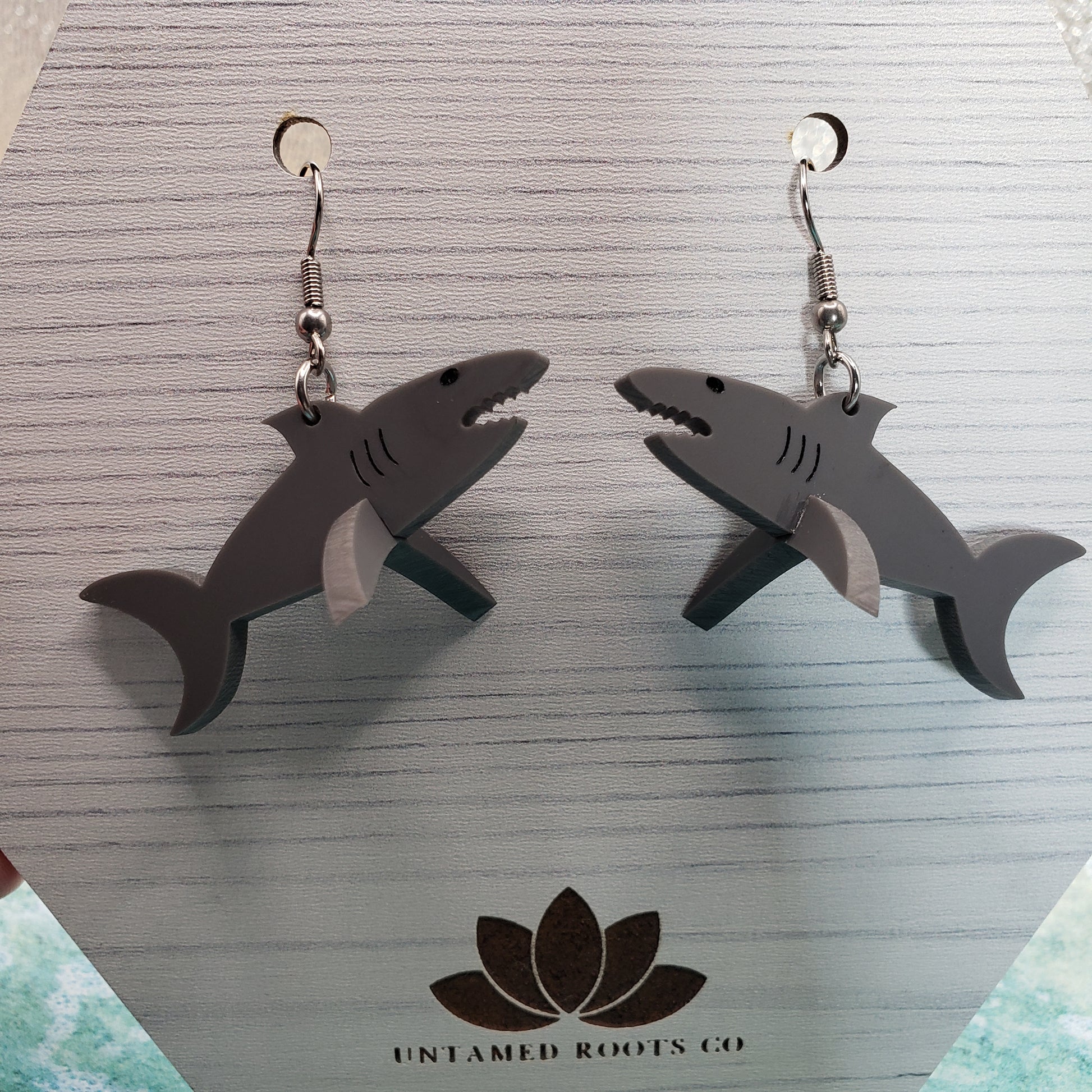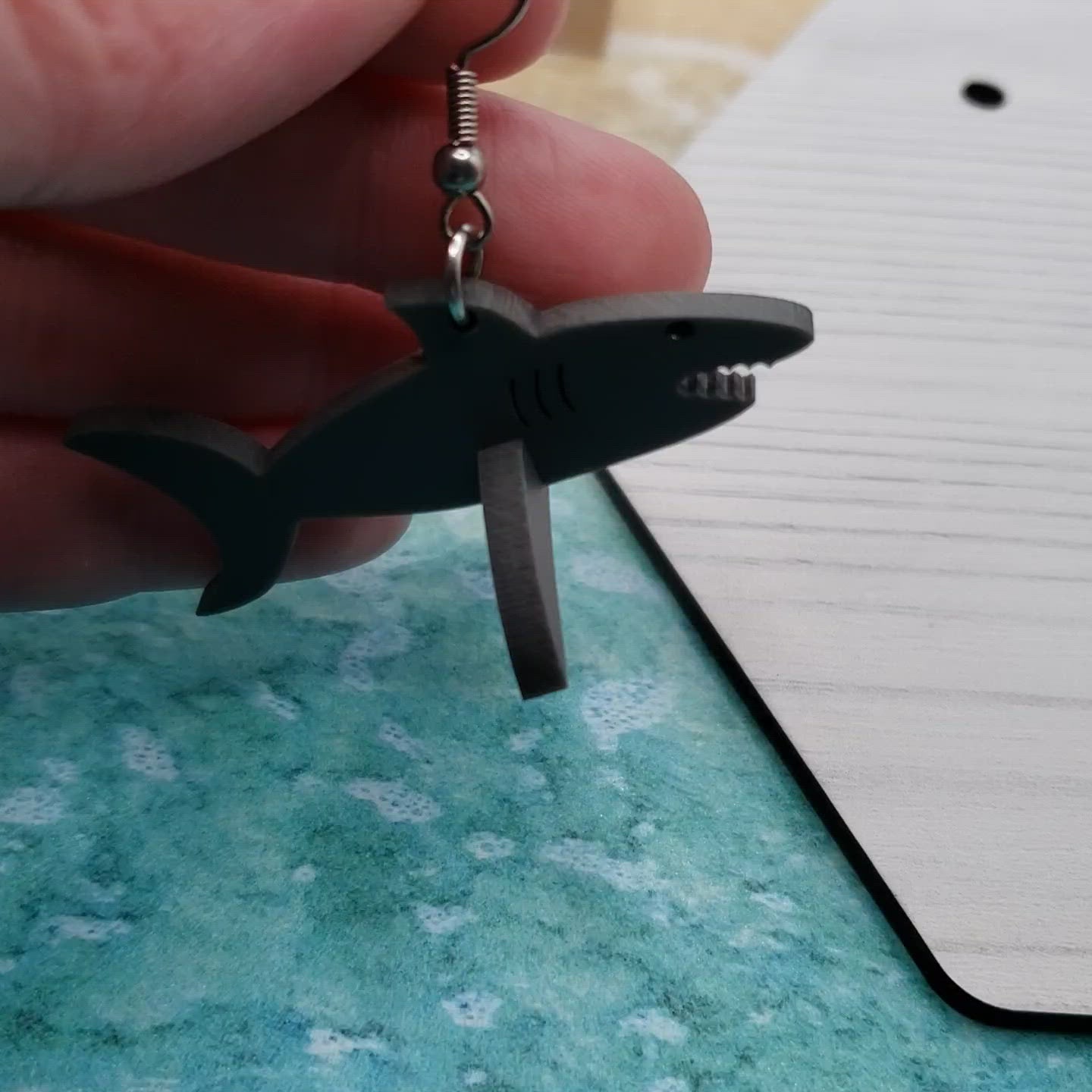 These sharks are made from multiple pieces that are fit together for a unique 3-D design! The backside of each earring is gloss gray, so they need to be worn on the correct side to see the eye and gills. When they're on, the shark is meant to look like it is swimming forward.