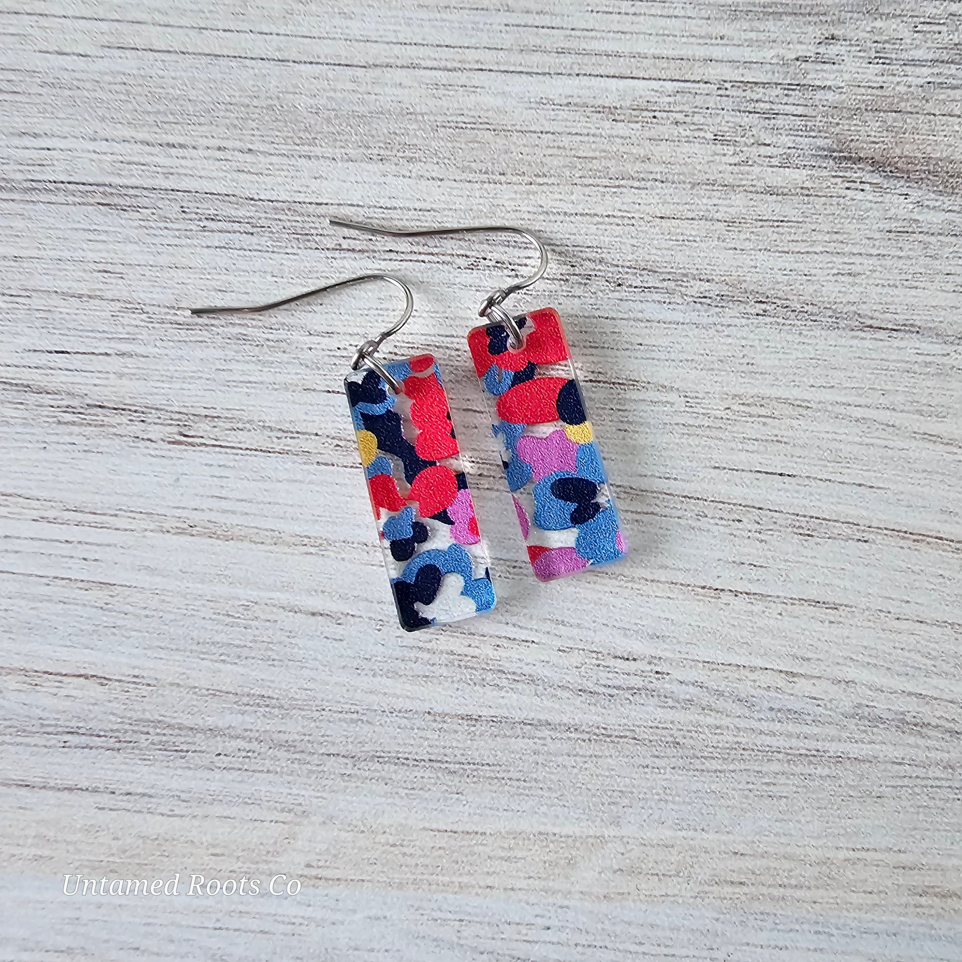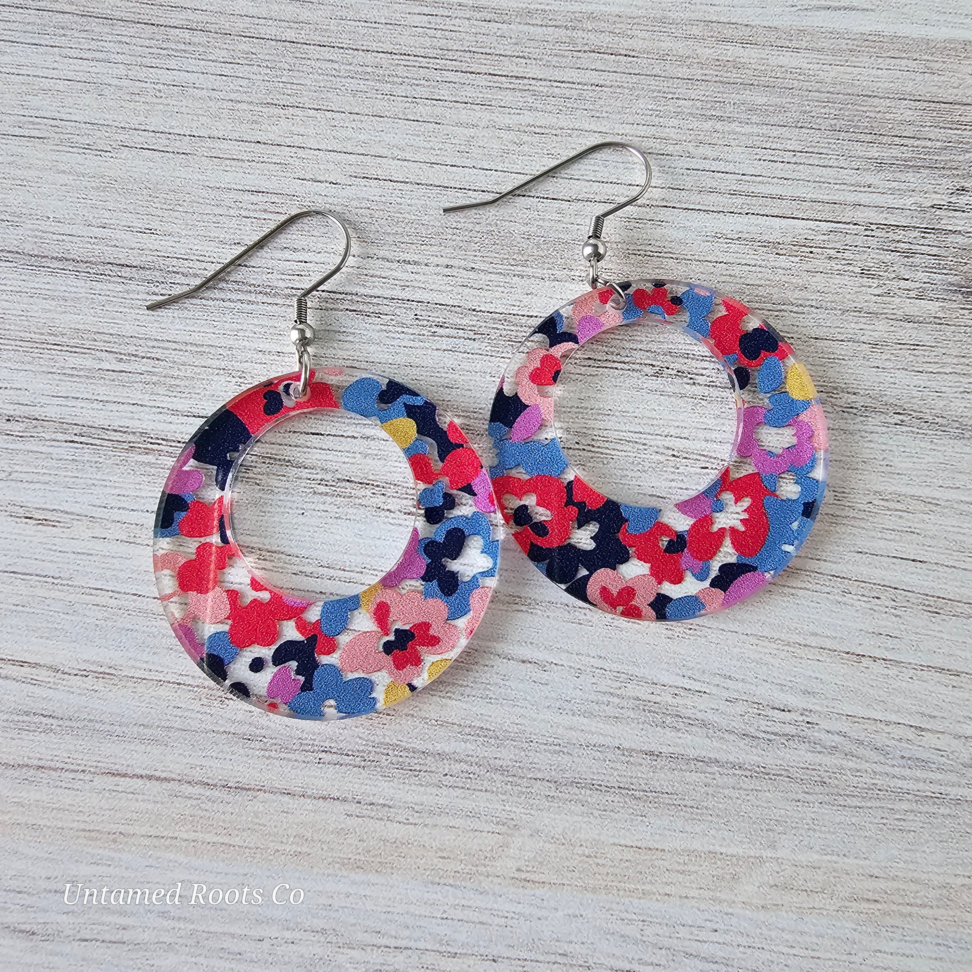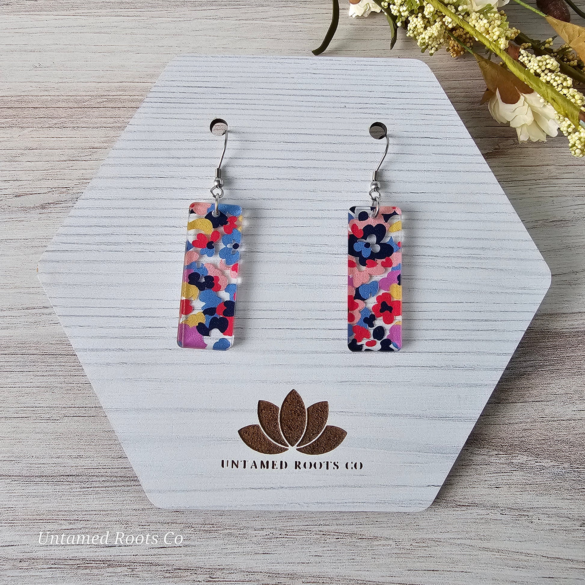Available in 8 different sizes and shapes, these earrings feature a clear acrylic with an abstract floral print!