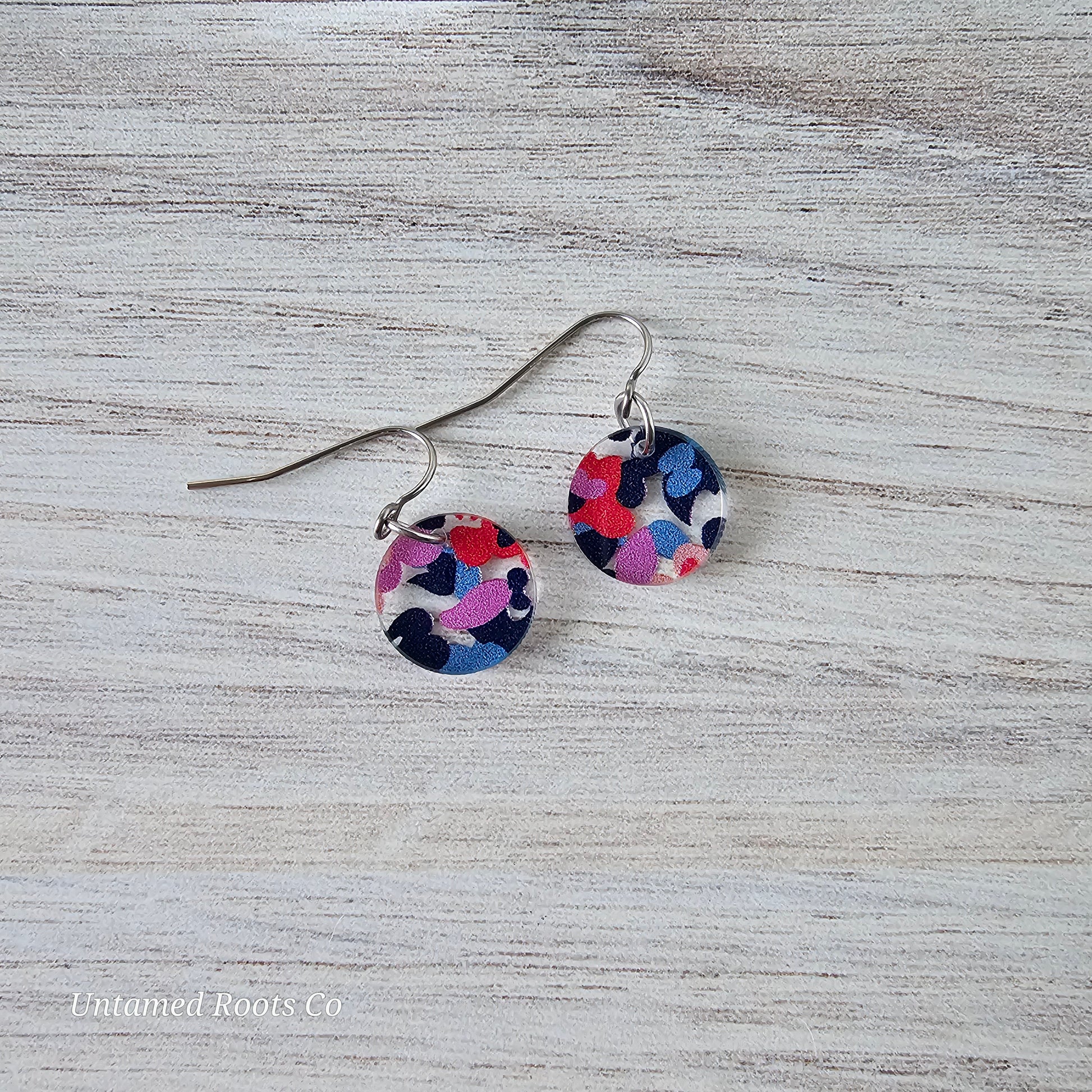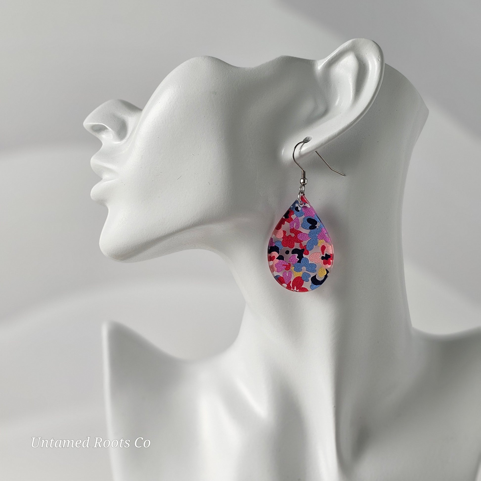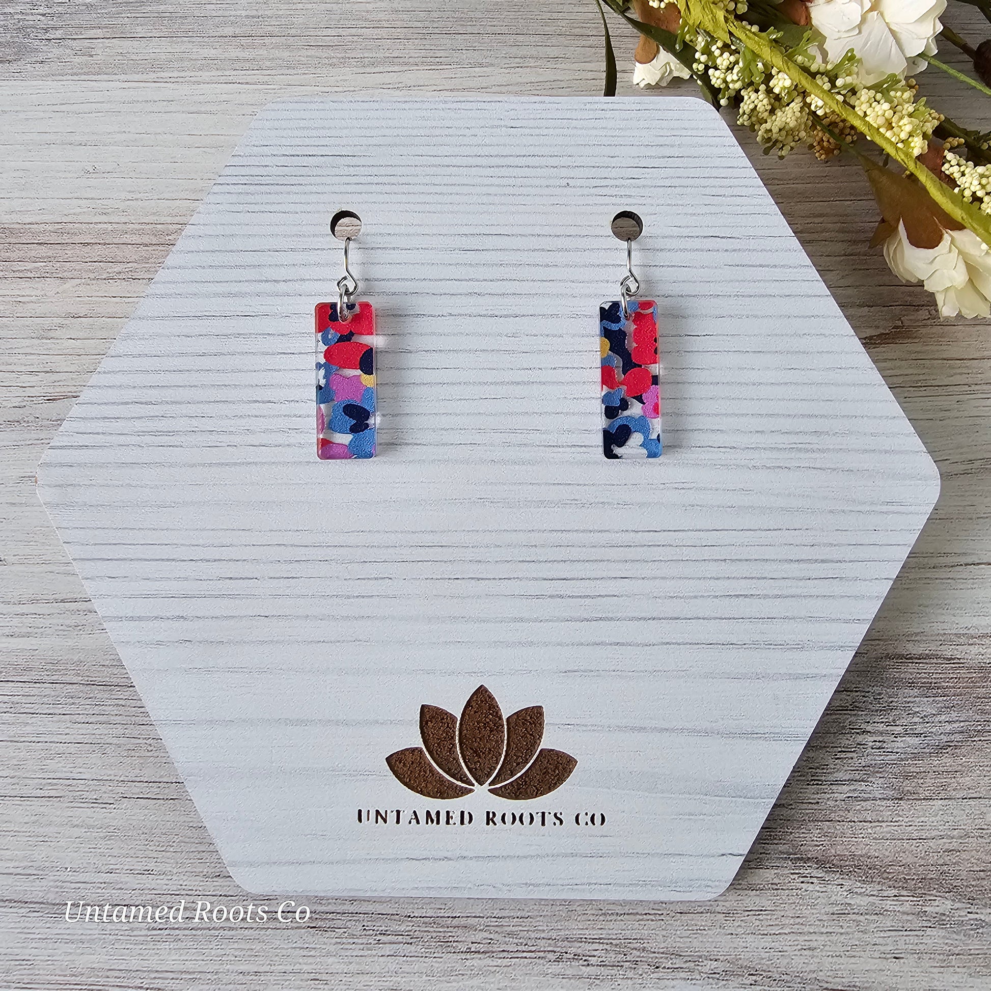 Available in 8 different sizes and shapes, these earrings feature a clear acrylic with an abstract floral print!