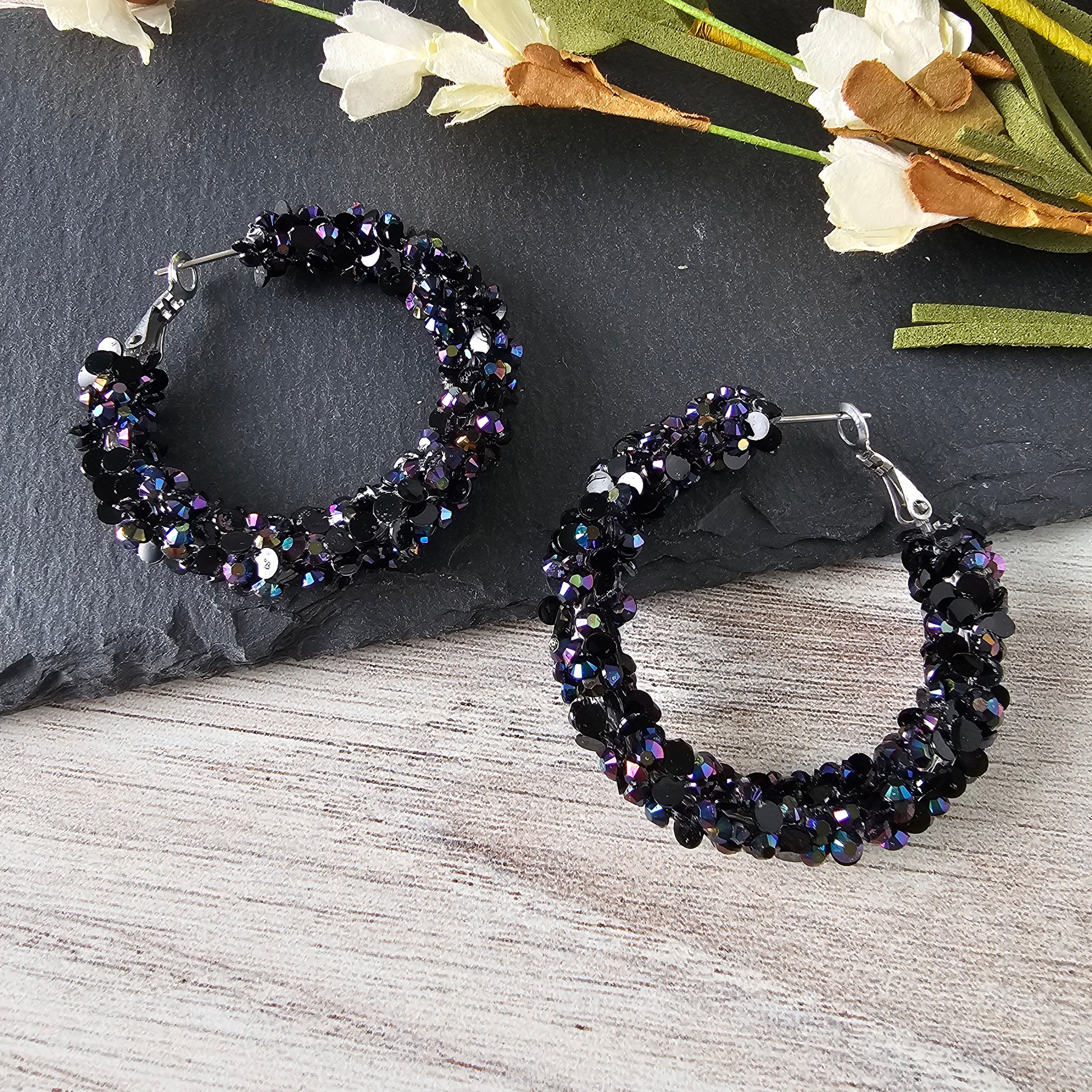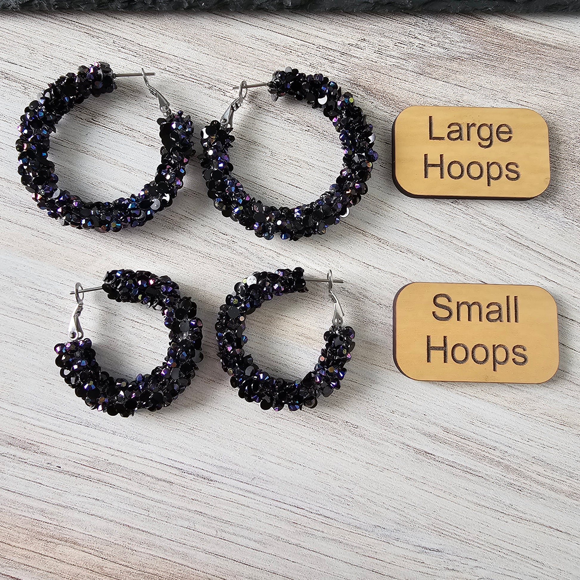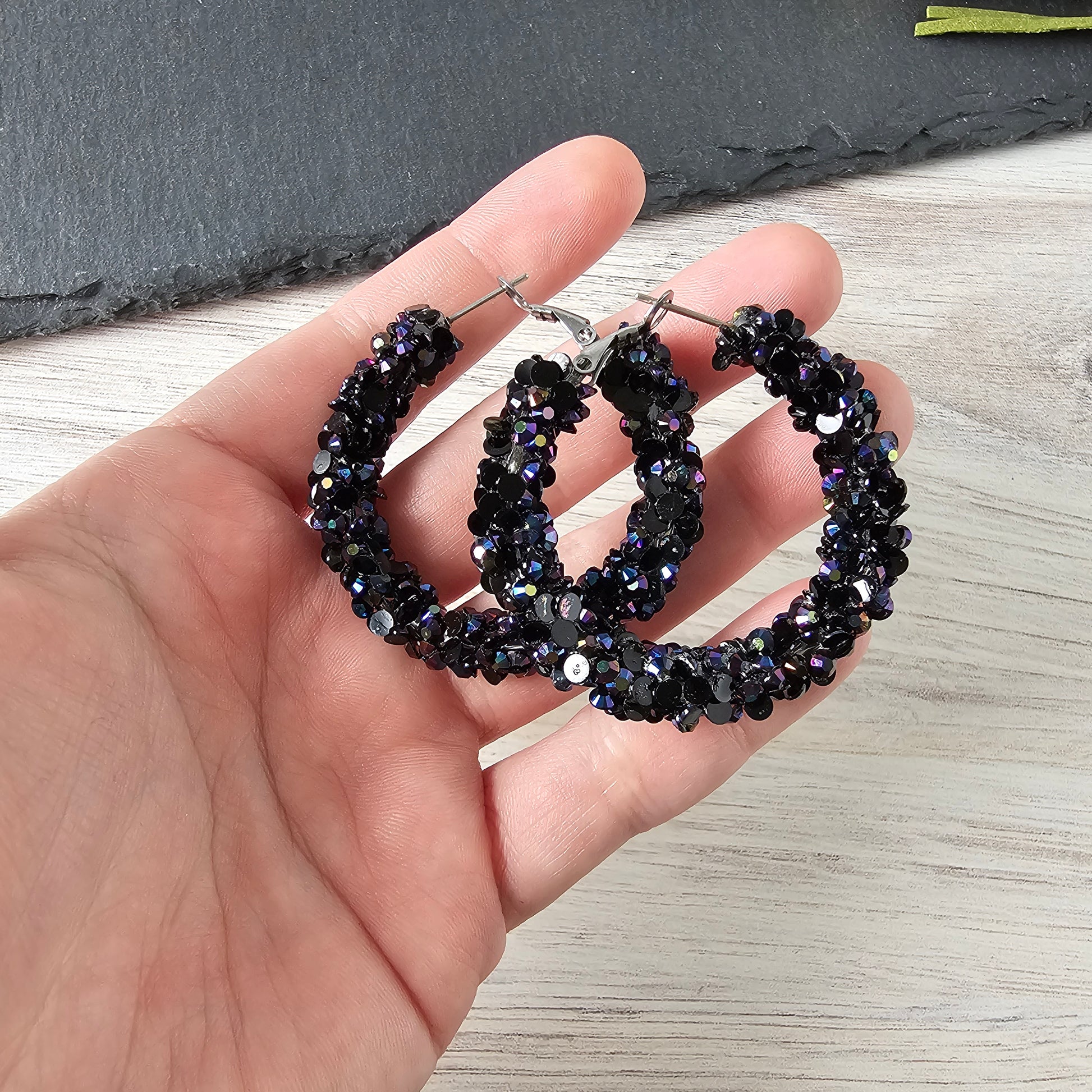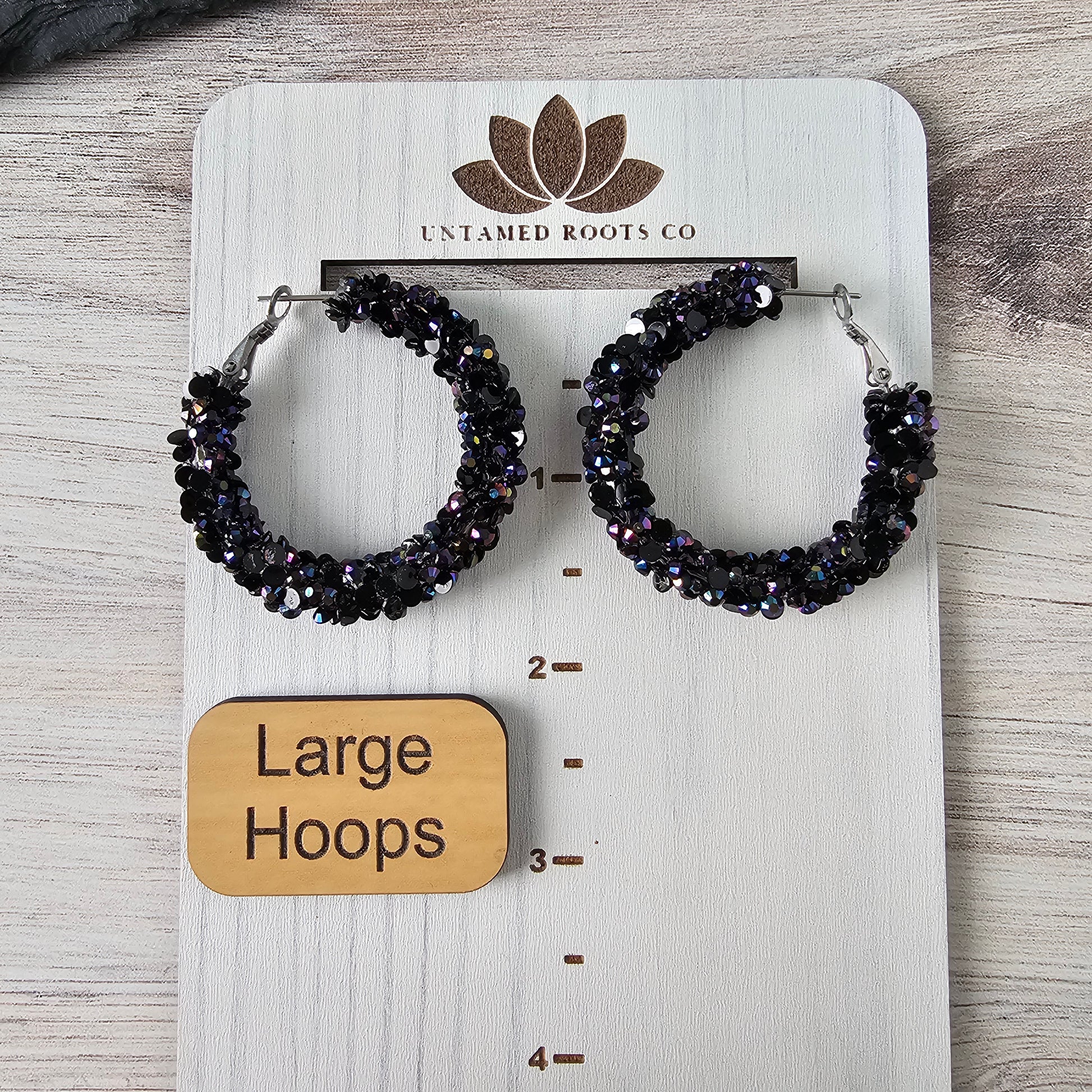 Make a statement with our Black Super Chunky Glitter Hoop earrings. The iridescent chunky rhinestone glitter adds a touch of sparkle to any outfit. Hypoallergenic stainless steel hoops make these earrings perfect for those with sensitive ears.