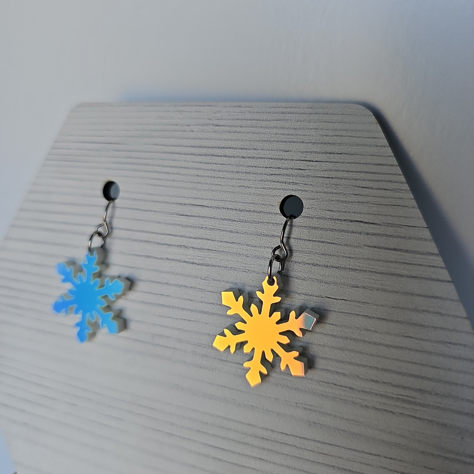 These snowflake earrings provide a fun, stylish touch and captivating light play. Crafted from stainless steel and featuring an iridescent effect, they alternate between white, blue, pink, and yellow shades. Perfect for the holiday season and beyond!