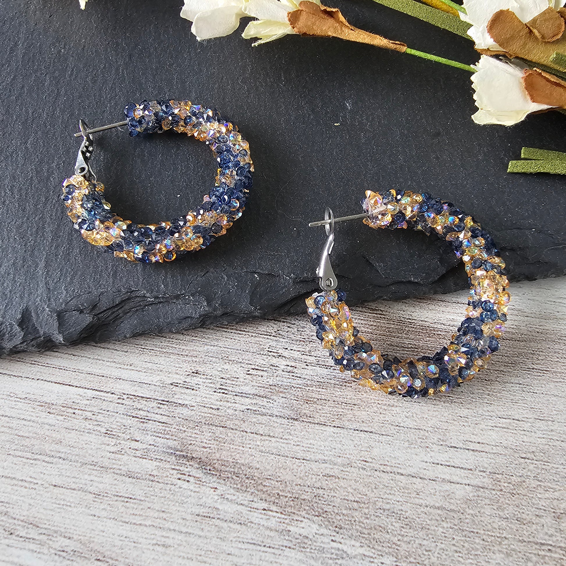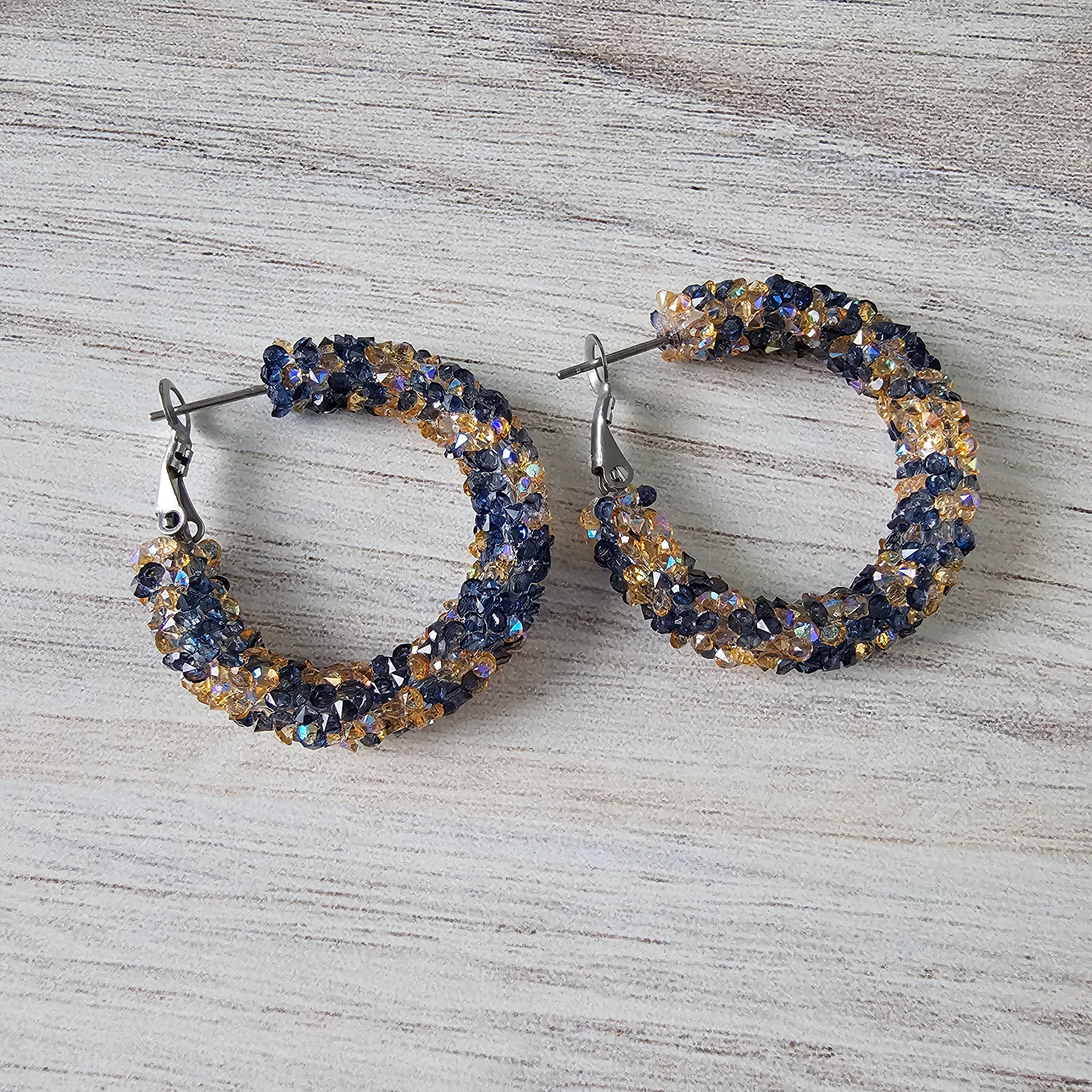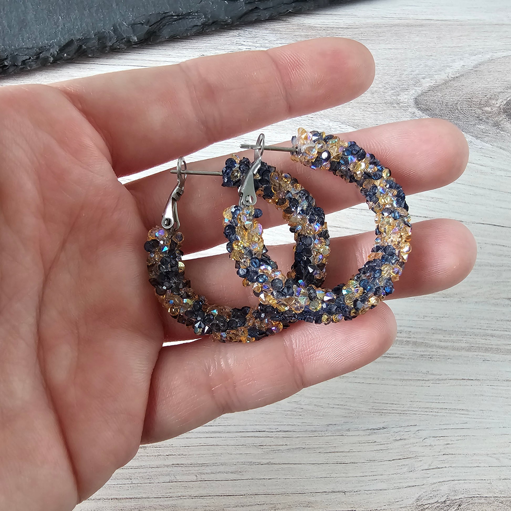 Add a touch of sparkle to your look with our Blue & Yellow Chunky Glitter Hoops. Made with blue and yellow rhinestone glitter, these hoops are perfect for sensitive ears with their stainless steel material.
