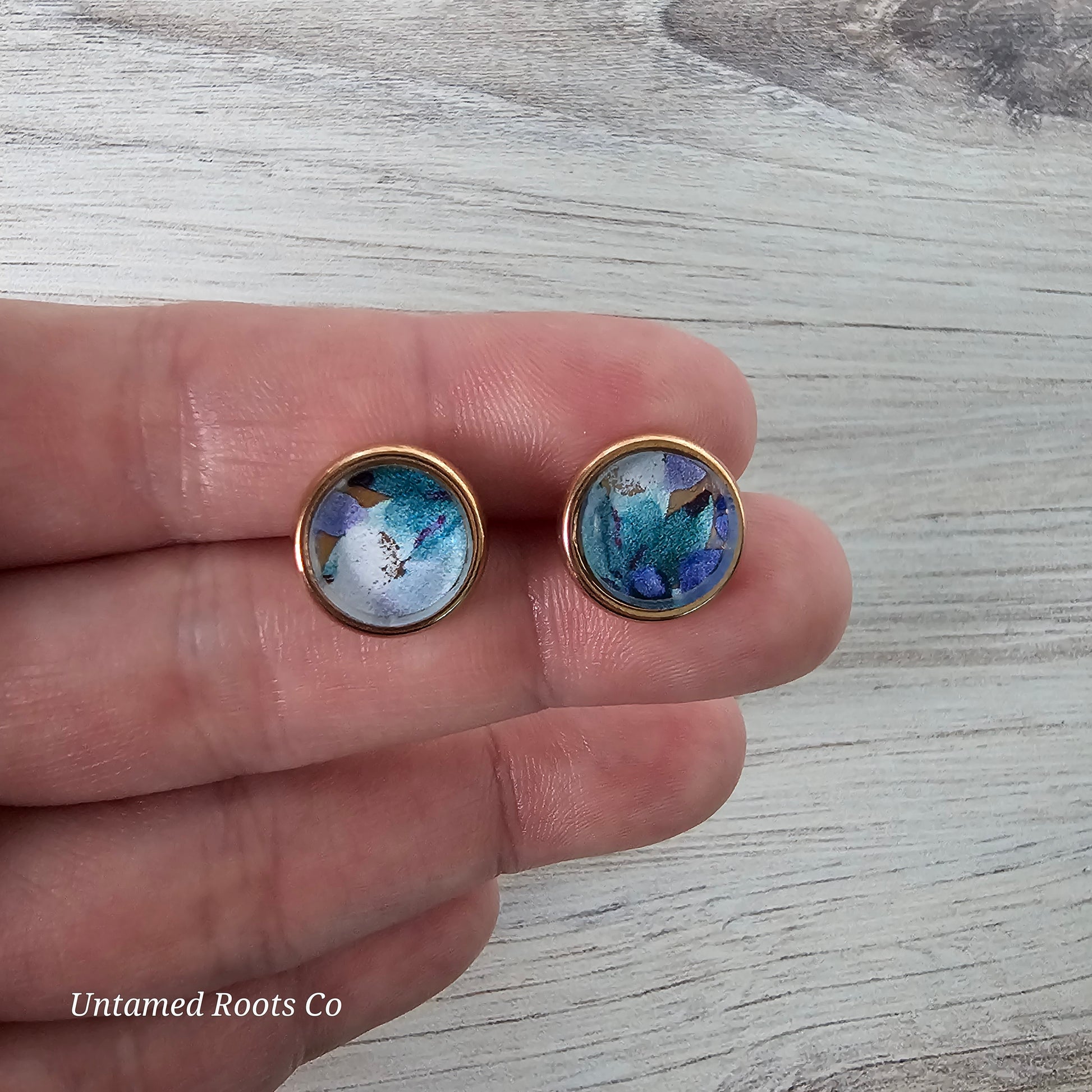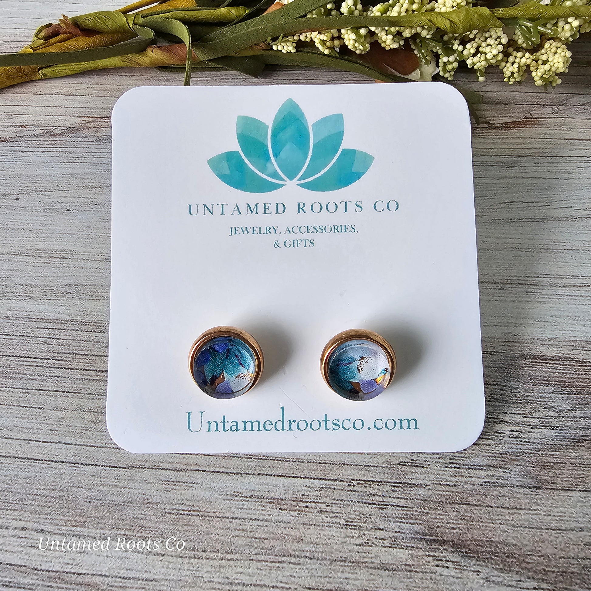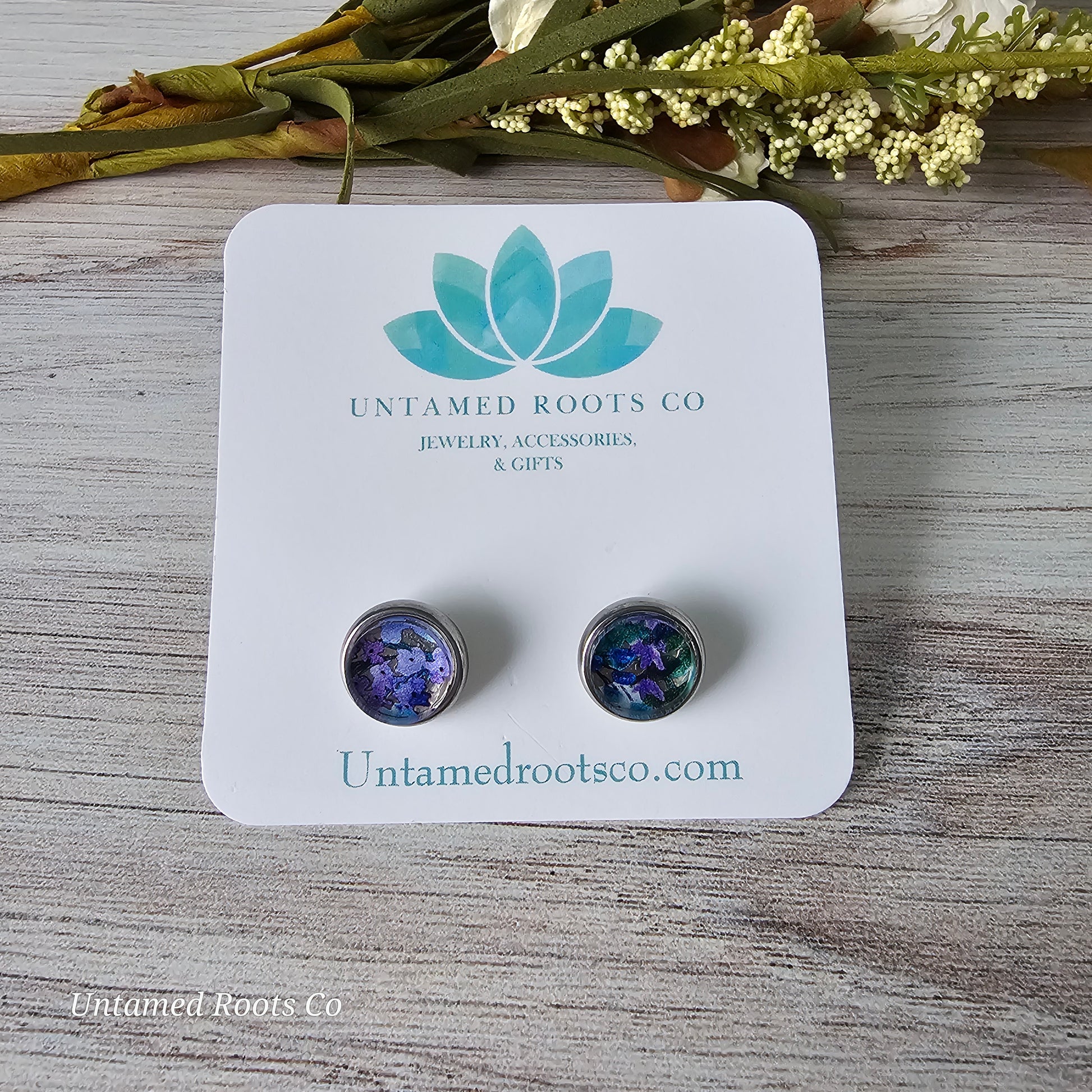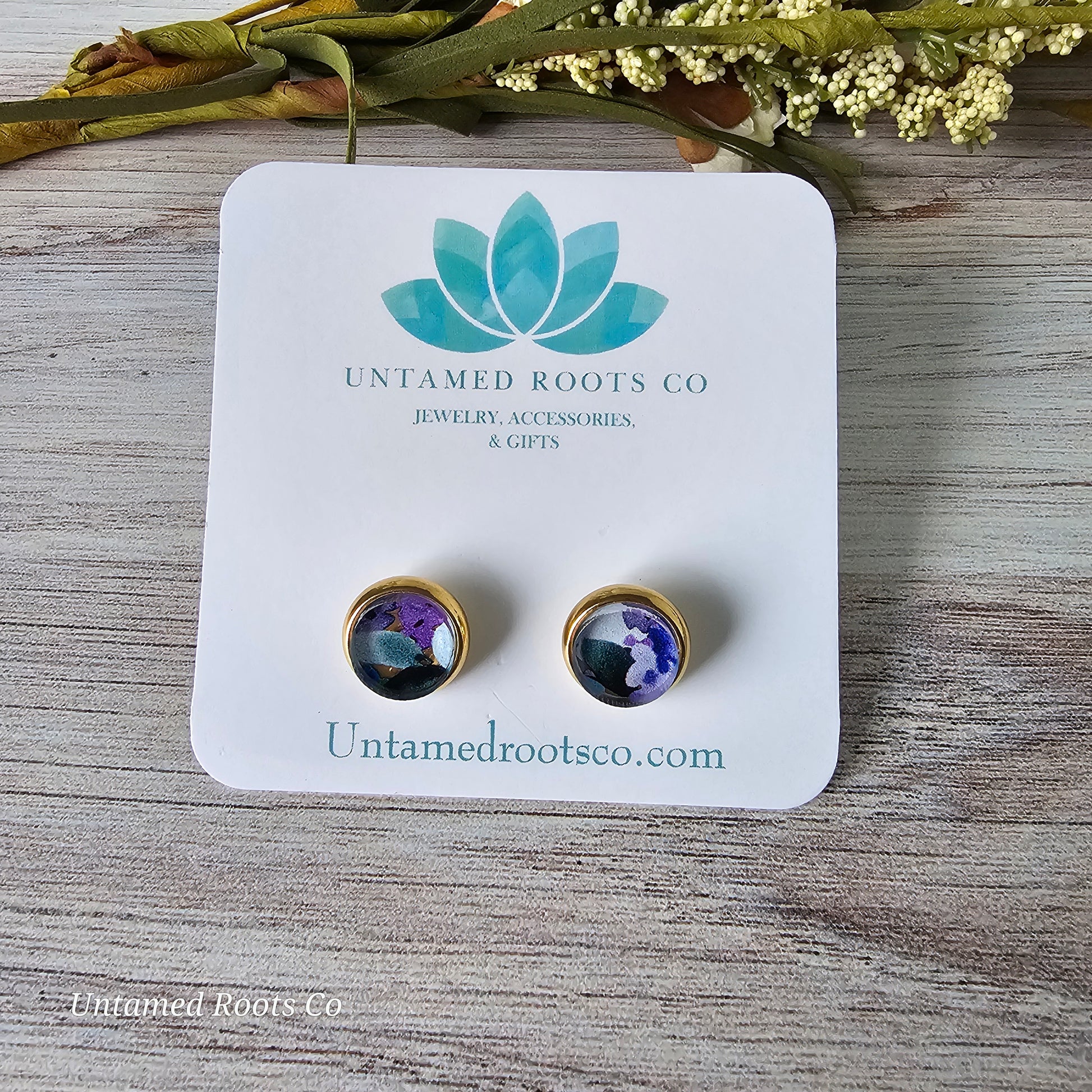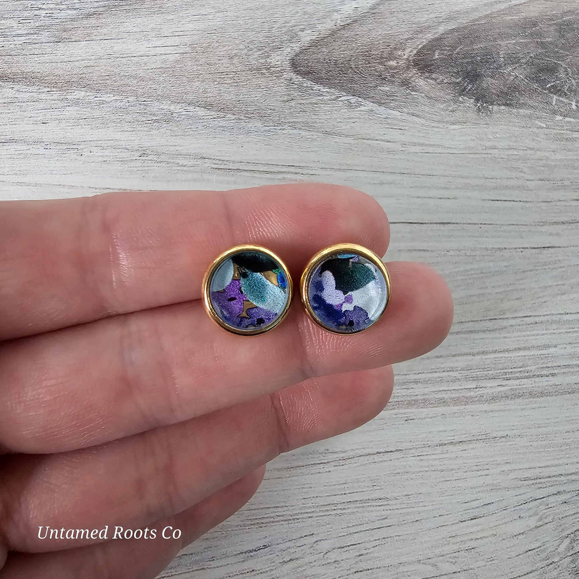 Blueberry Floral Print inside stainless steel bezel stud earrings.