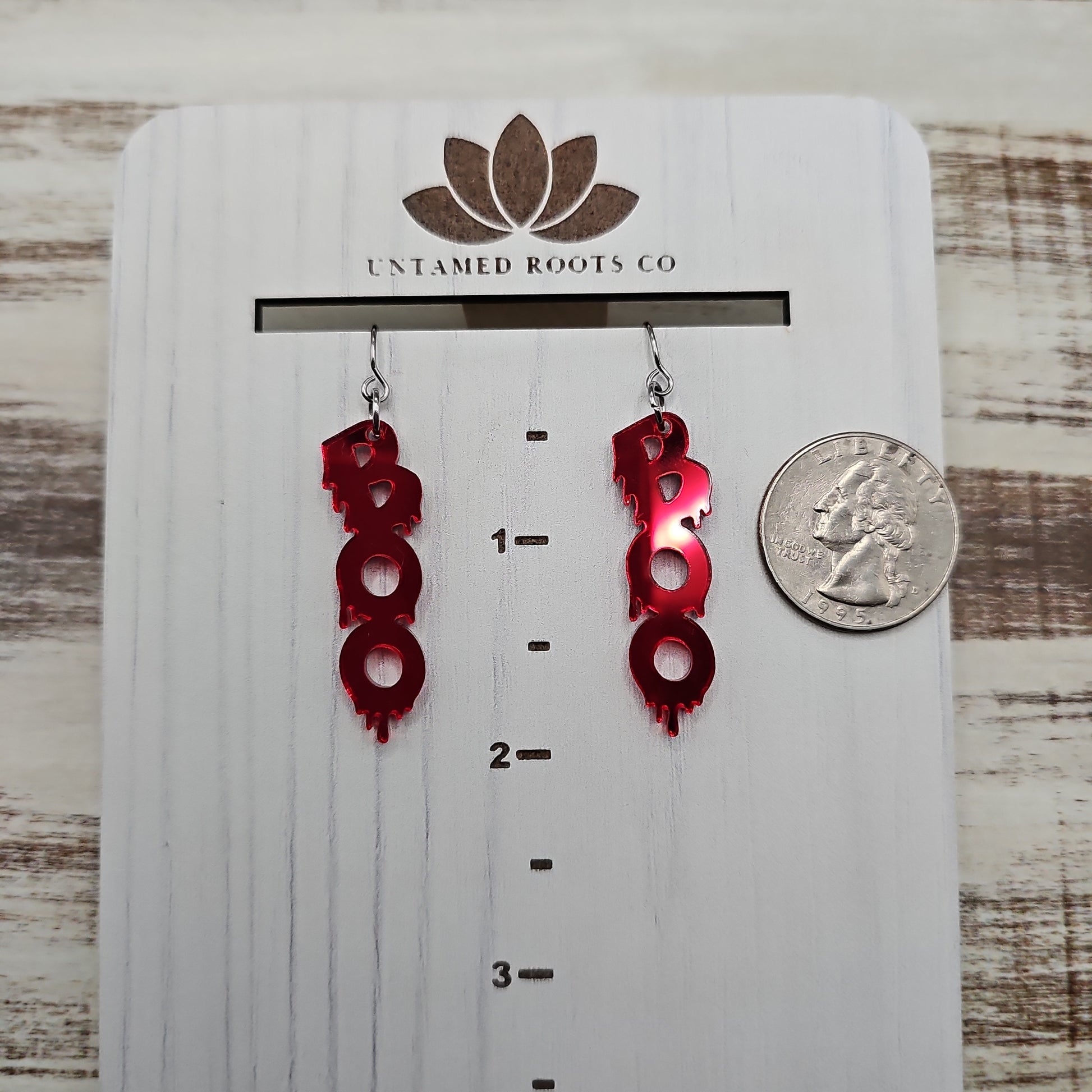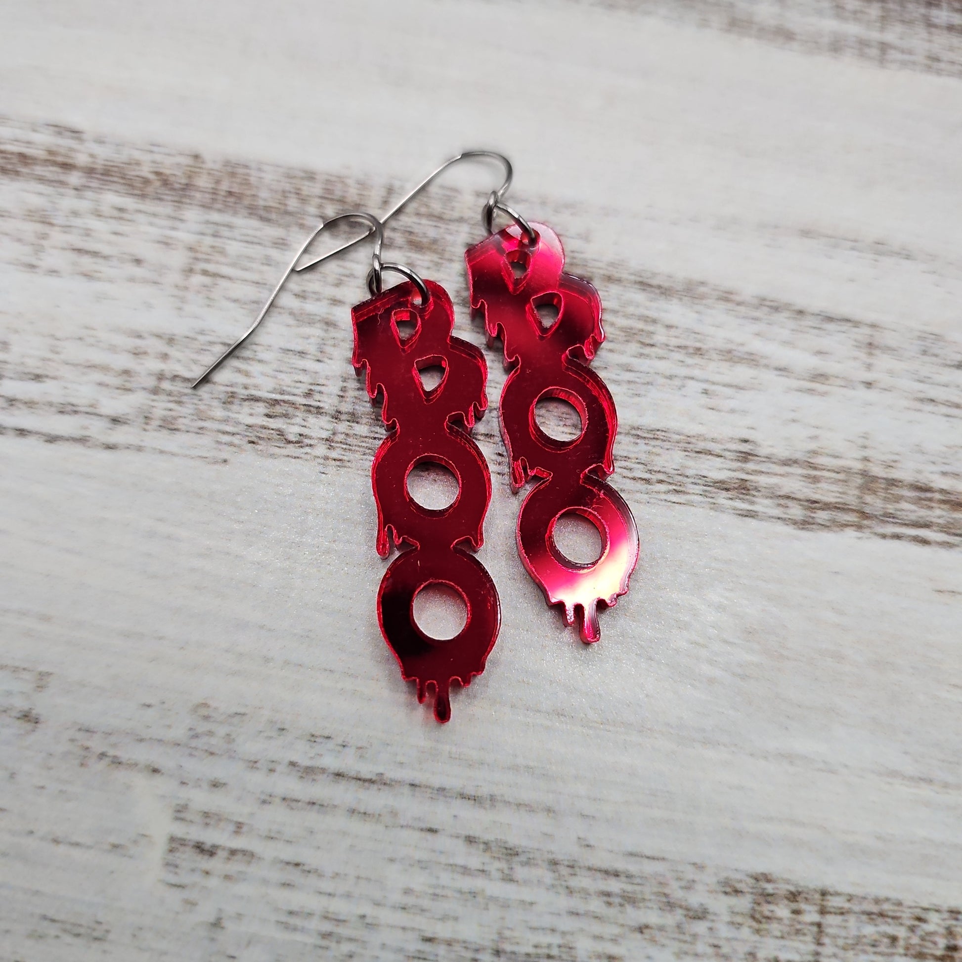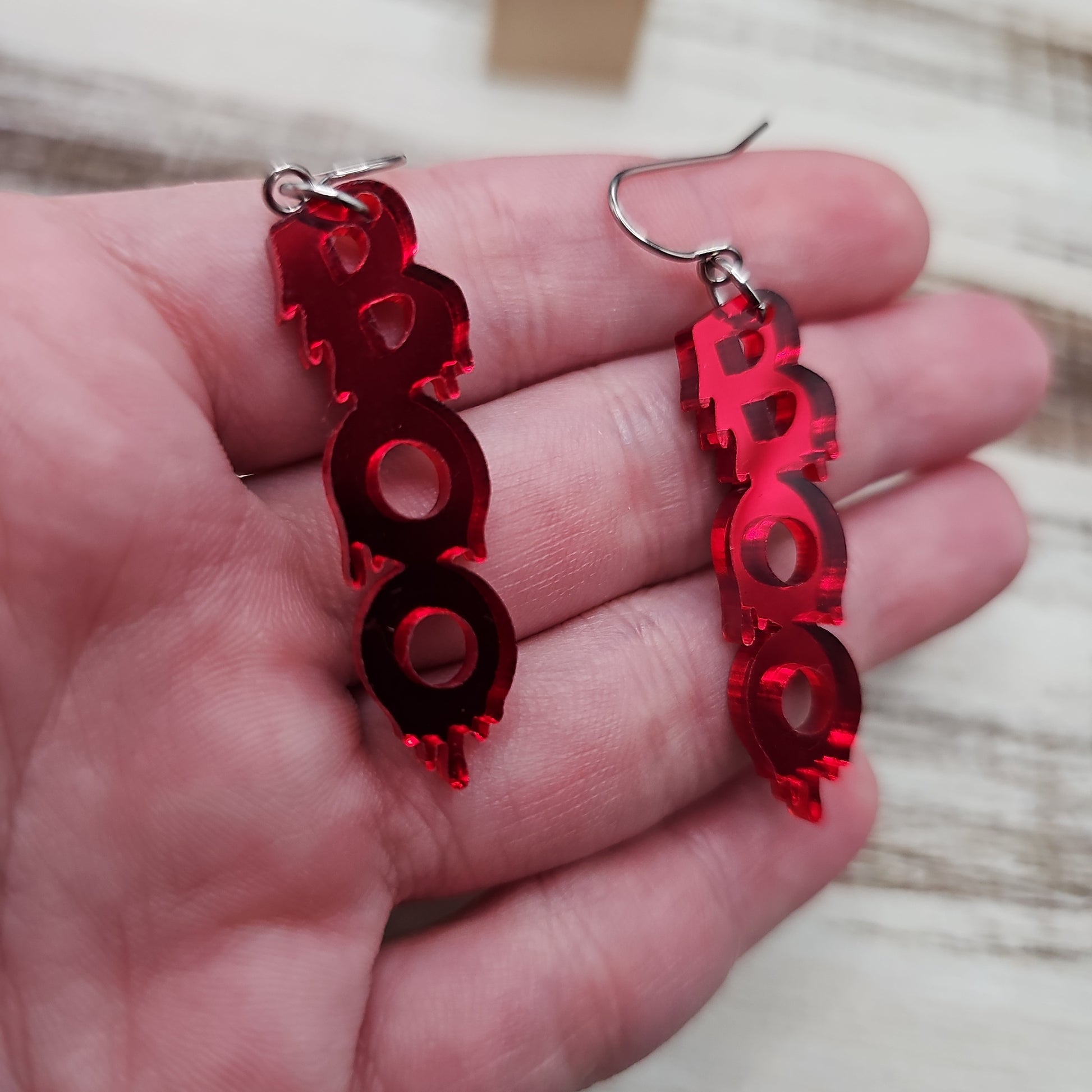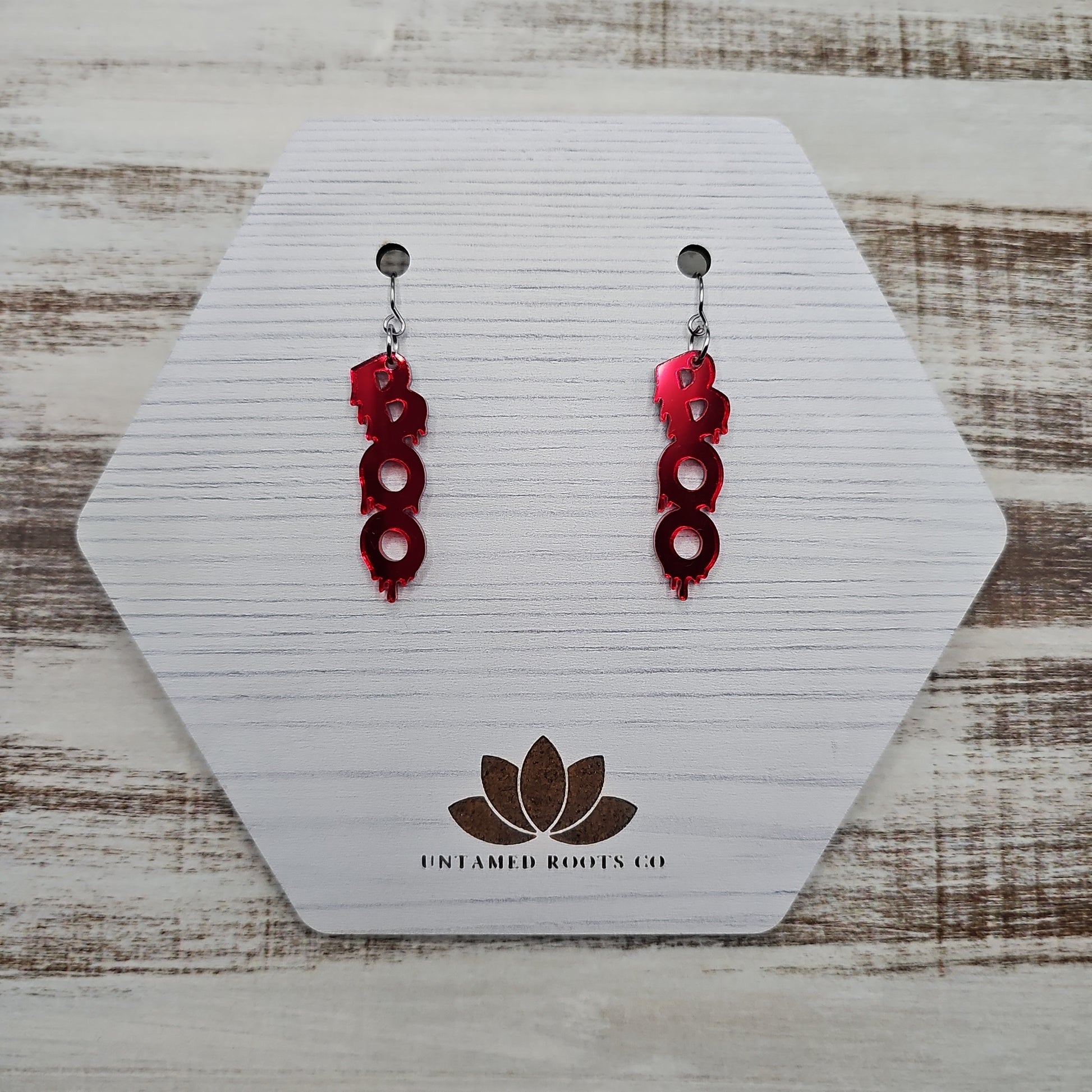 Discover delightful spooks with our Boo Blood Drip Earrings! These fun earrings feature deep red mirror acrylic with laser cut "boo" and blood drip details, all set in stainless steel hardware. Put the perfect finishing touch on your Halloween look with these spooky earrings!