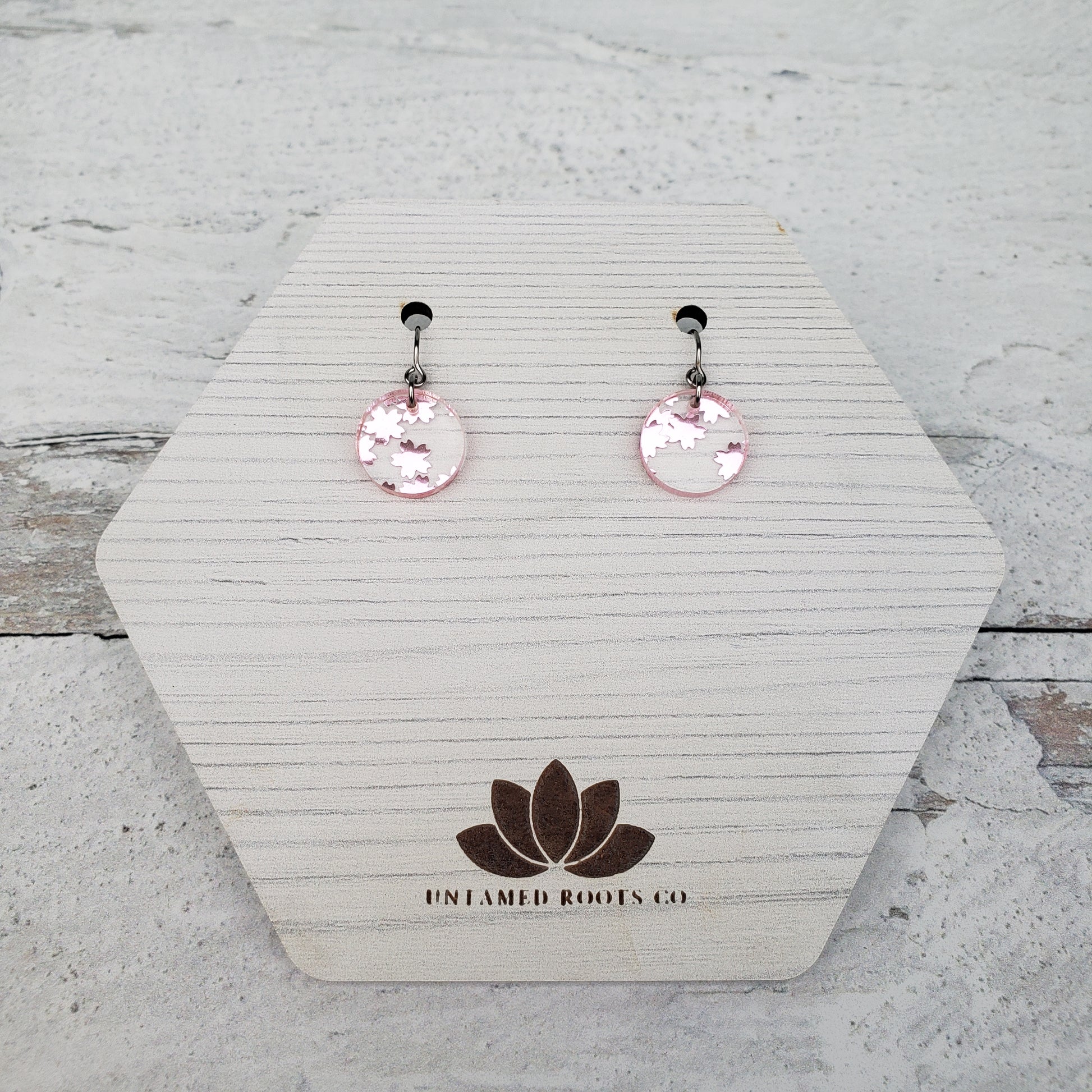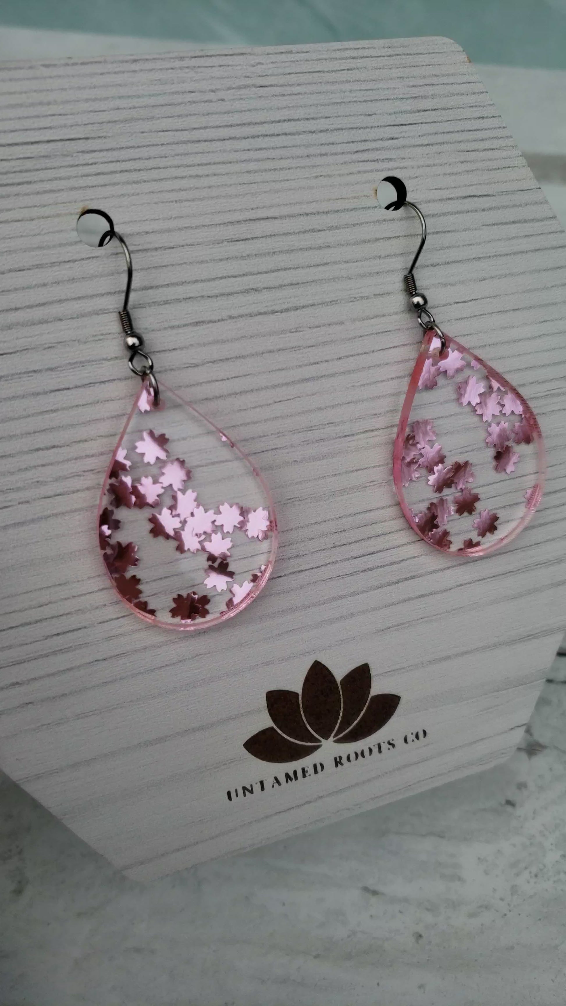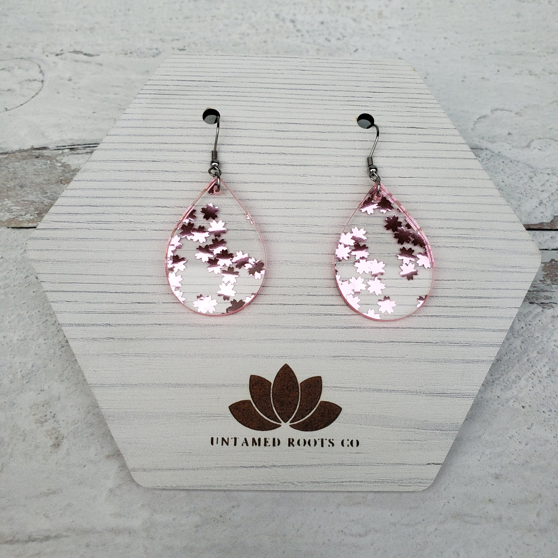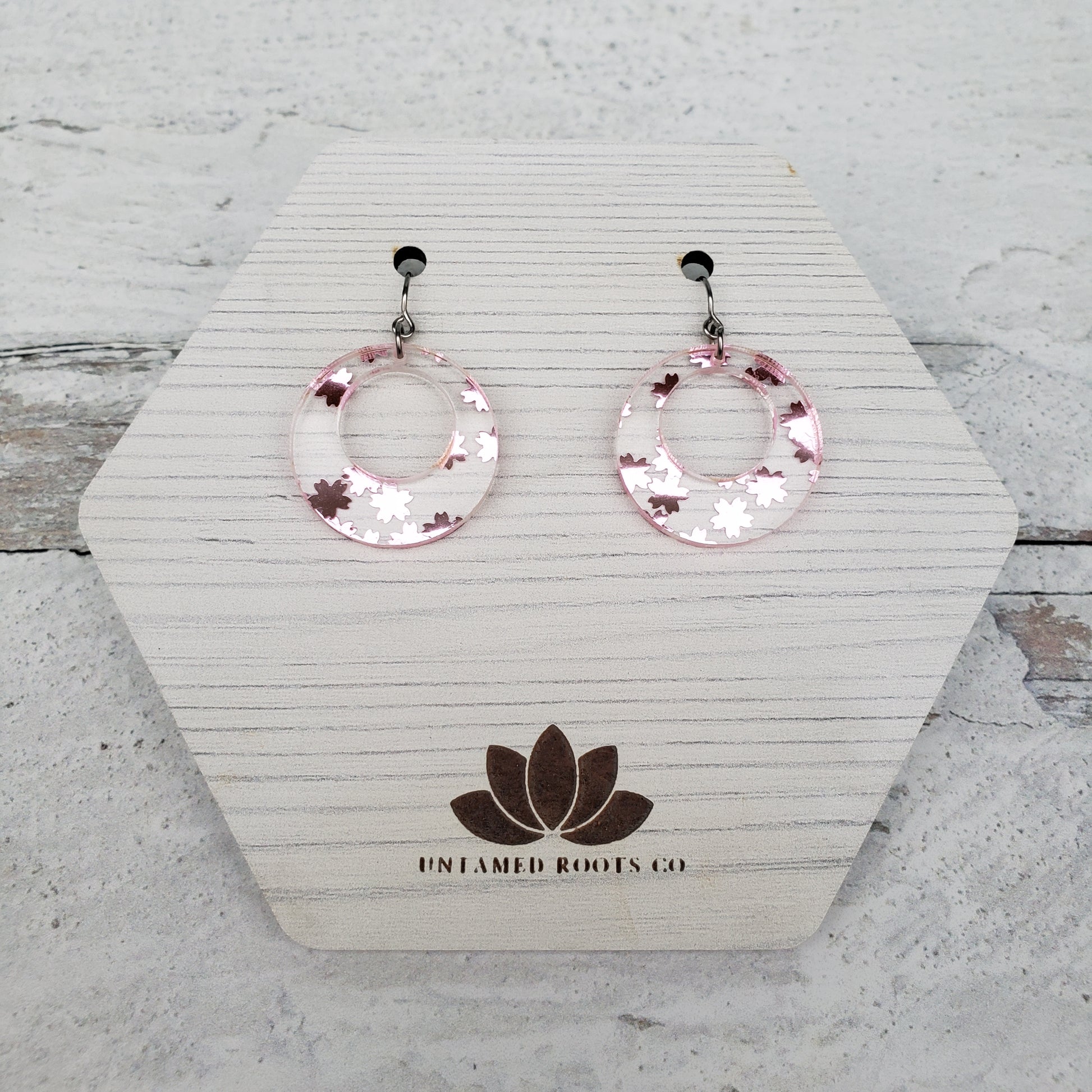 Available in 8 different sizes and shapes, these earrings feature a clear acrylic with a fun pink cherry blossom confetti!