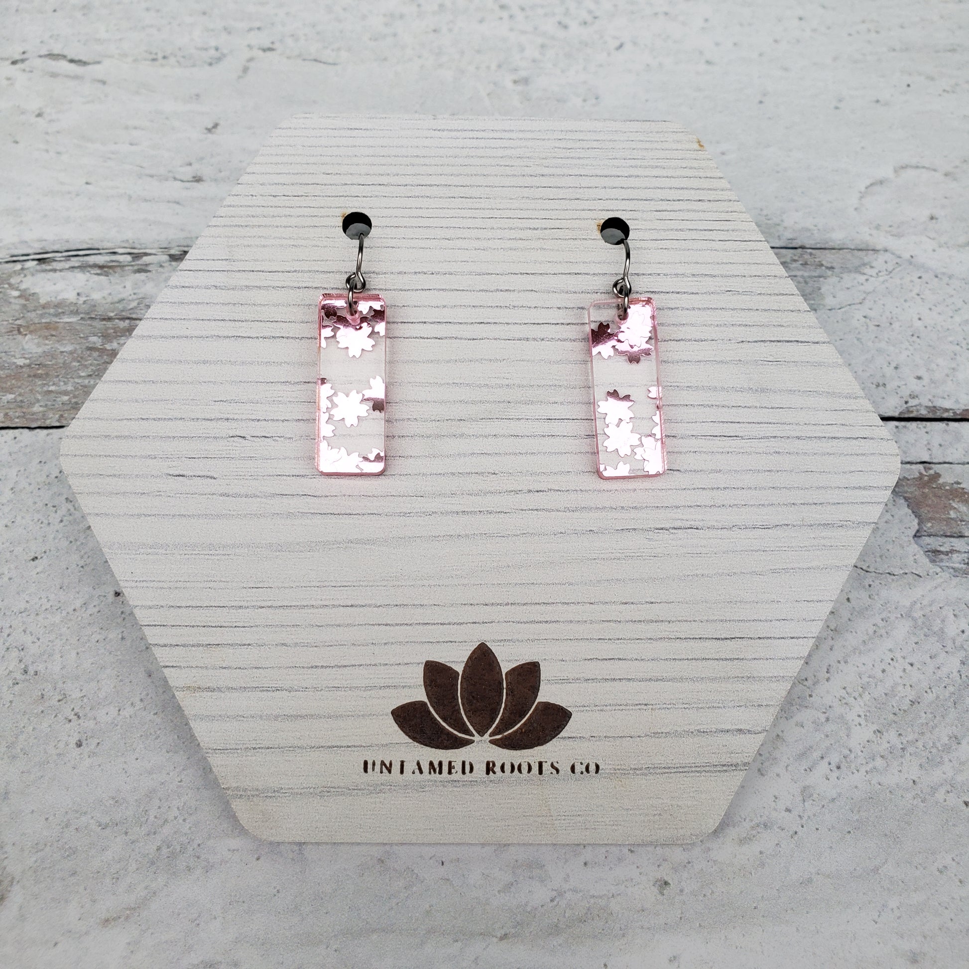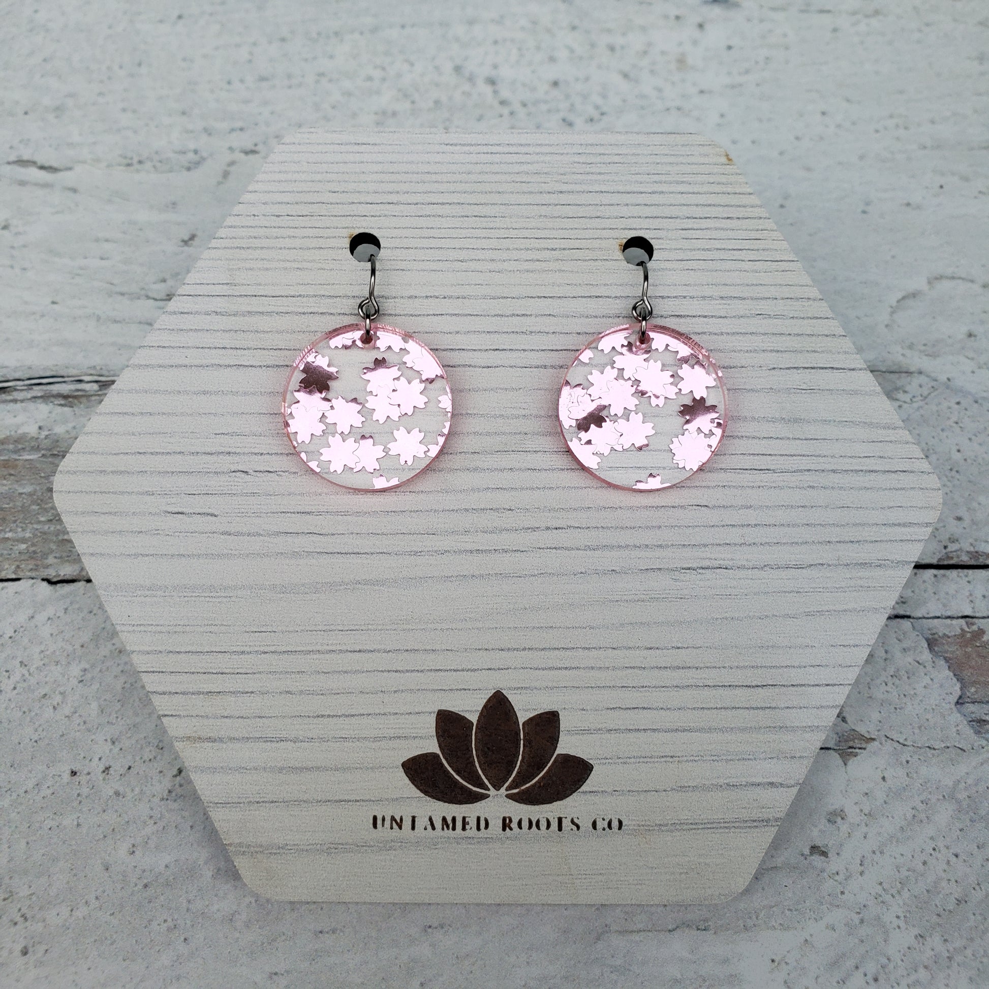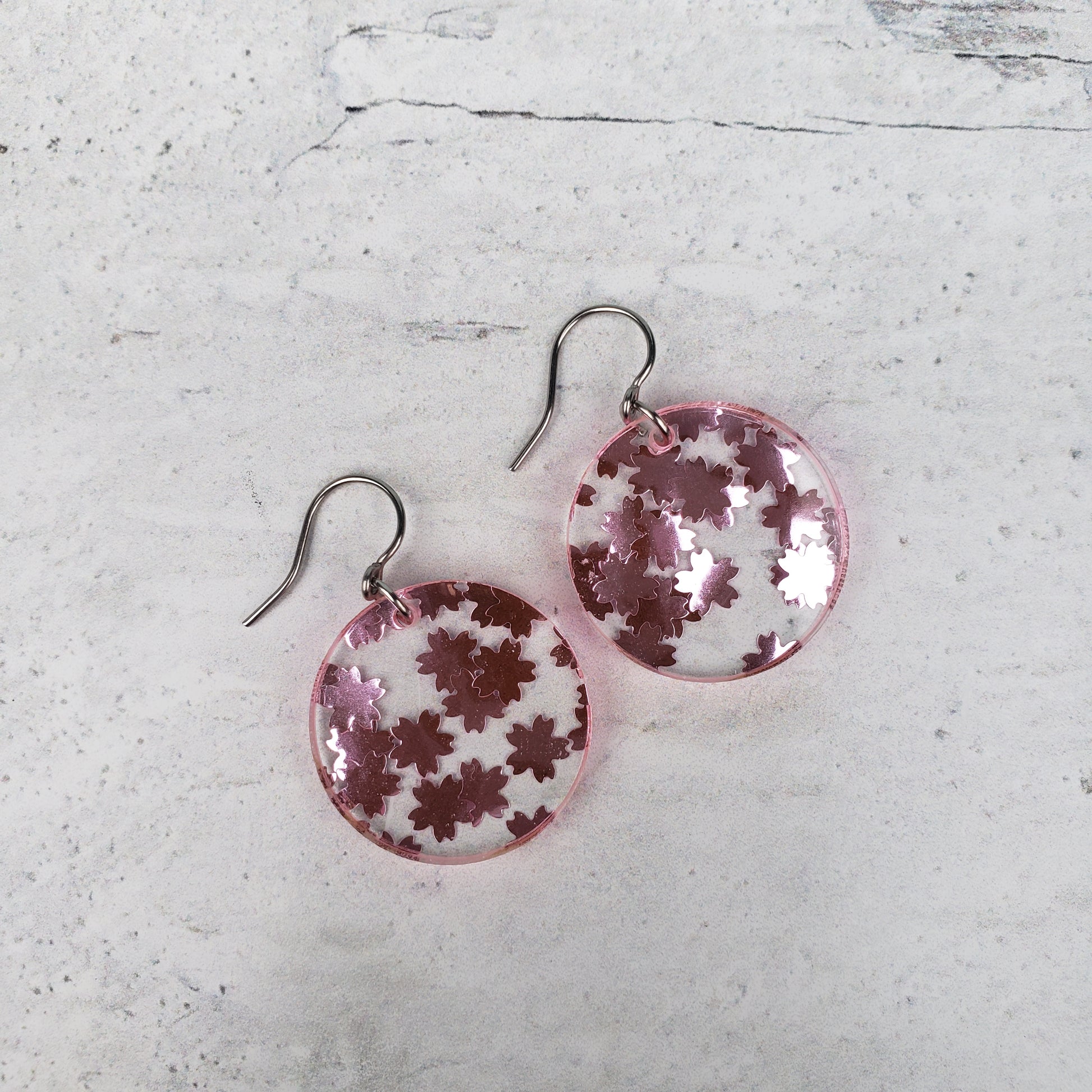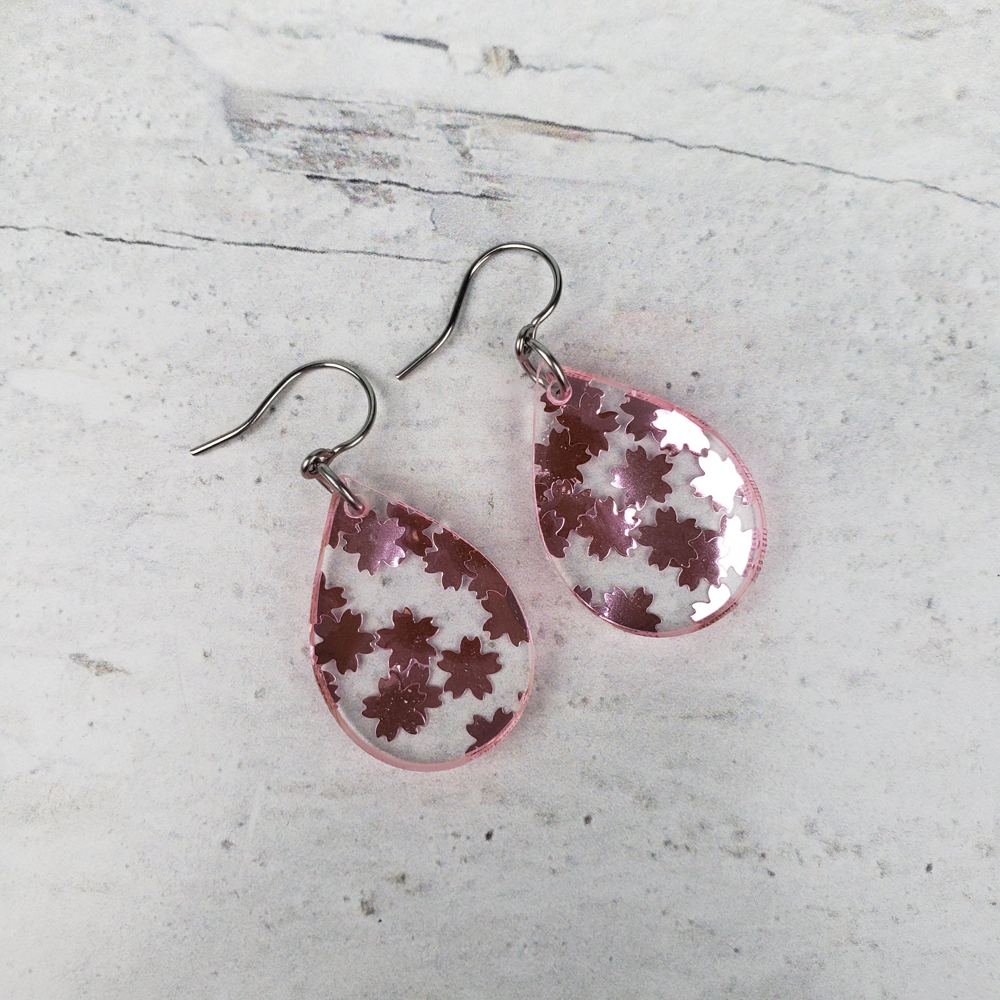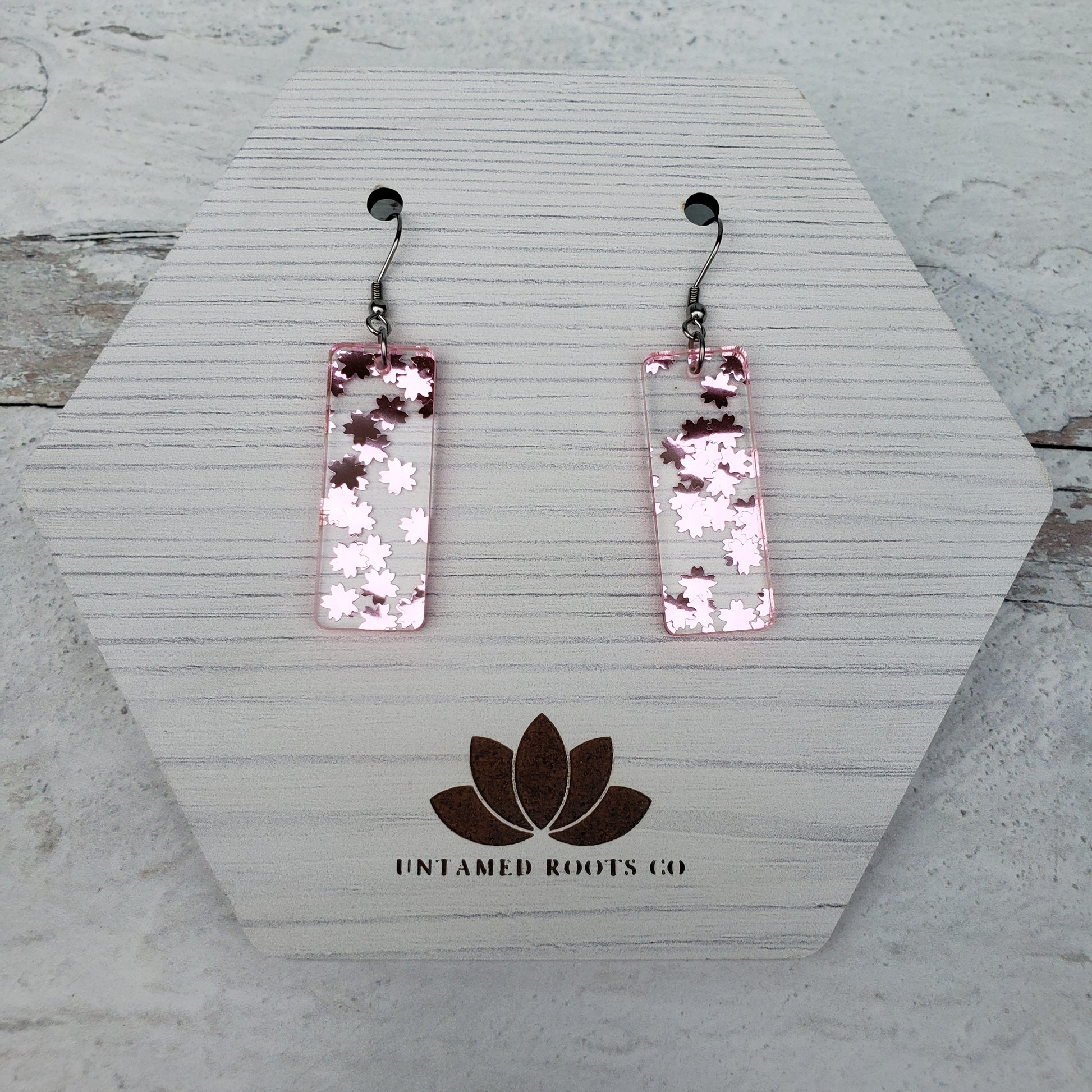 Available in 8 different sizes and shapes, these earrings feature a clear acrylic with a fun pink cherry blossom confetti!
