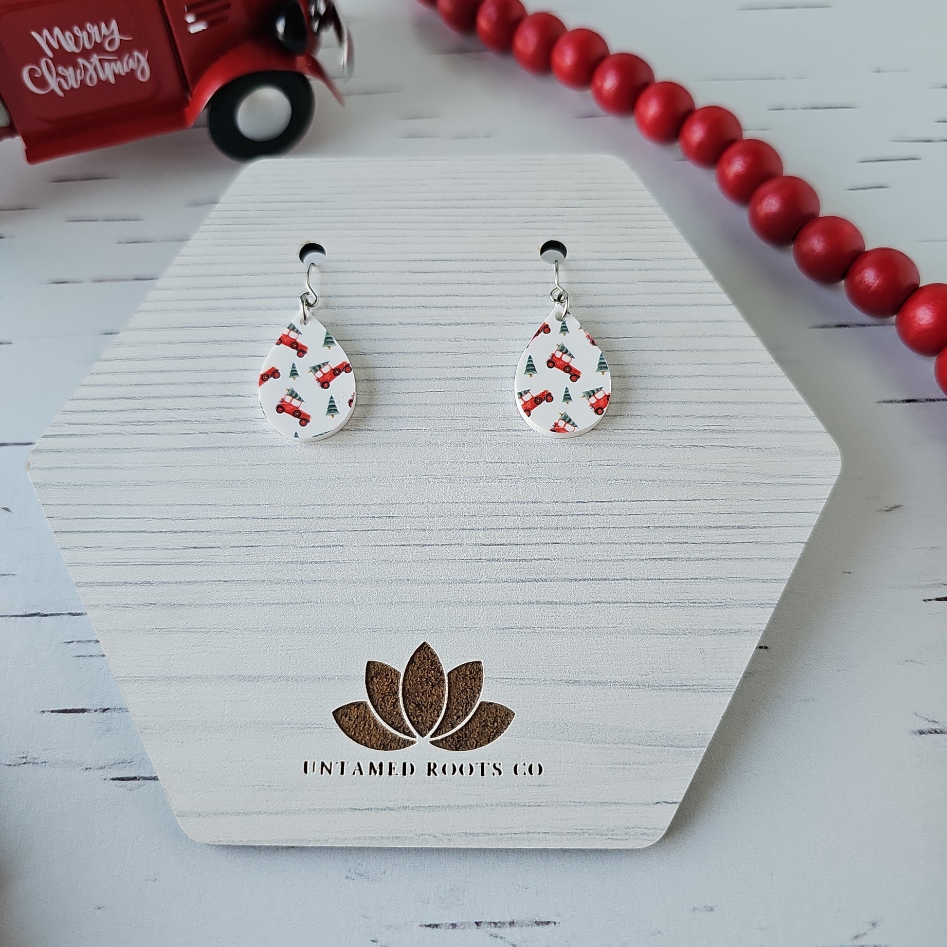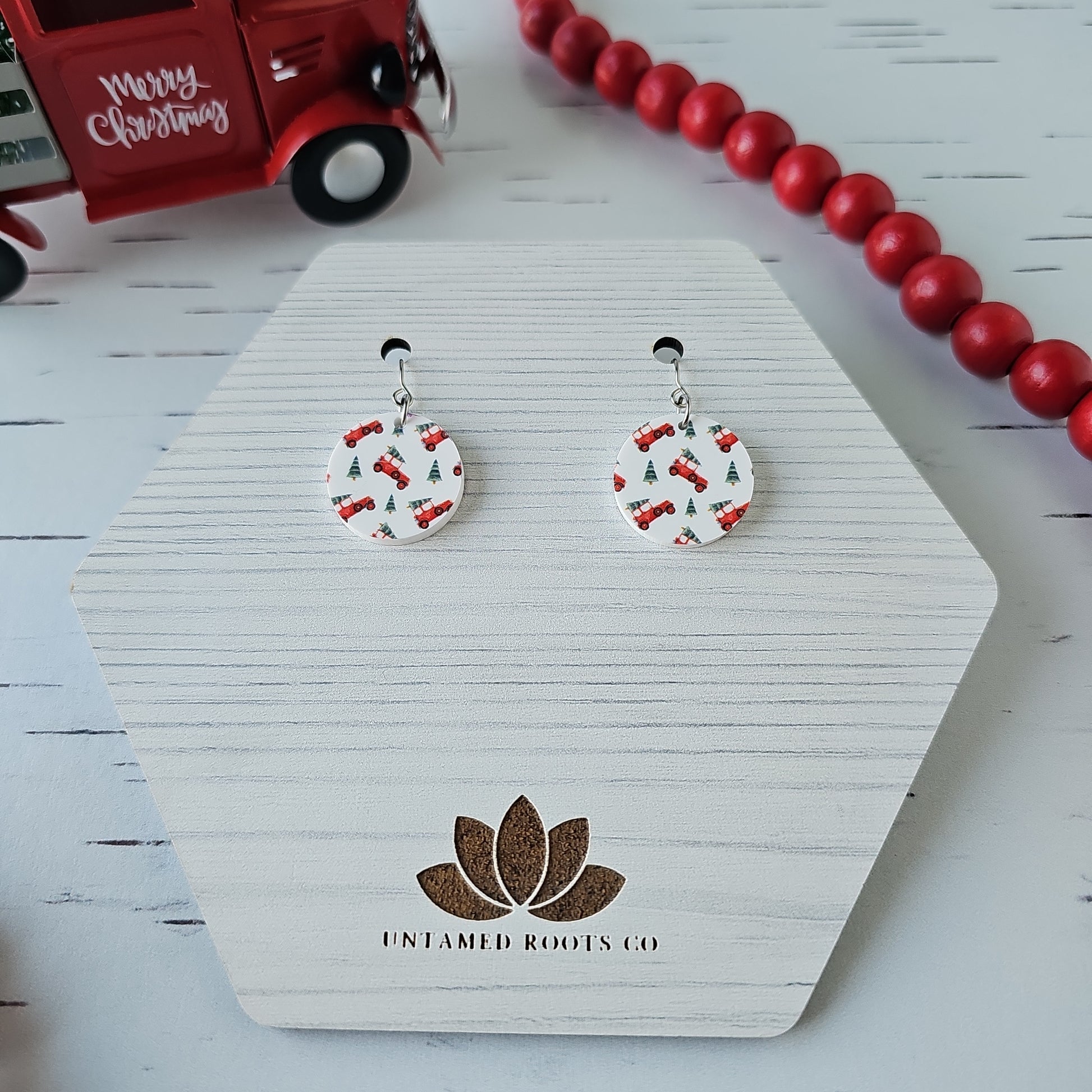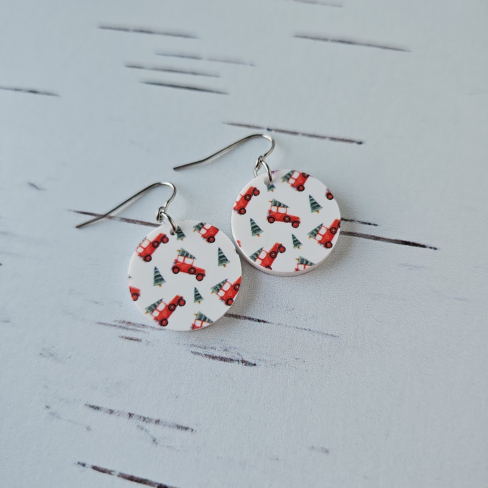 Available in 8 different sizes and shapes, these earrings feature a white acrylic with the classic red truck and christmas tree image.