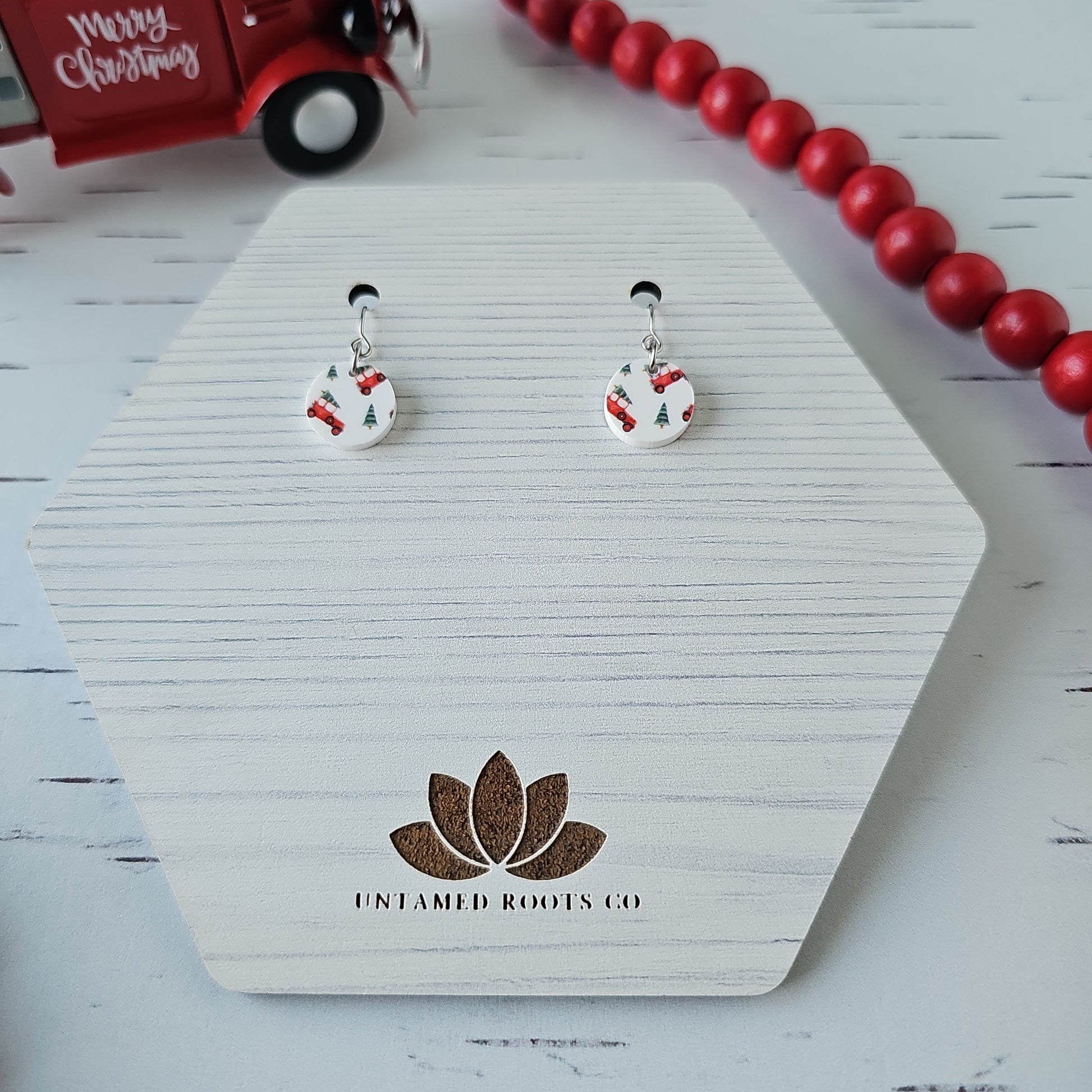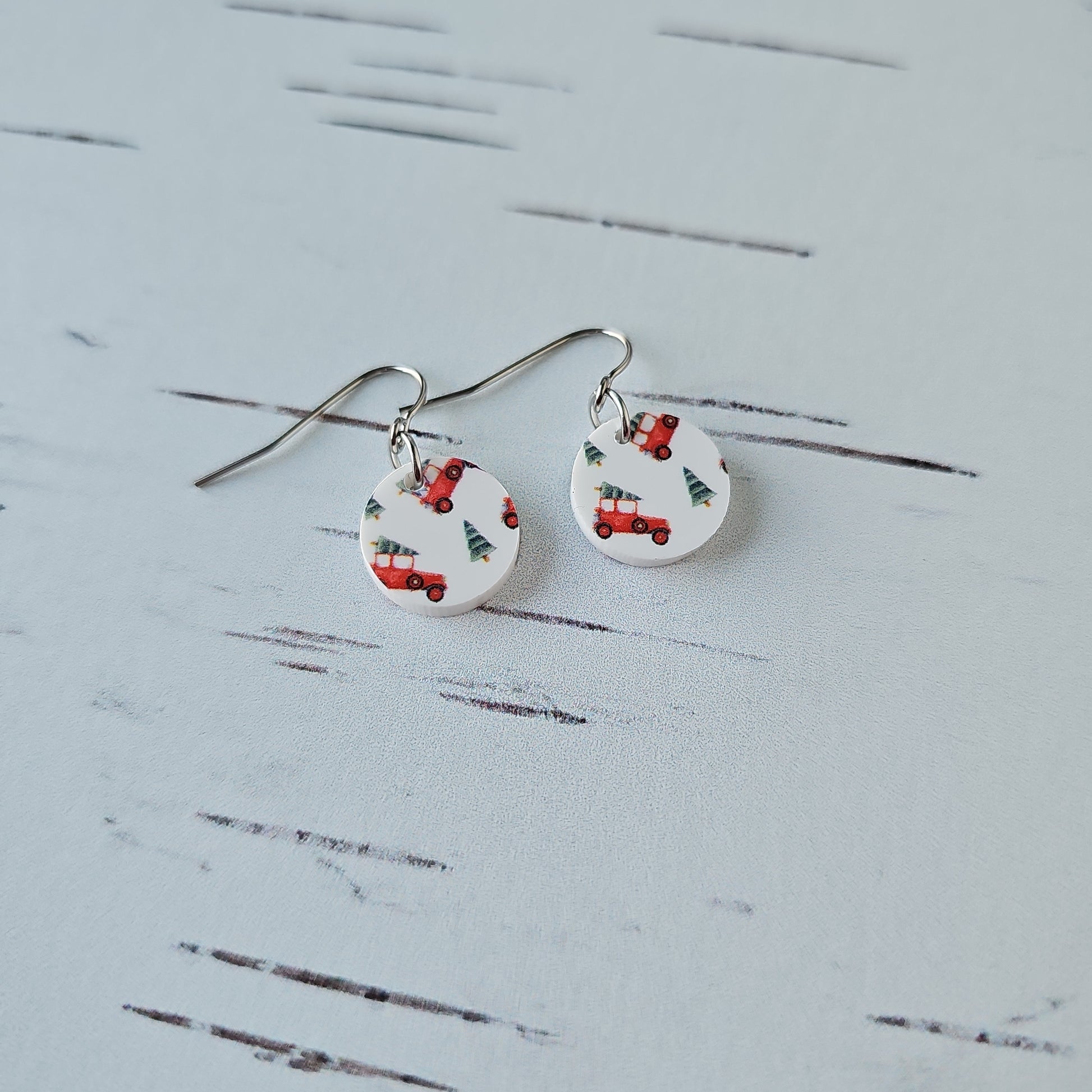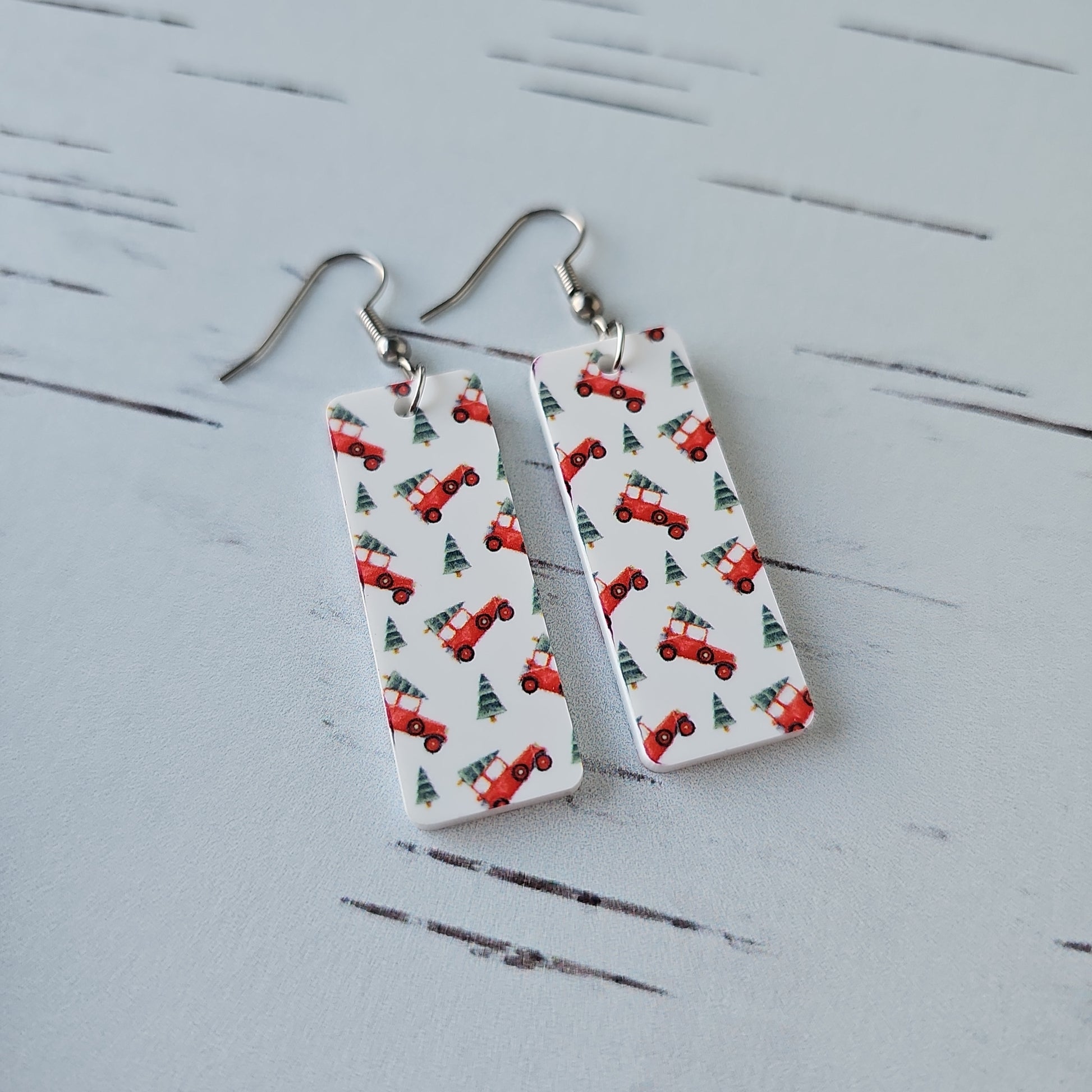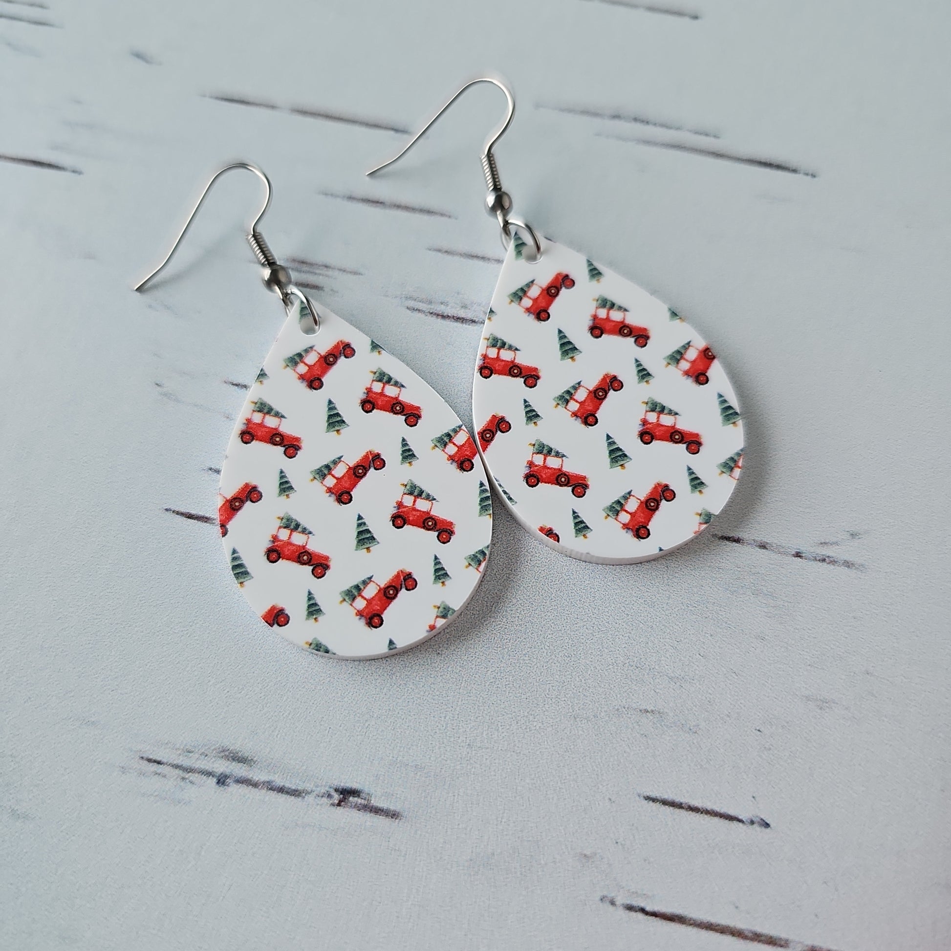 Available in 8 different sizes and shapes, these earrings feature a white acrylic with the classic red truck and christmas tree image.