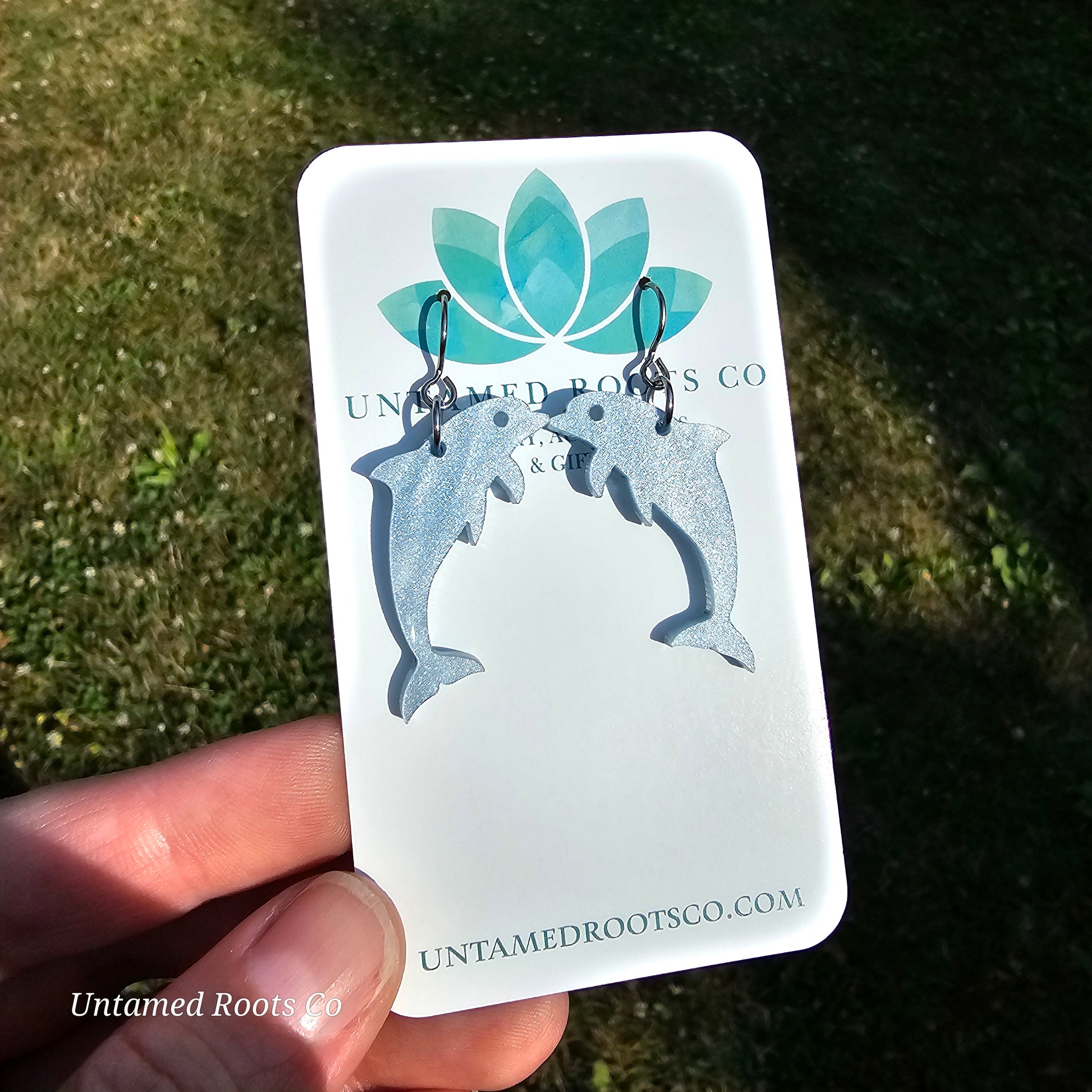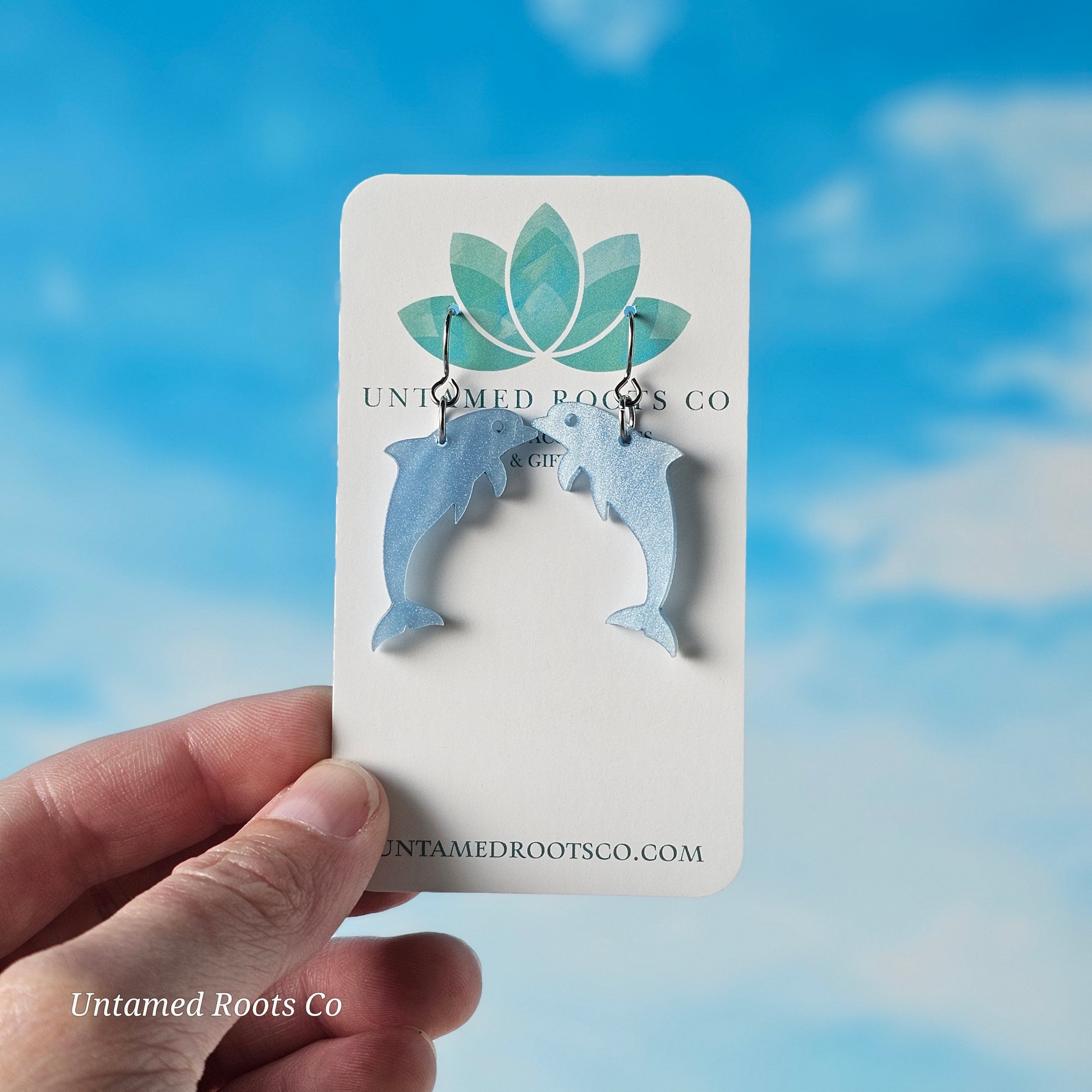 Add a touch of elegance with our Dolphin Earrings. Made with lightweight blue-gray pearl acrylic, these earrings have a beautiful shimmer effect. Hypoallergenic stainless steel earring wires make them suitable for those with sensitive ears.