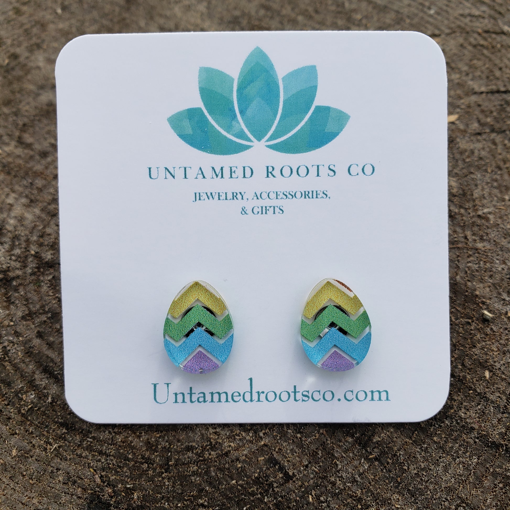 Sure to be an instant classic for Easter, these egg shaped earrings feature clear acrylic with pastel chevron stripes!