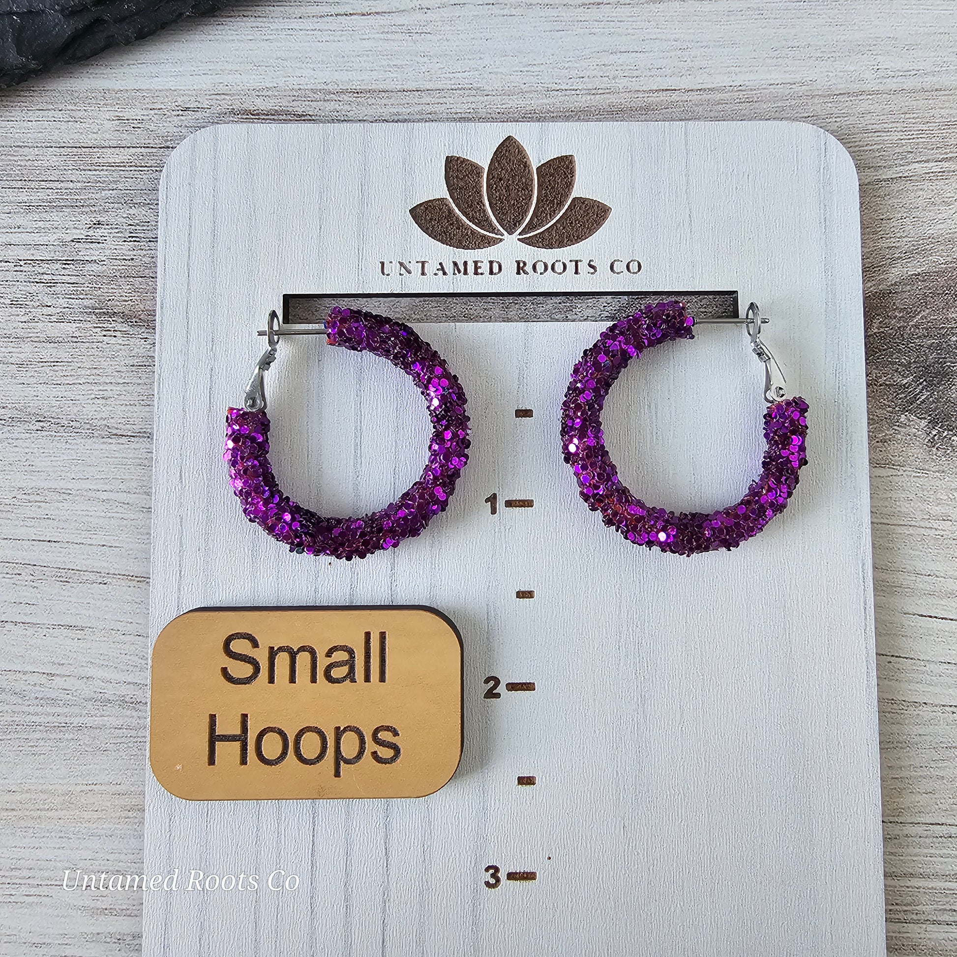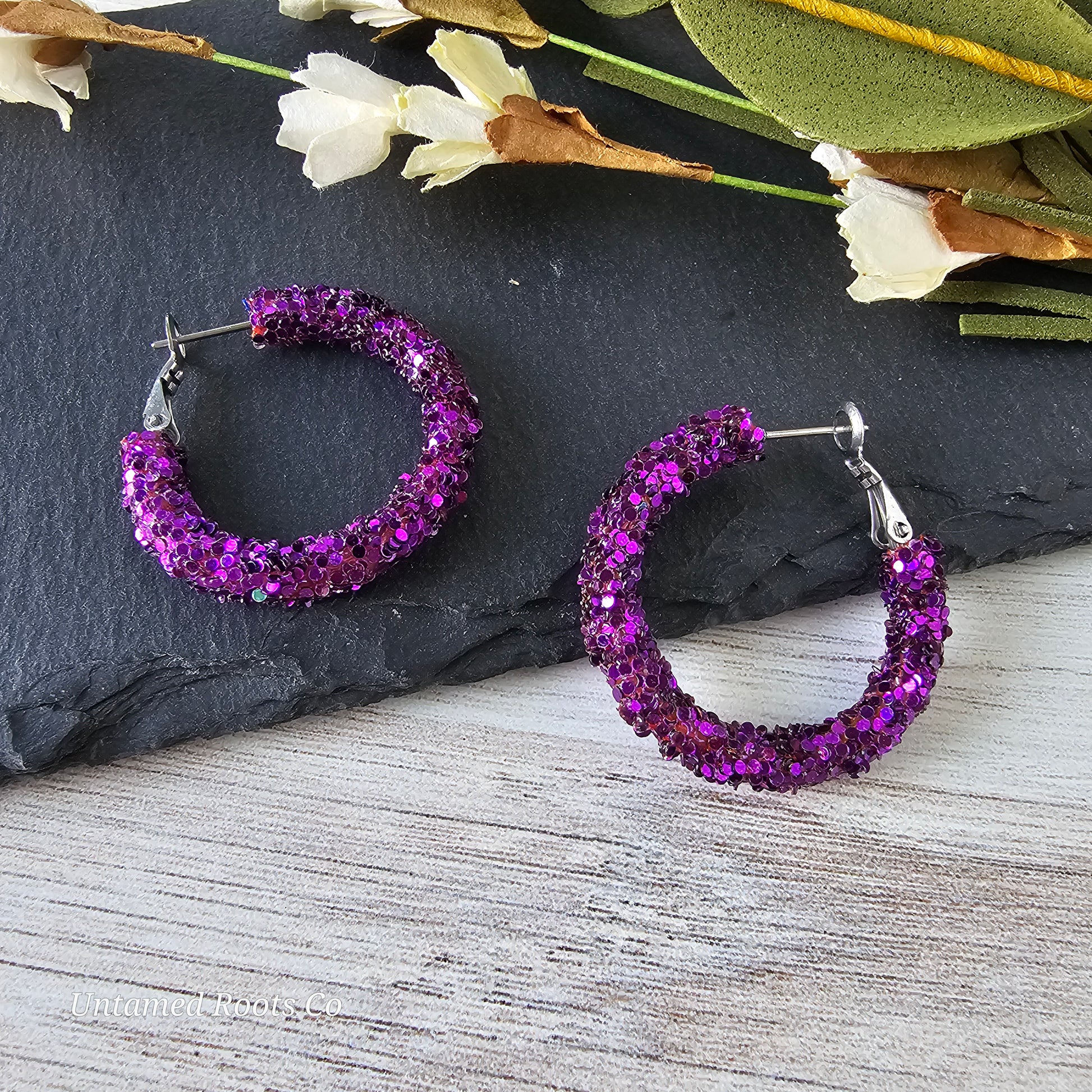 Our Eggplant Purple Glitter Hoops add a touch of sparkle to any outfit. Made with stainless steel, they're perfect for those with sensitive ears. The glitter is sealed, ensuring a mess-free and long-lasting shine.