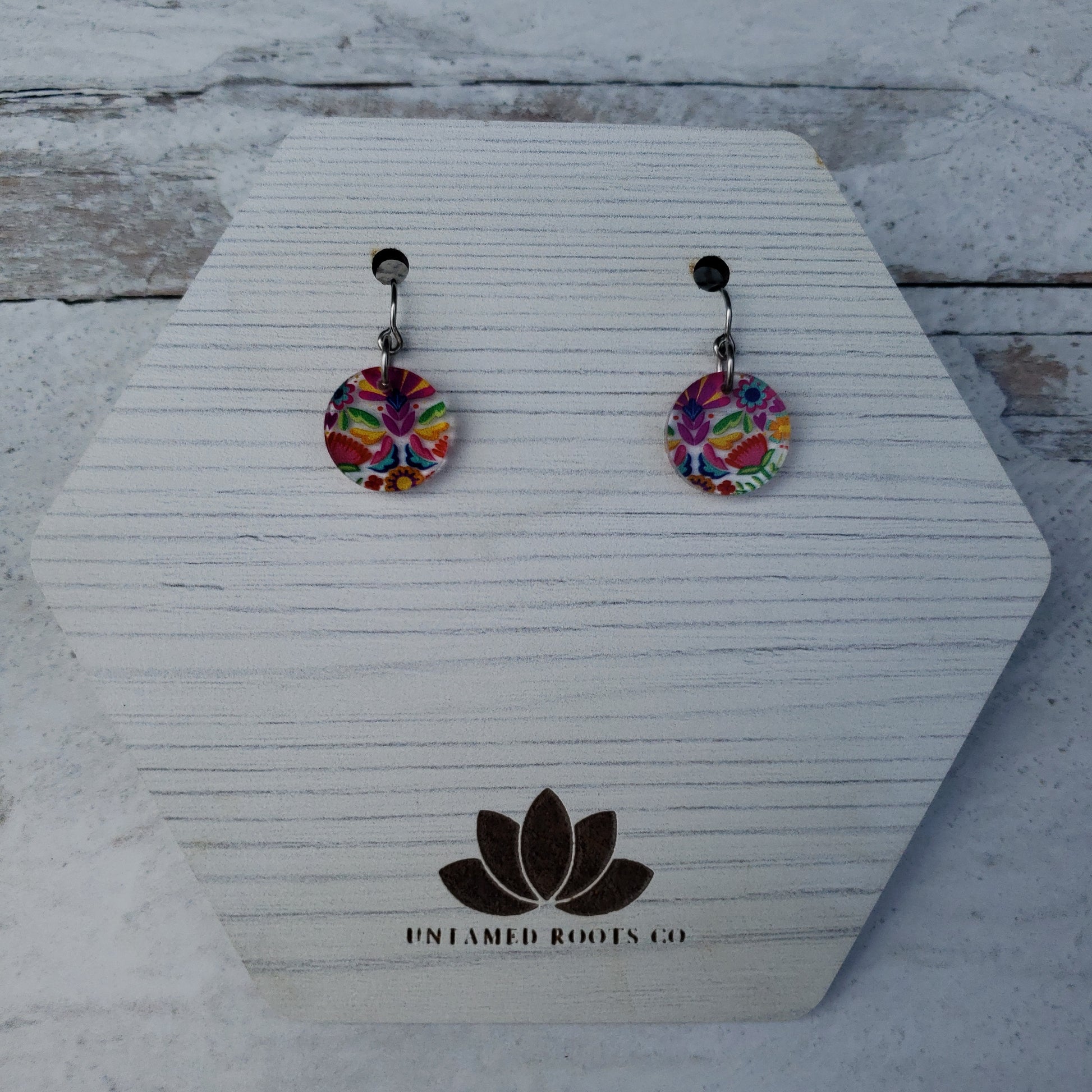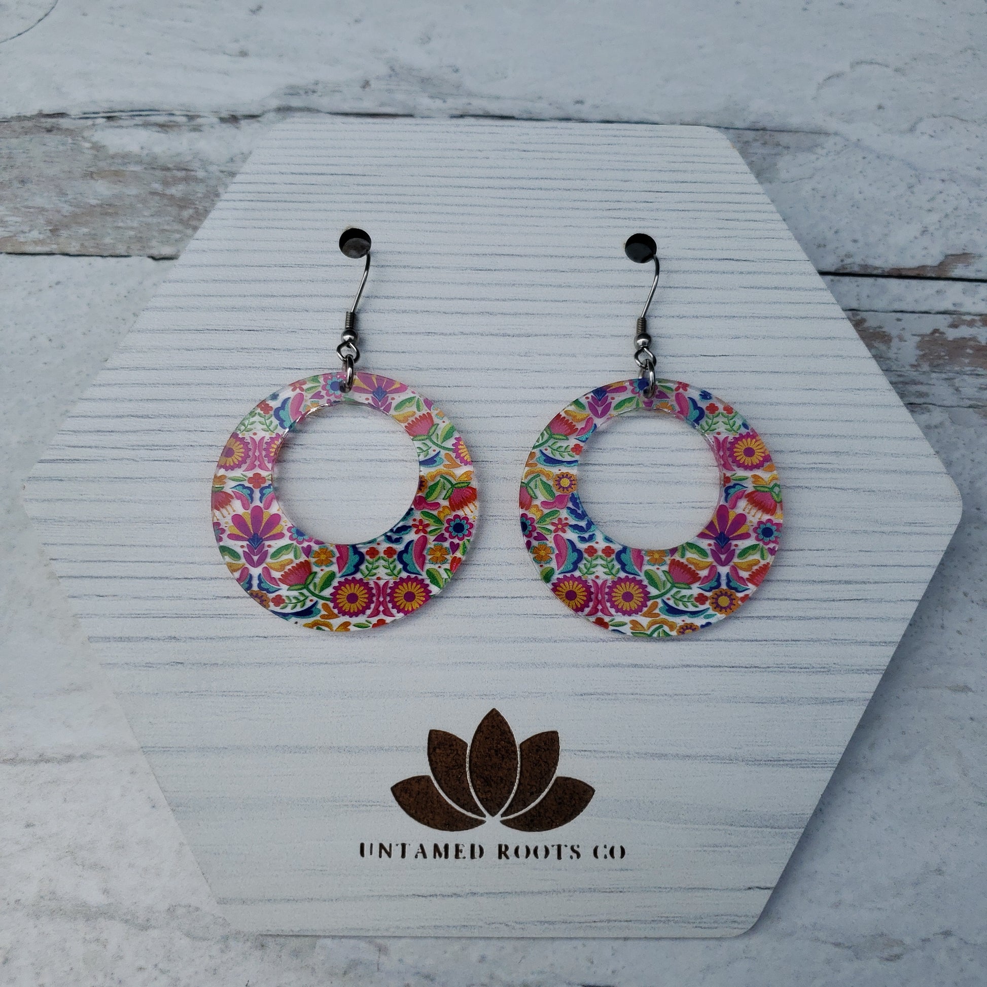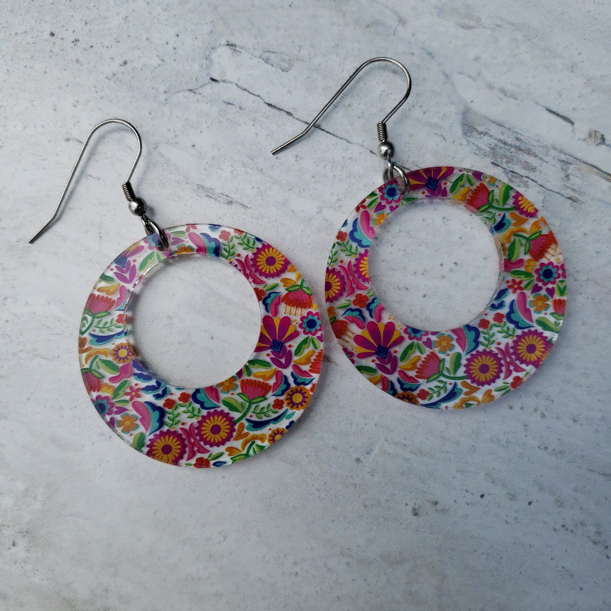 Available in 8 different sizes and shapes, these earrings feature a clear acrylic with a beautiful traditional Mexican floral print!