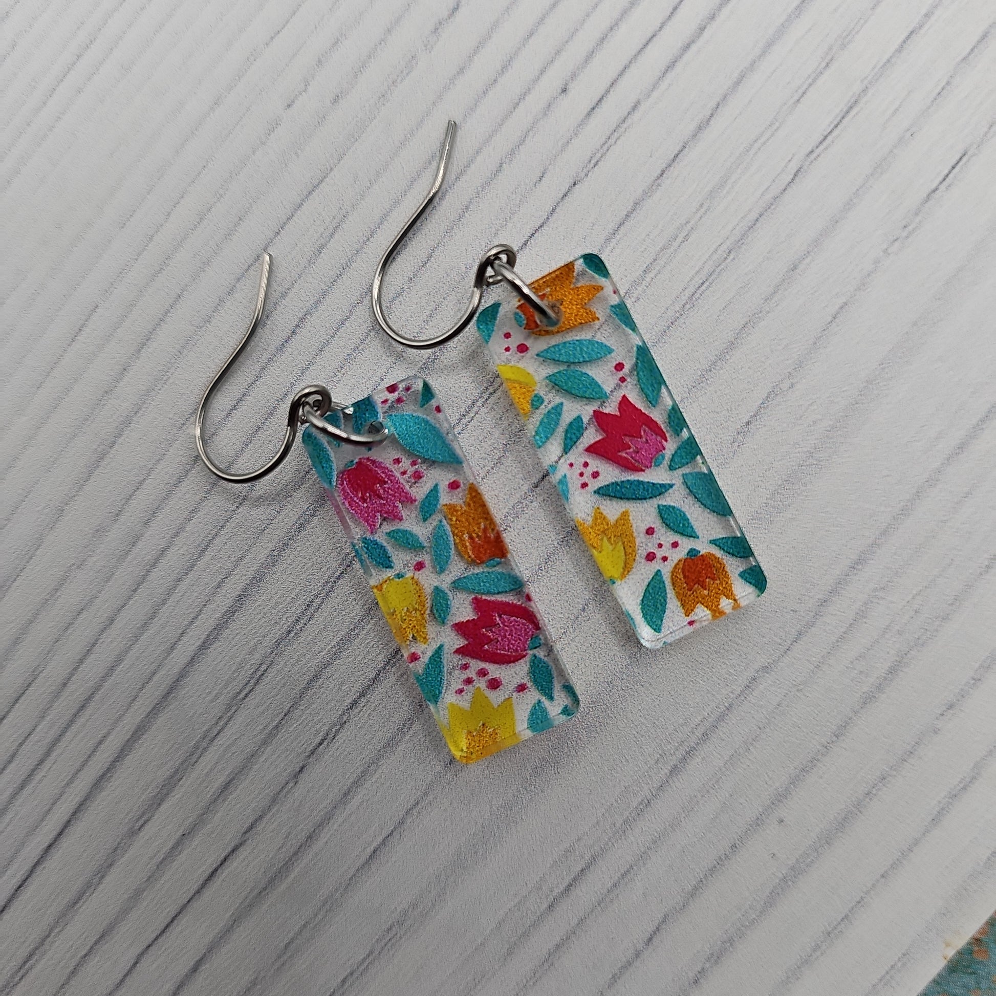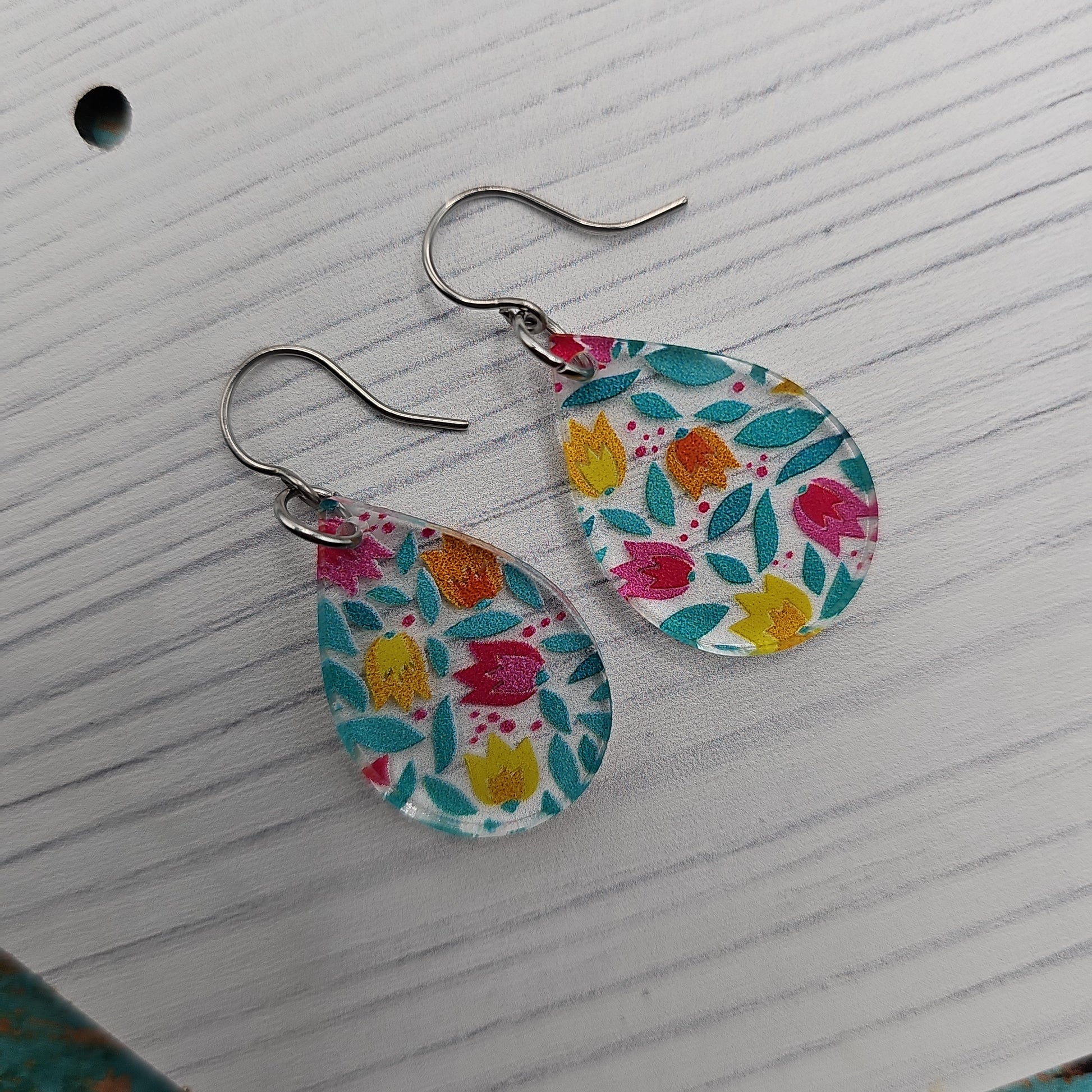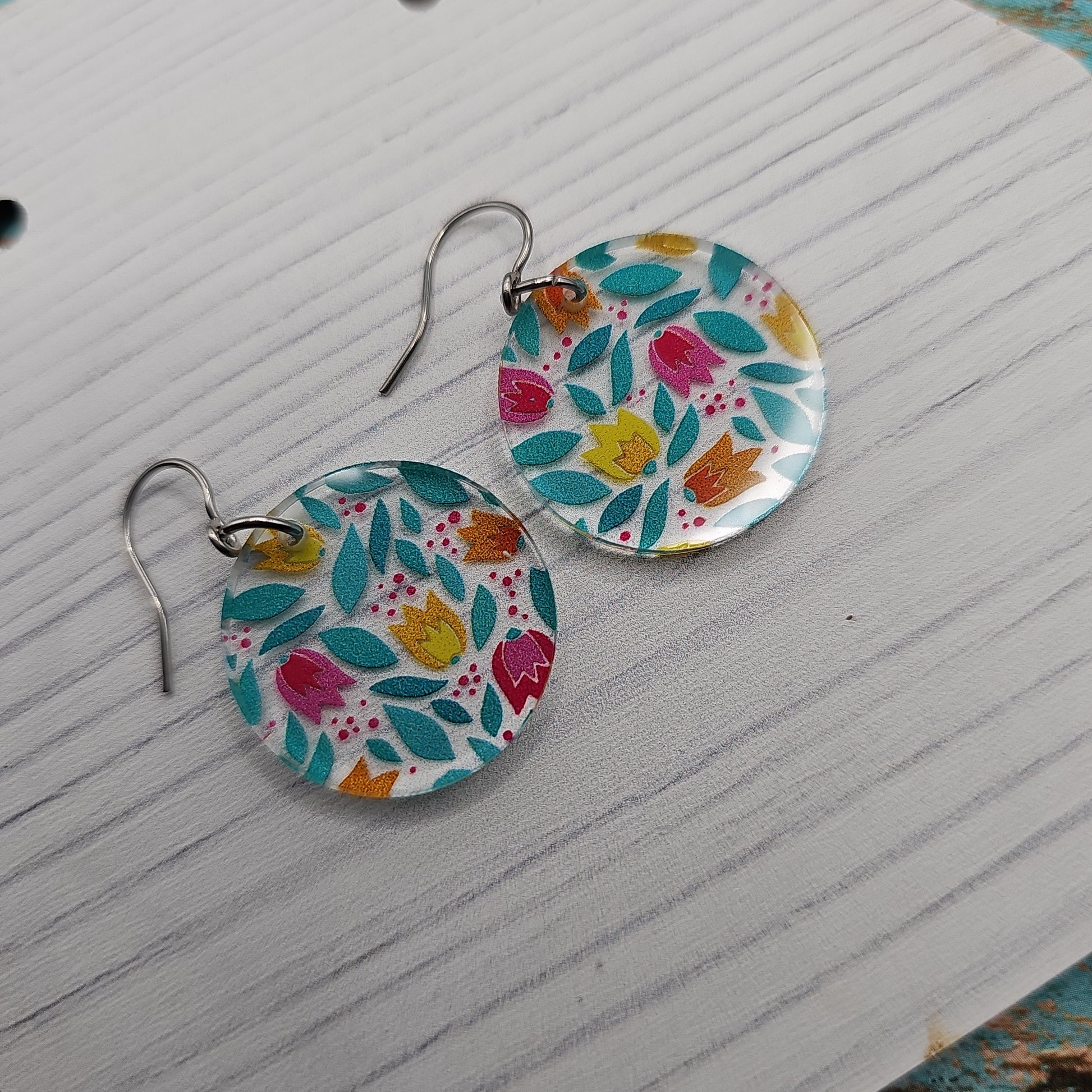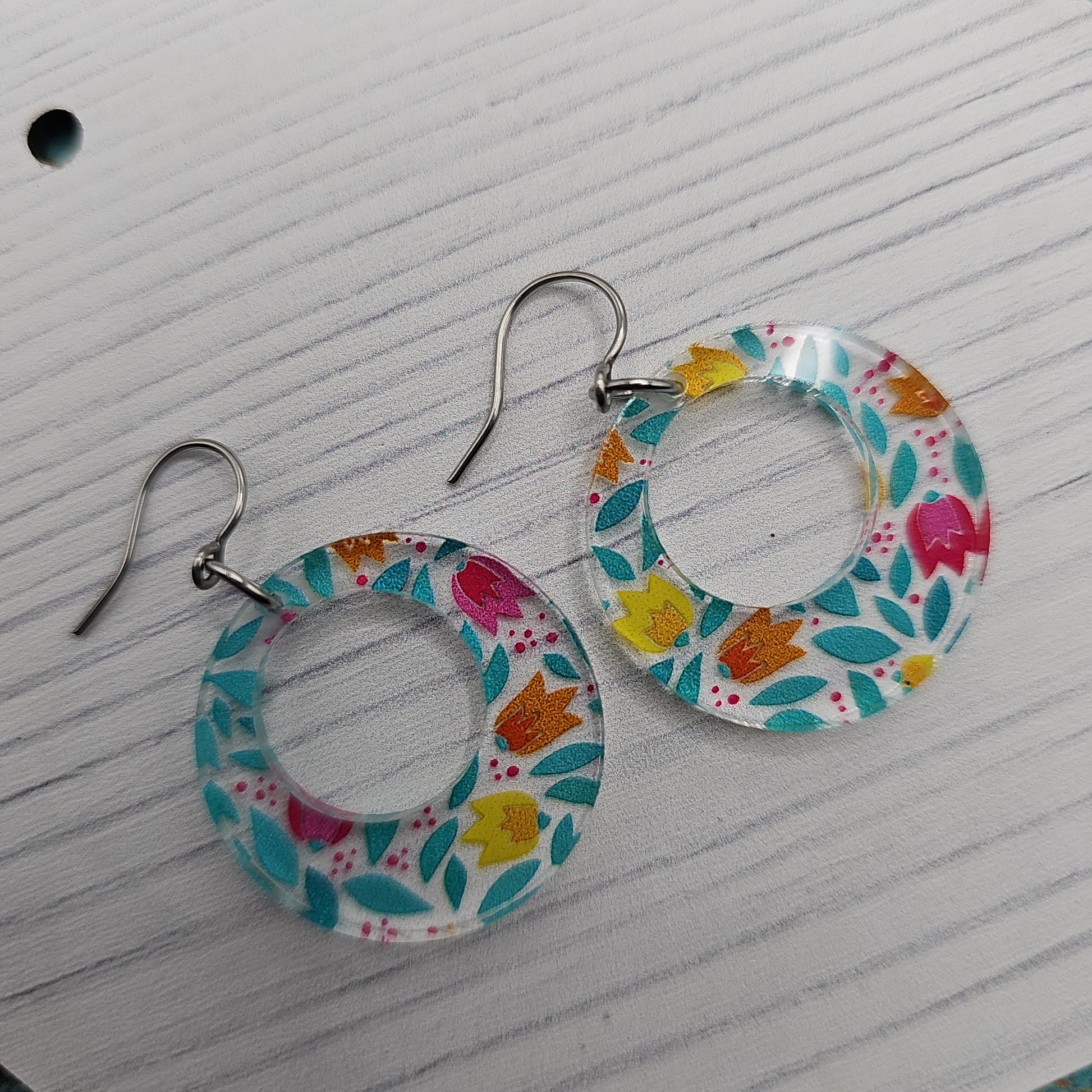 Available in 8 different sizes and shapes, these earrings feature a clear acrylic with a beautiful tulip print!