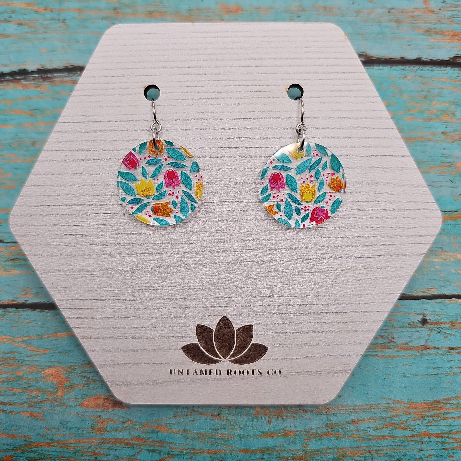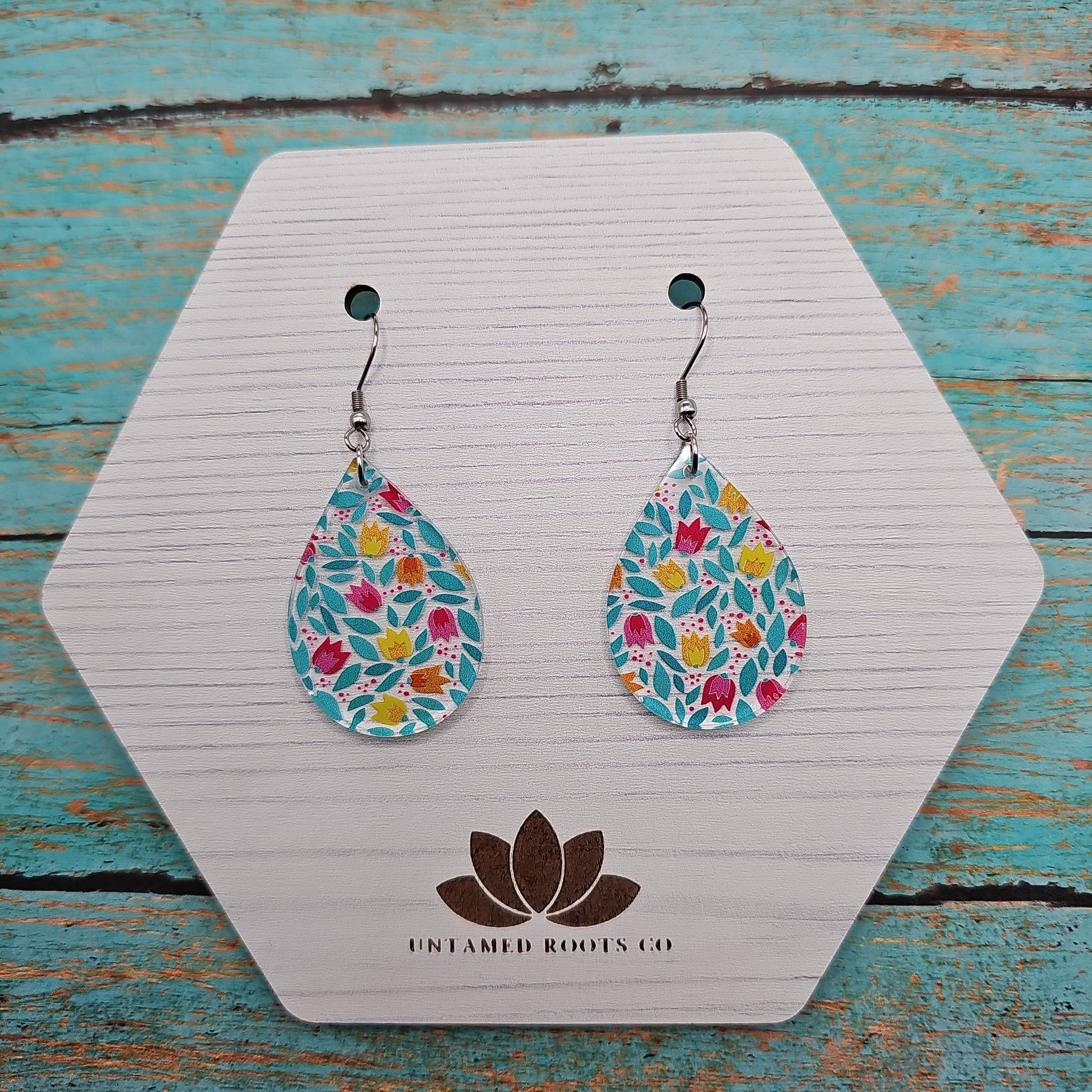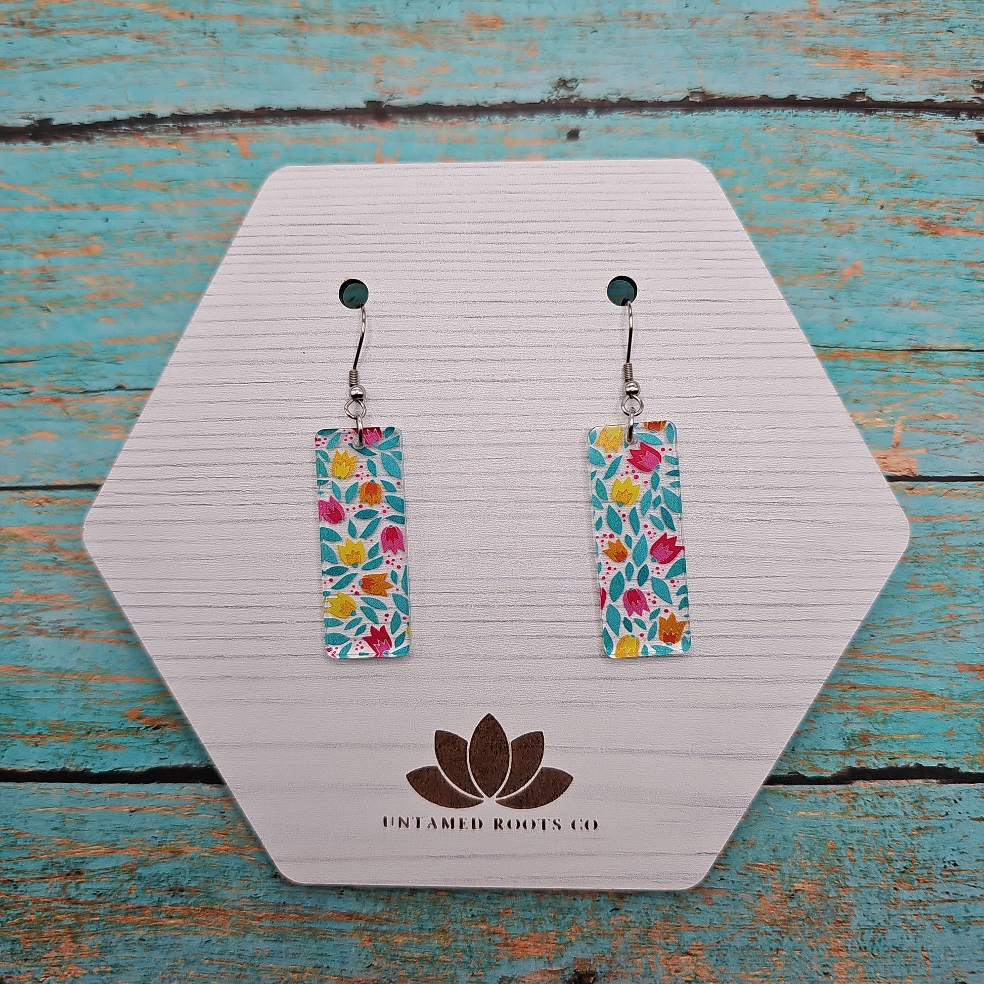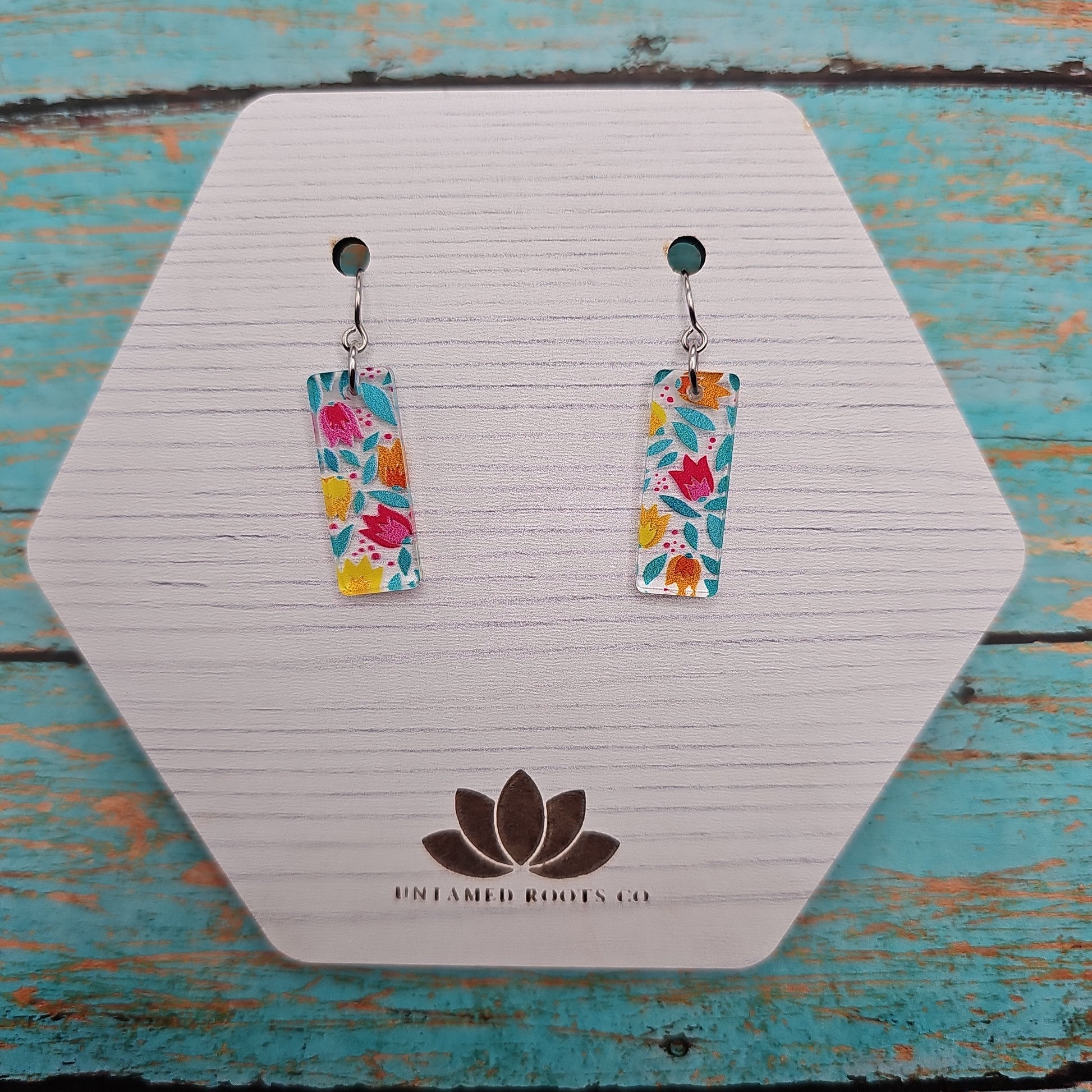 Available in 8 different sizes and shapes, these earrings feature a clear acrylic with a beautiful tulip print!