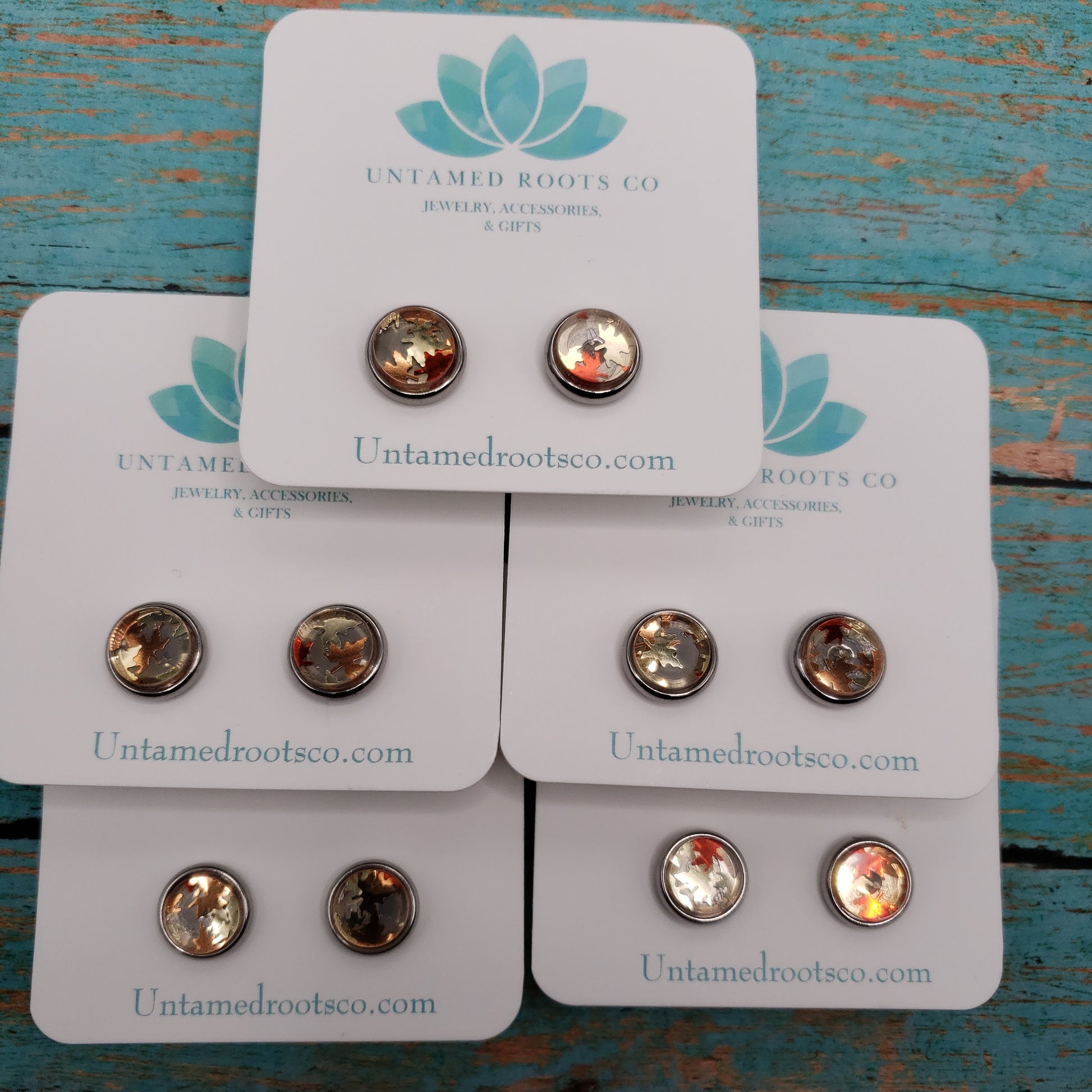 Golden Falling Leaf Print inside stainless steel bezel stud earrings.