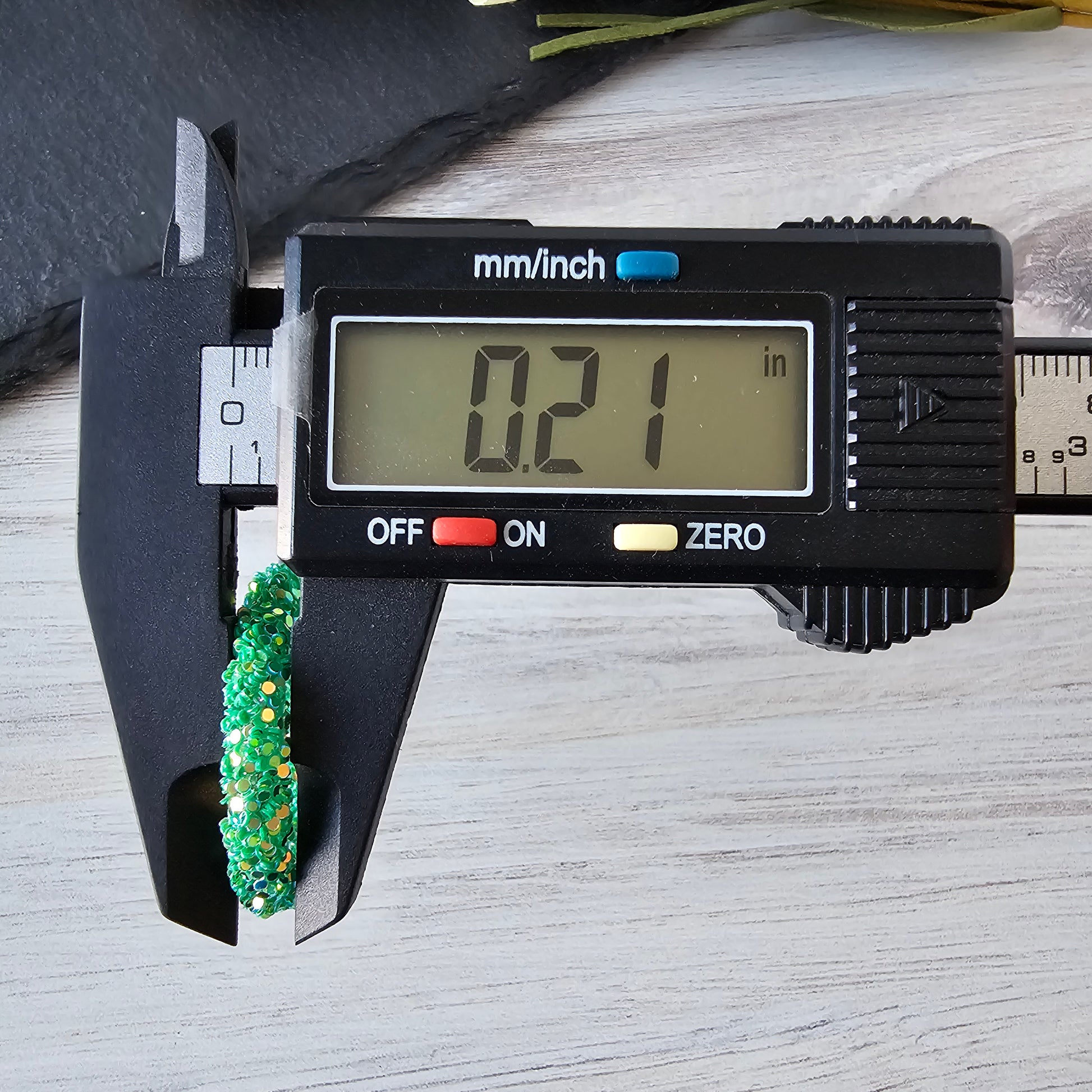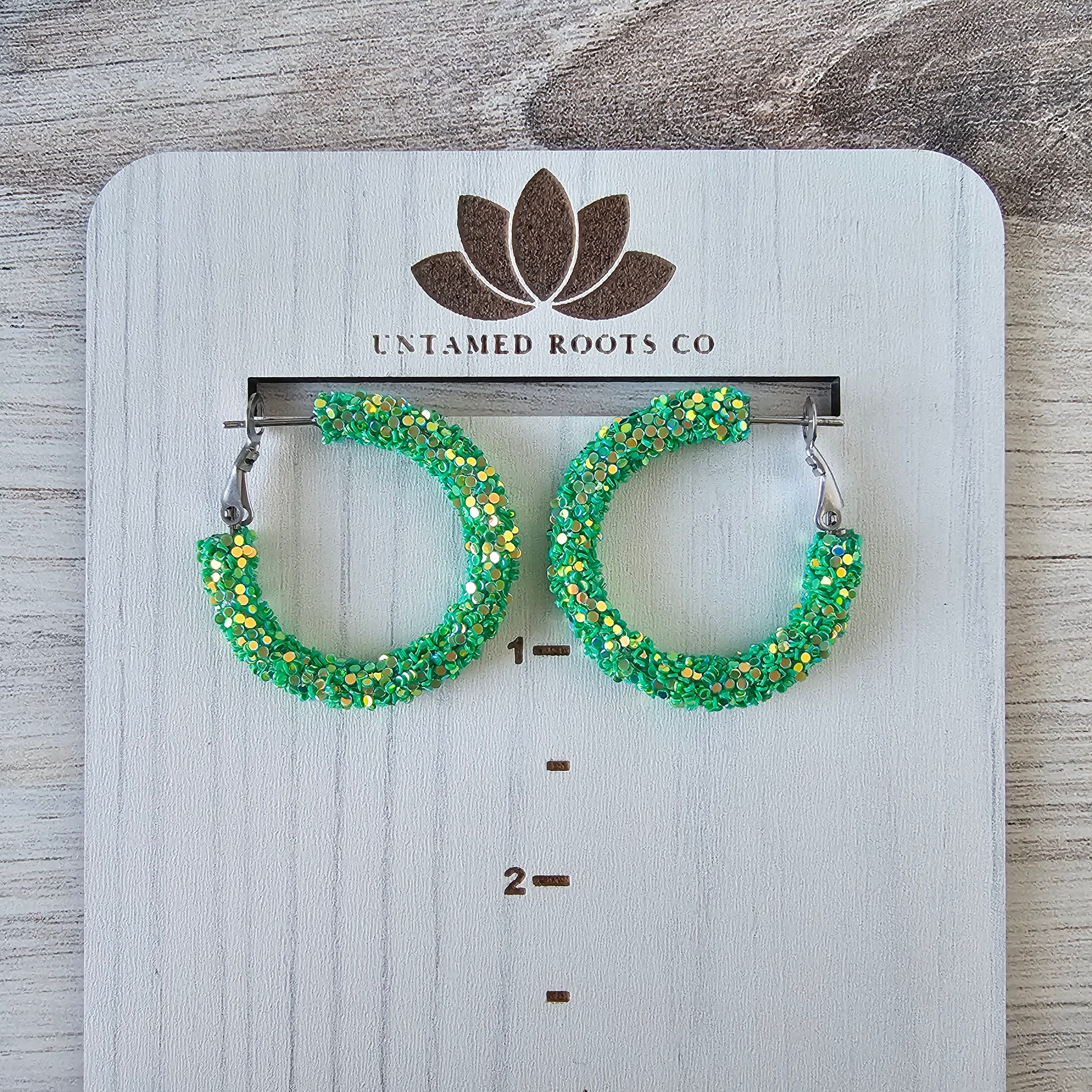 Add a little sparkle to your wardrobe with these beautiful green glitter hoops! Made with bright green iridescent glitter (shifts to gold tones) and hypoallergenic stainless steel hoops for sensitive ears. Glitter is sealed to ensure no mess and no color fade!
