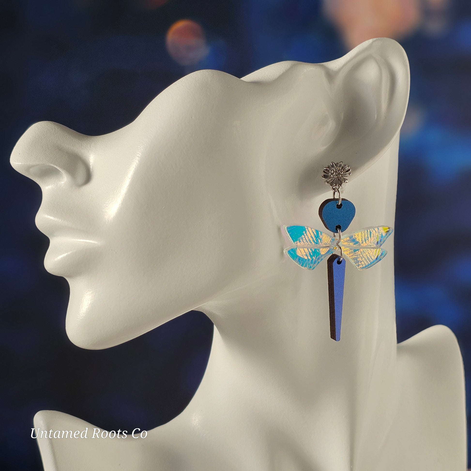 -Wings are made from textured iridescent acrylic.