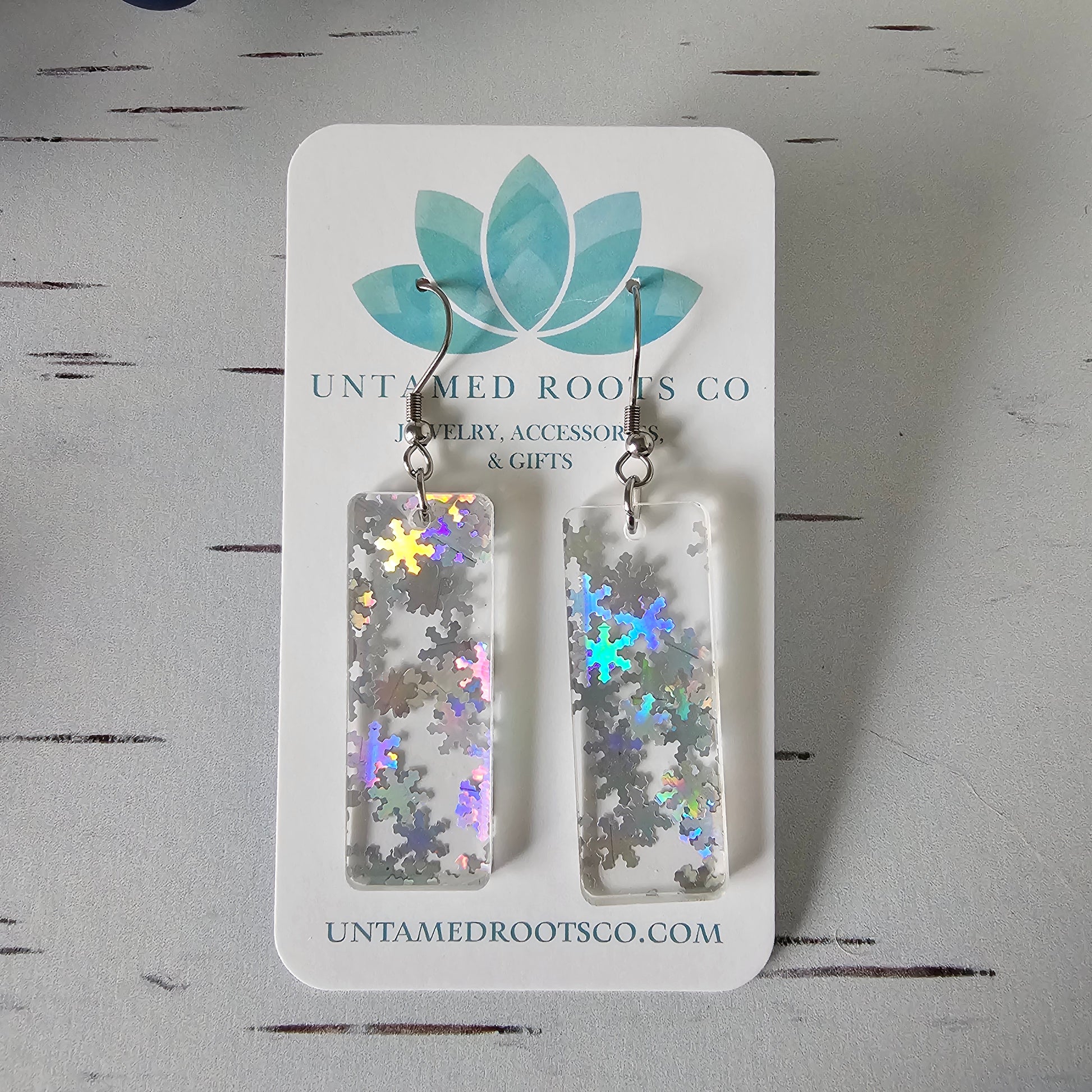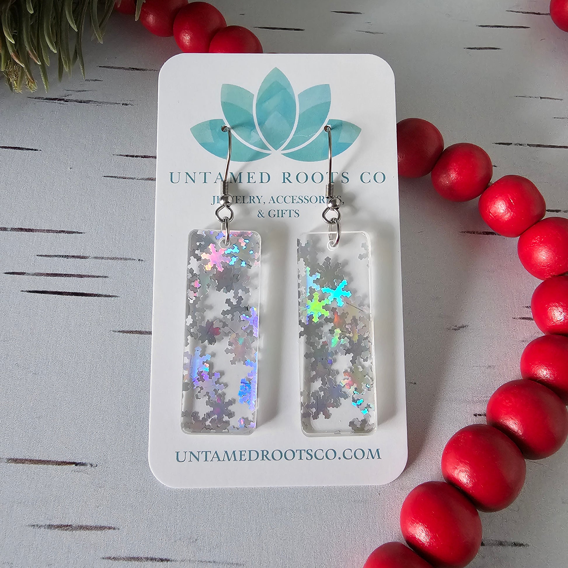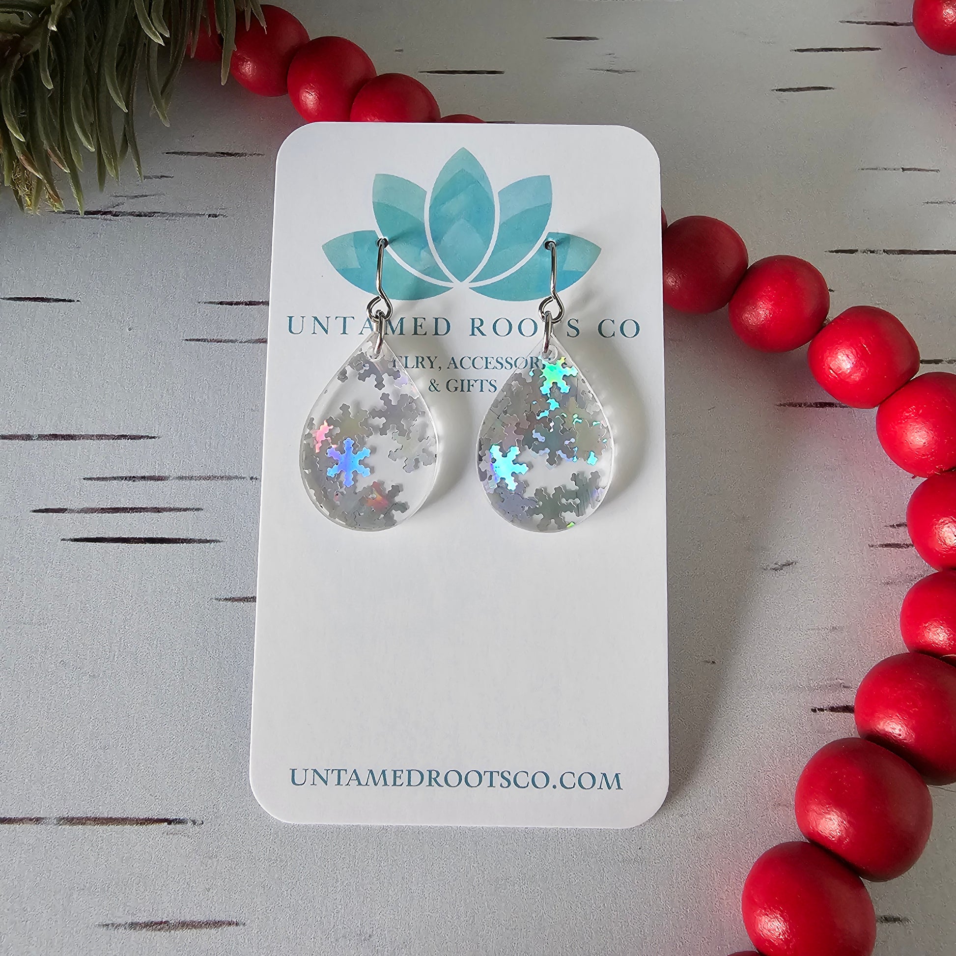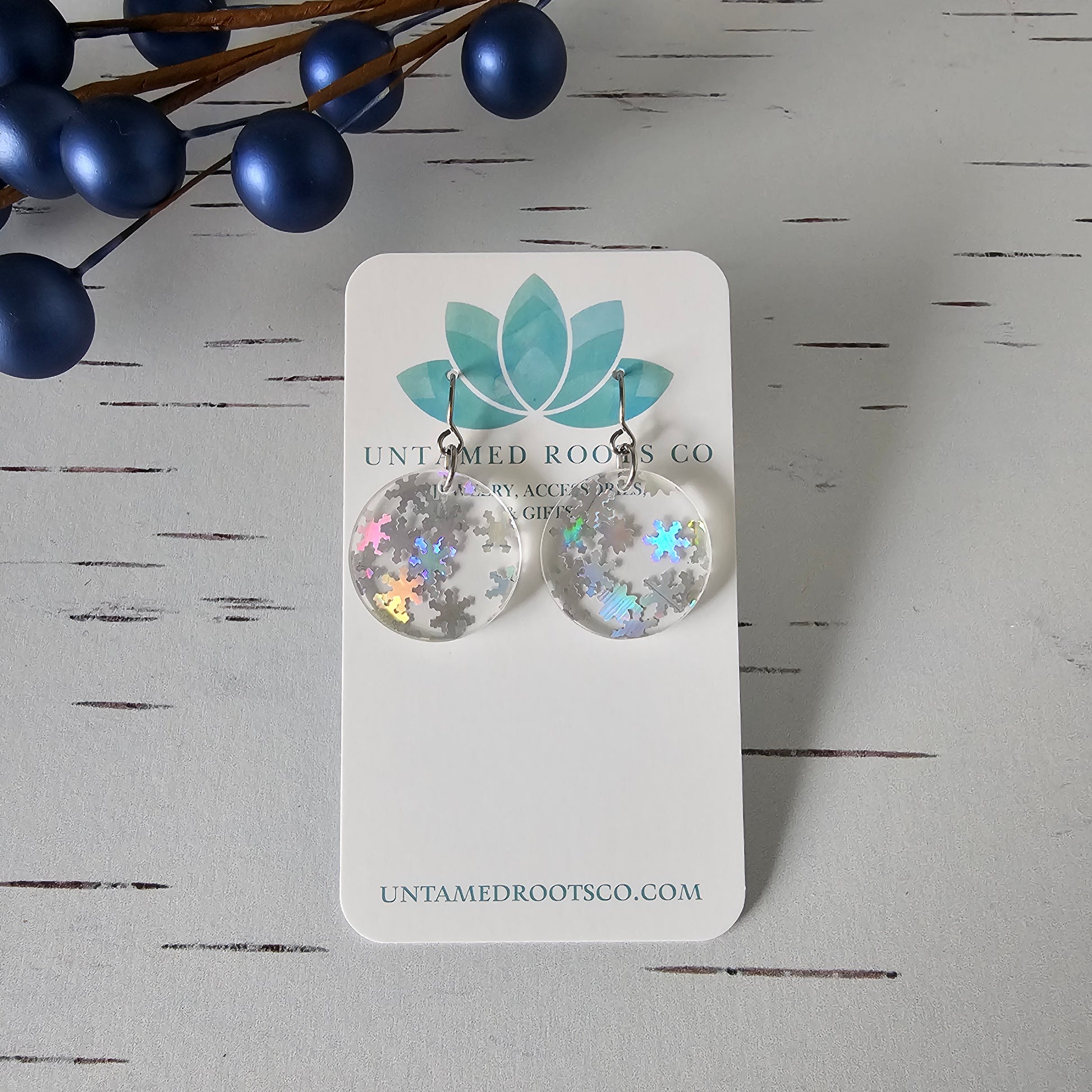 Available in 8 different sizes and shapes, these earrings feature a clear acrylic with beautiful iridescent snowflakes embedded in the material for ultimate sparkle and shine!
