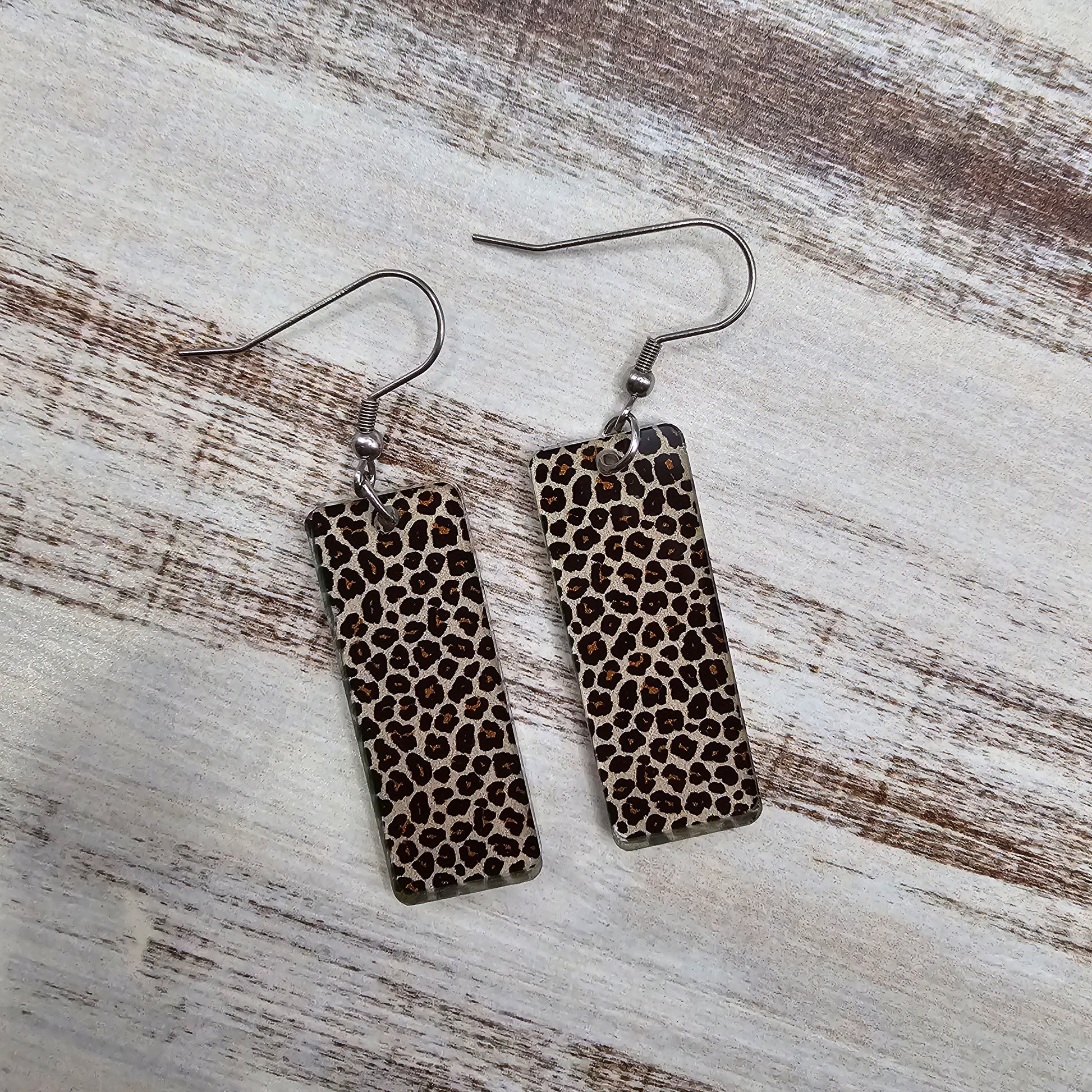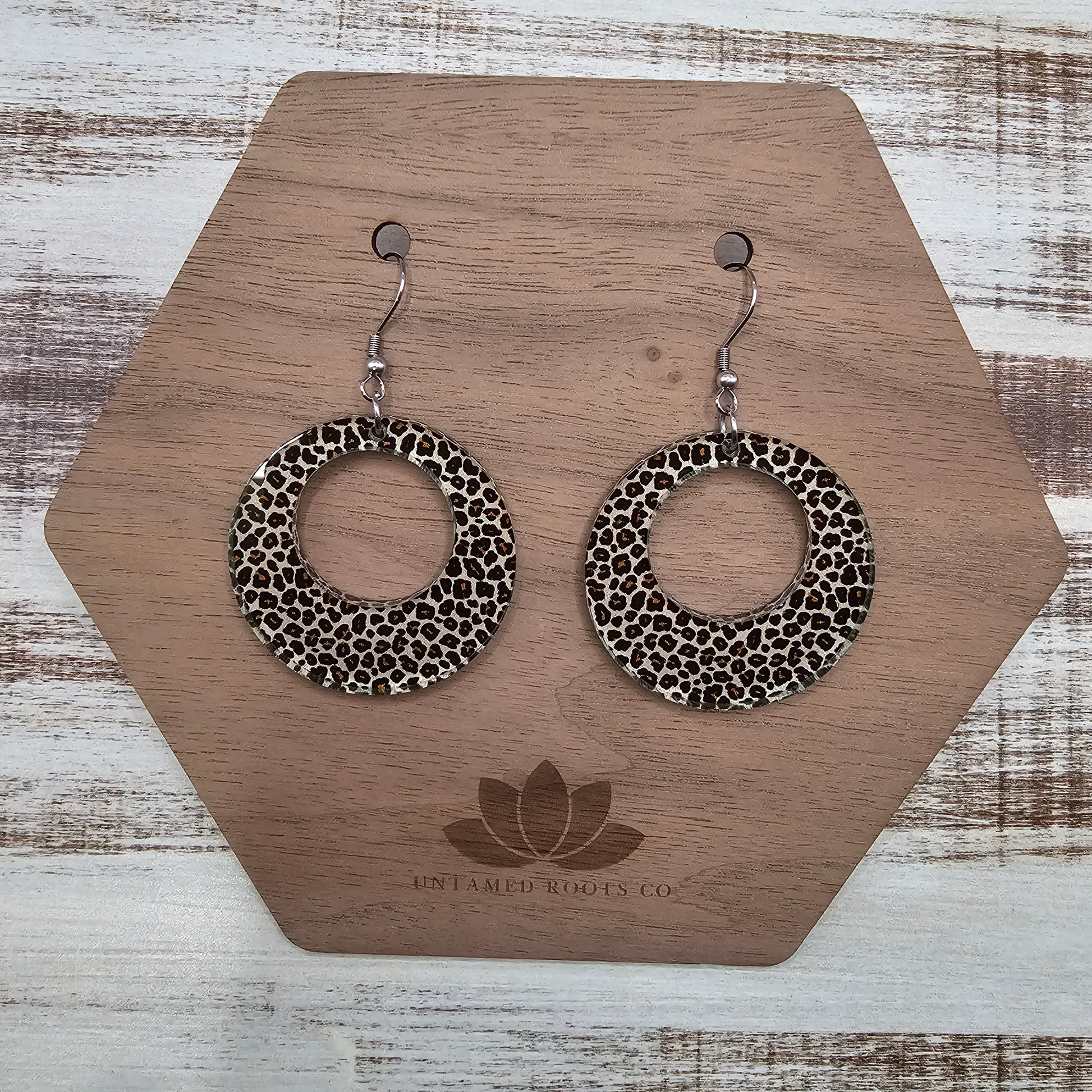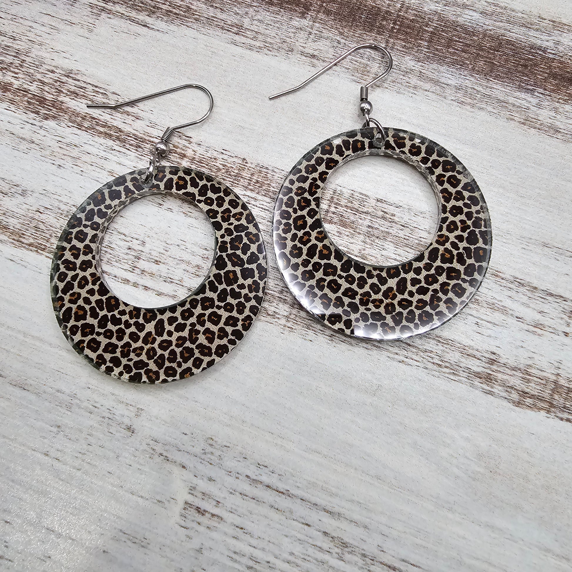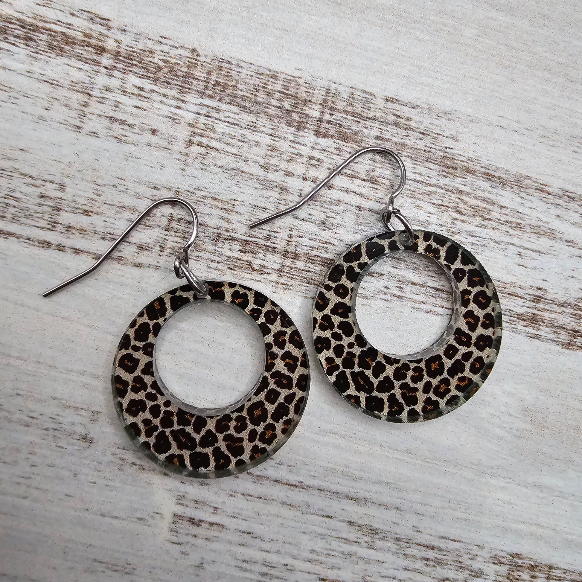 Add some fierce style to your look with the Leopard Print Earrings. Choose from 8 different sizes and shapes, all featuring clear acrylic with tiny leopard print for a subtle yet striking look.