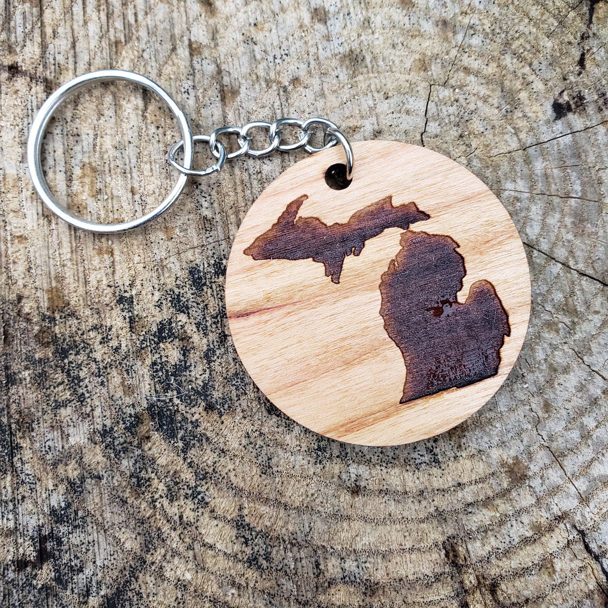 This handsomely crafted Michigan keychain is made from all-natural maple wood and laser engraved with the Michigan state silhouette. Its sturdy construction measures 1.75 inches, making it a perfect accessory for any set of keys.