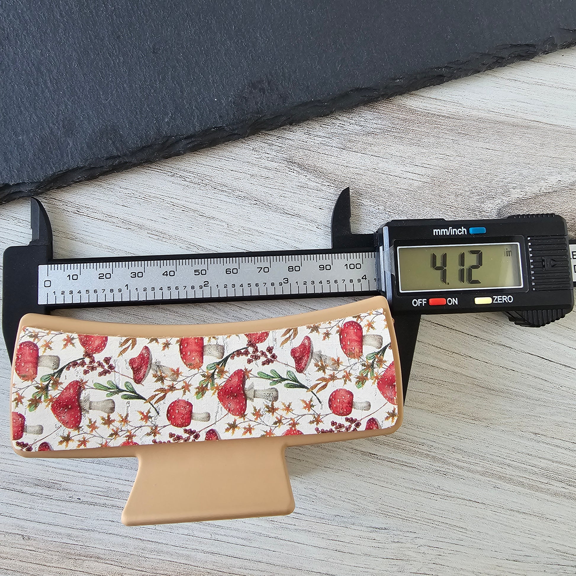 Get a grip on your style with our Mushroom Claw Clip! Made with printed cork on genuine leather, this limited edition clip is secured to a classic claw design. At 4.1 inches long, it's the perfect size for holding your hair in place while adding a touch of whimsy.
