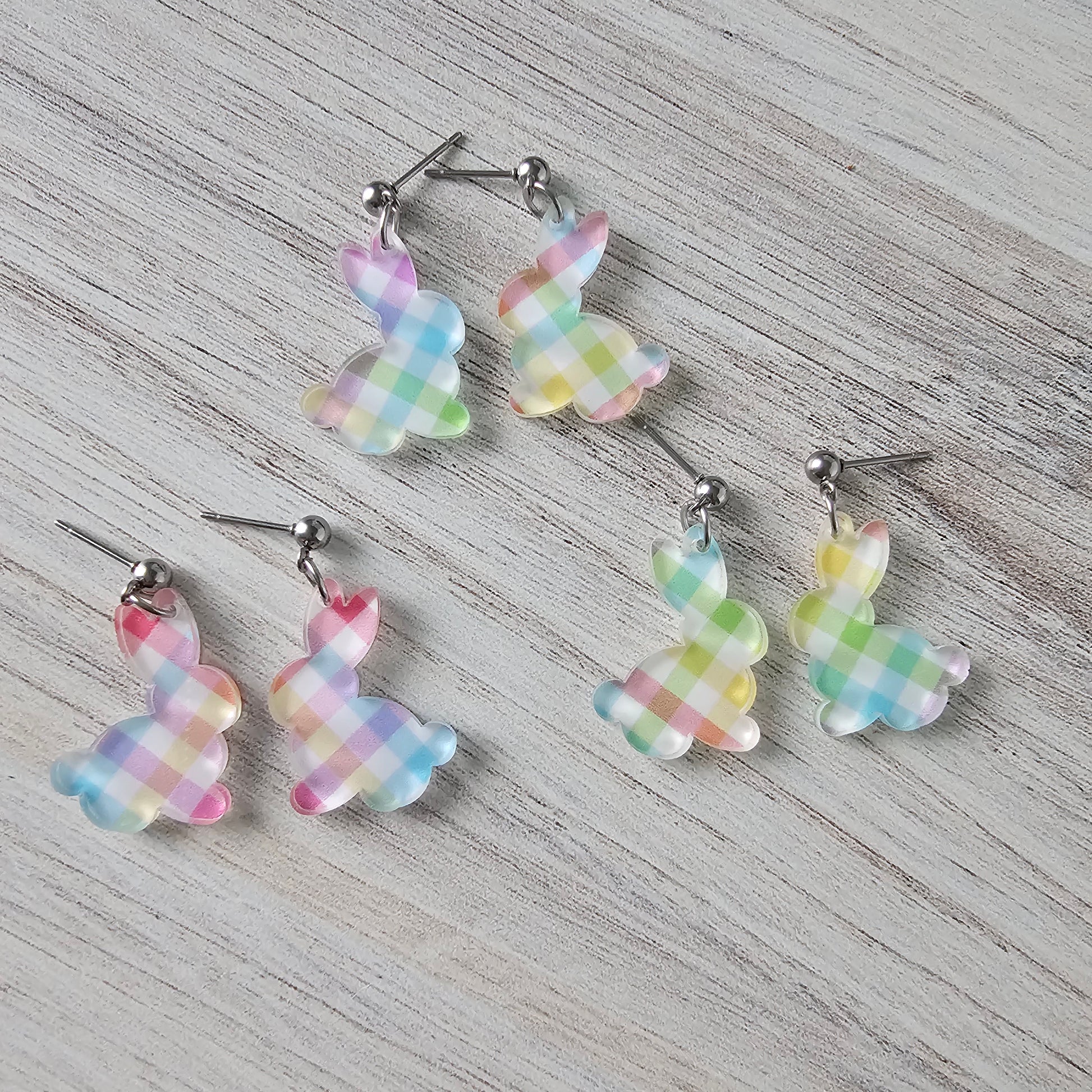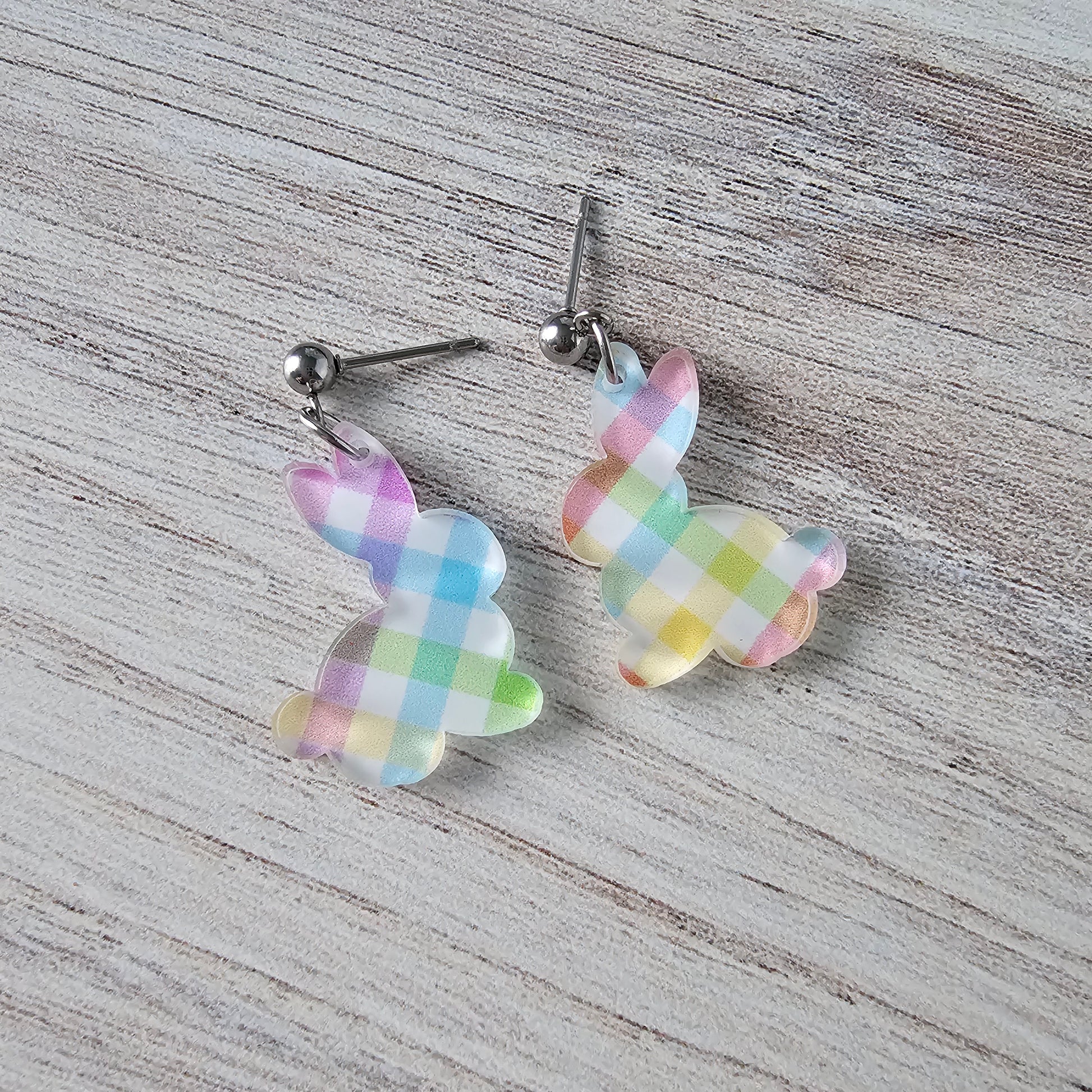 Make a statement with these Pastel Plaid Bunny Earrings! The cute bunny silhouette and vibrant pastel plaid design add a touch of playfulness to any outfit. The ball stud earring creates a classic and comfortable fit. Perfect for anyone looking to add a fun and unique touch to their style! Posts are hypoallergenic stainless steel for sensitive ears.