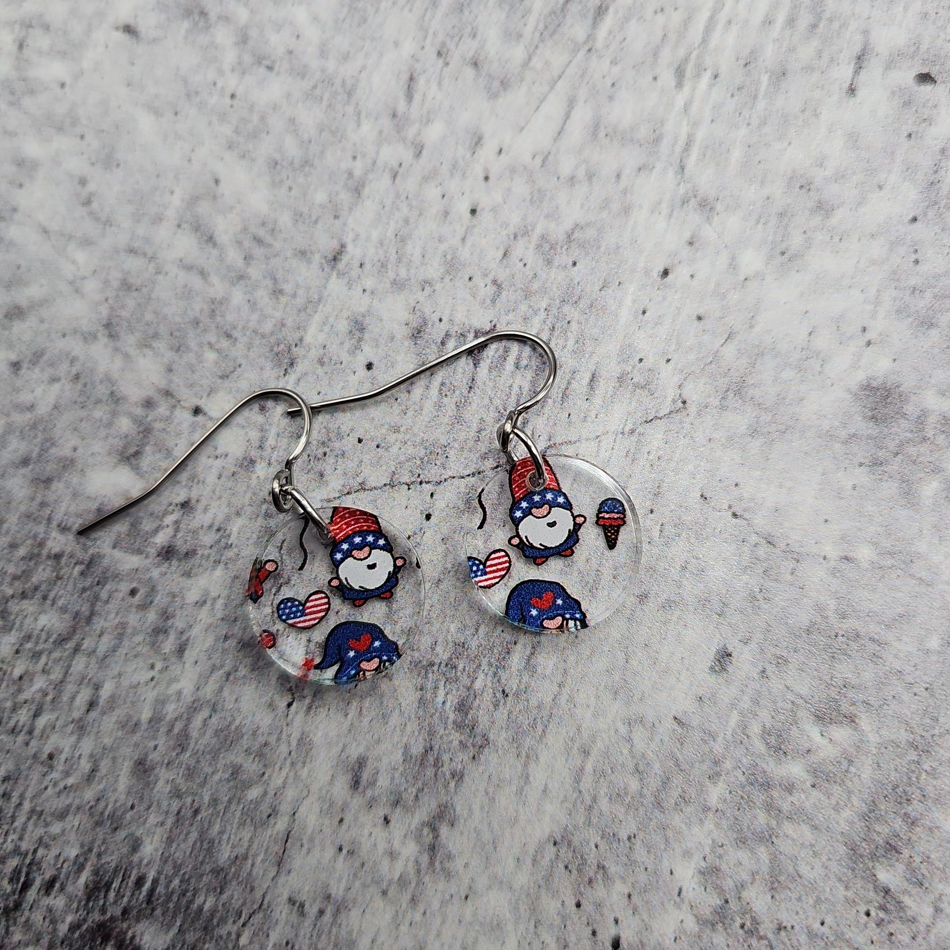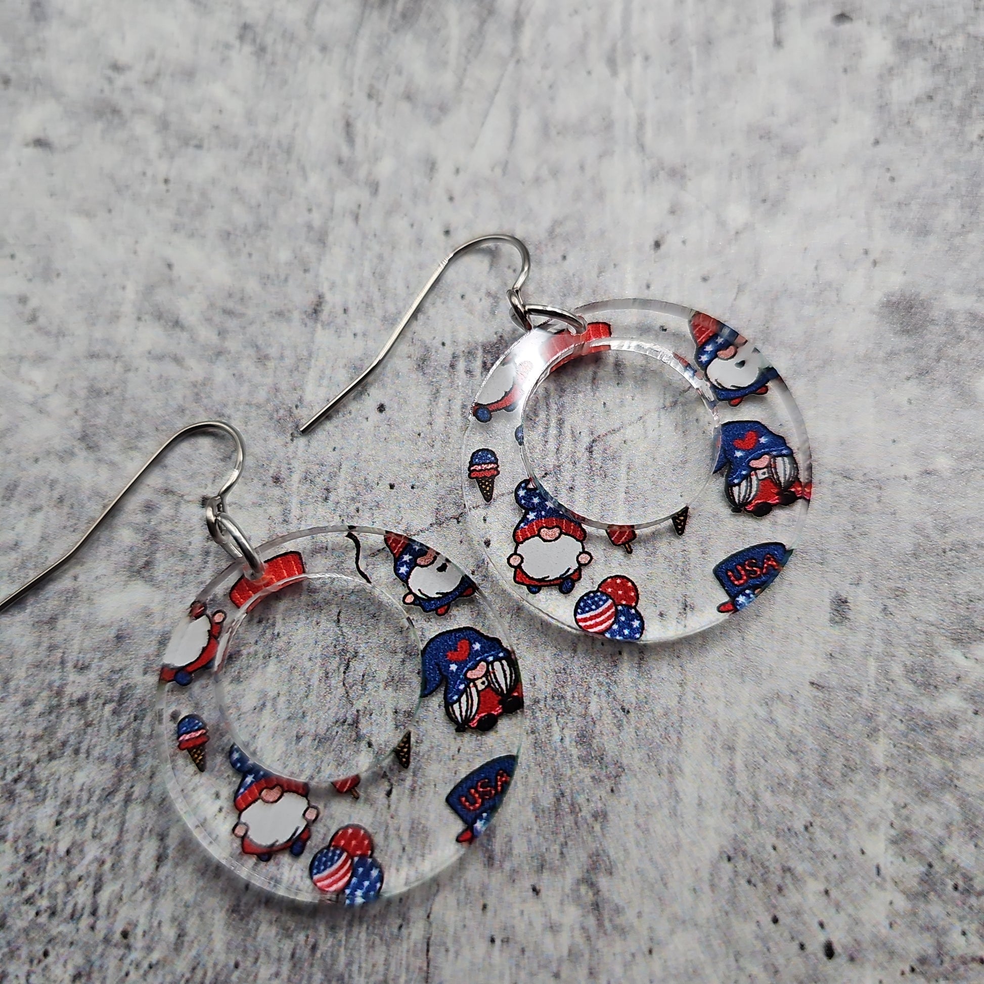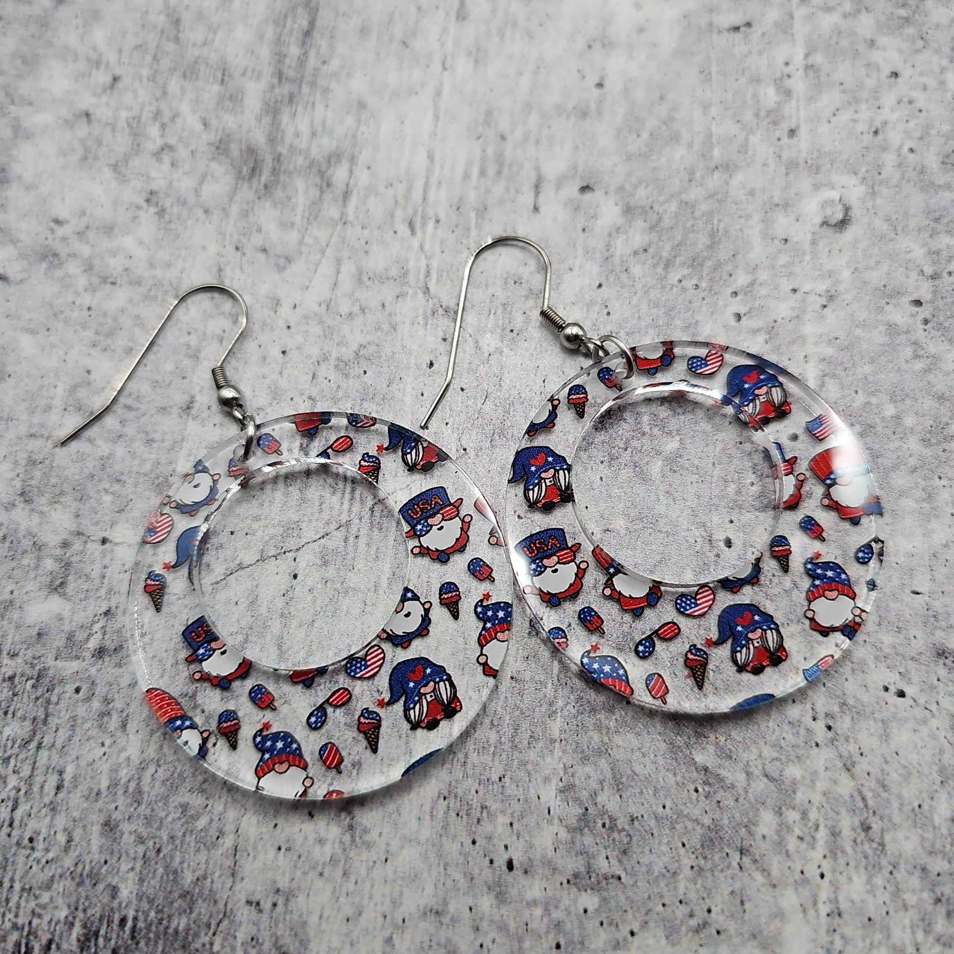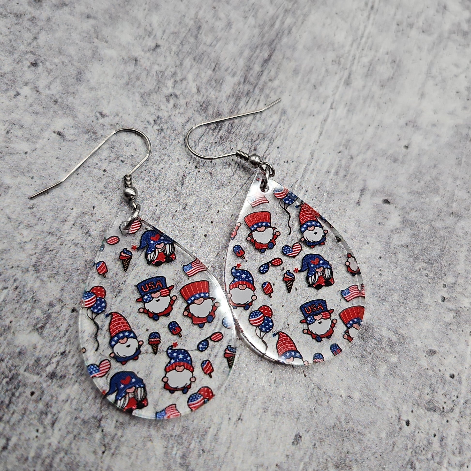 Available in 8 different sizes and shapes, these earrings feature a clear acrylic with printed gnomes in a Patriotic theme!