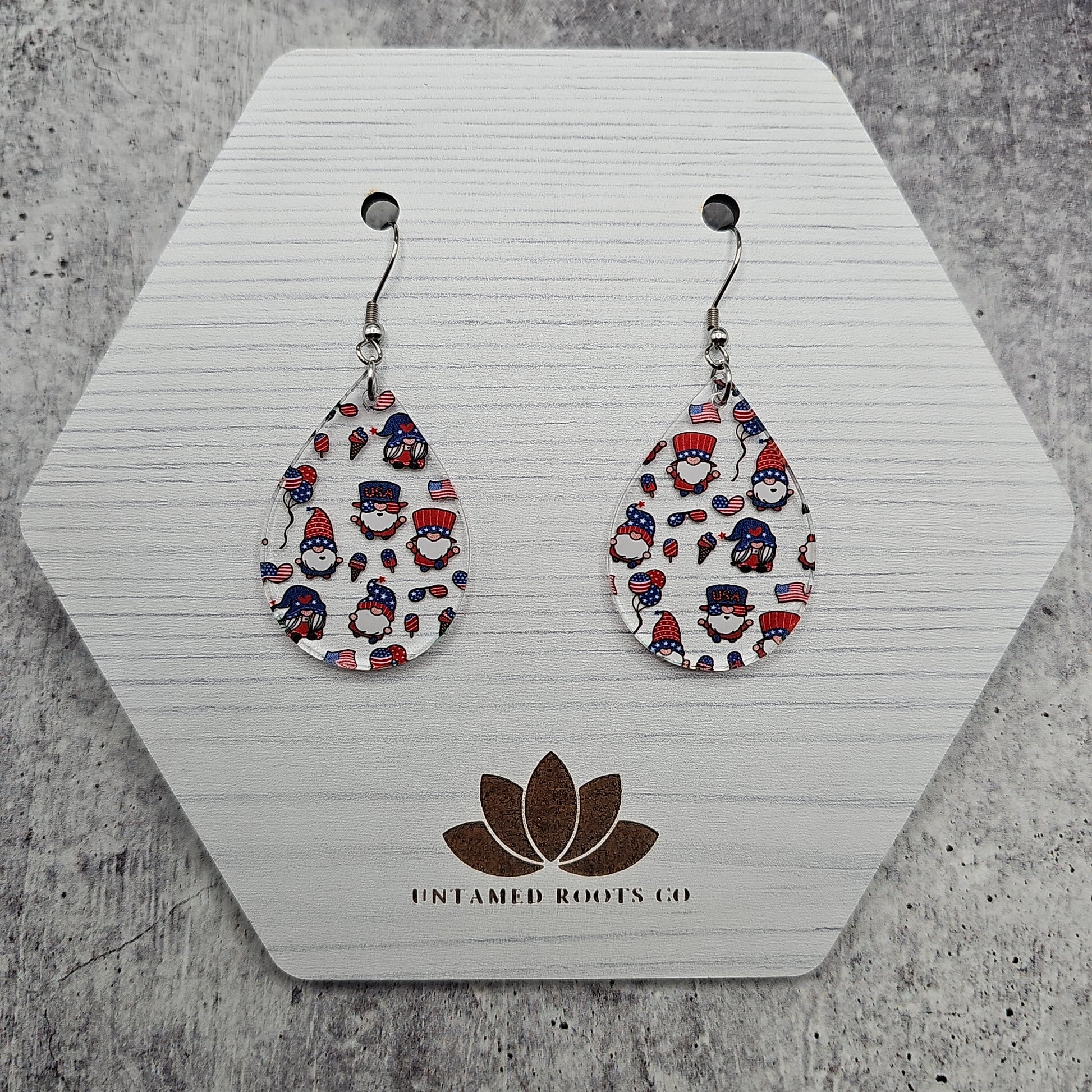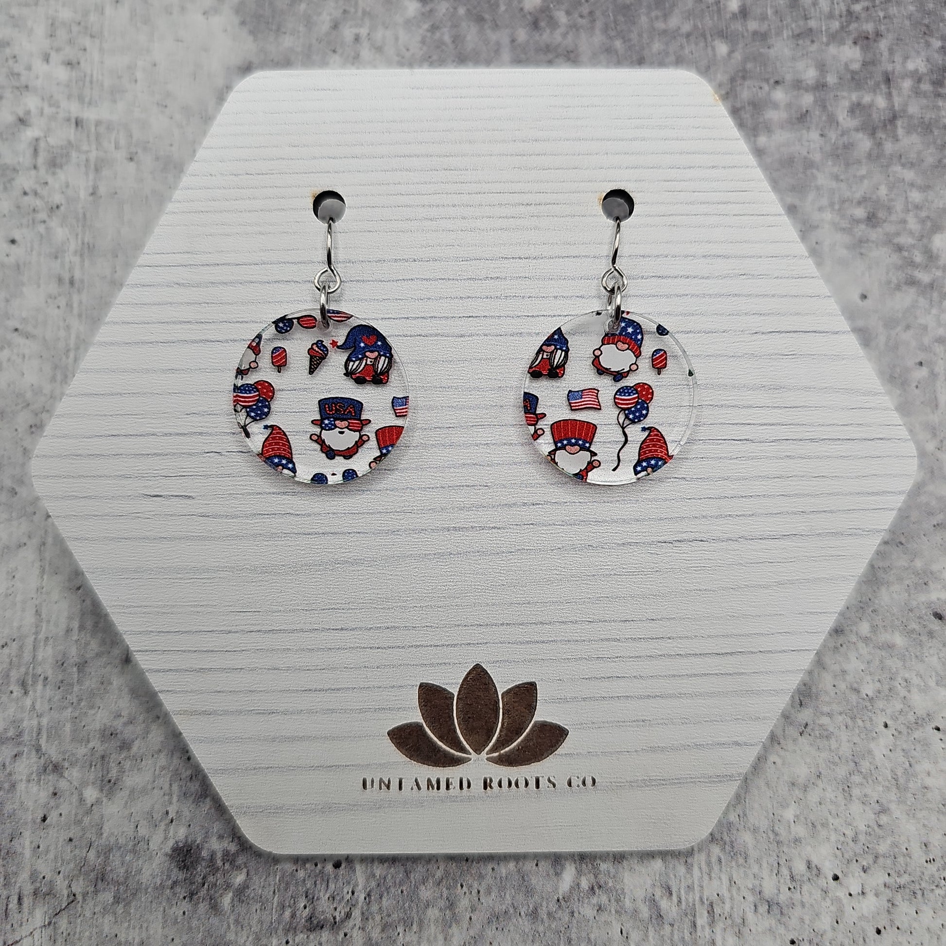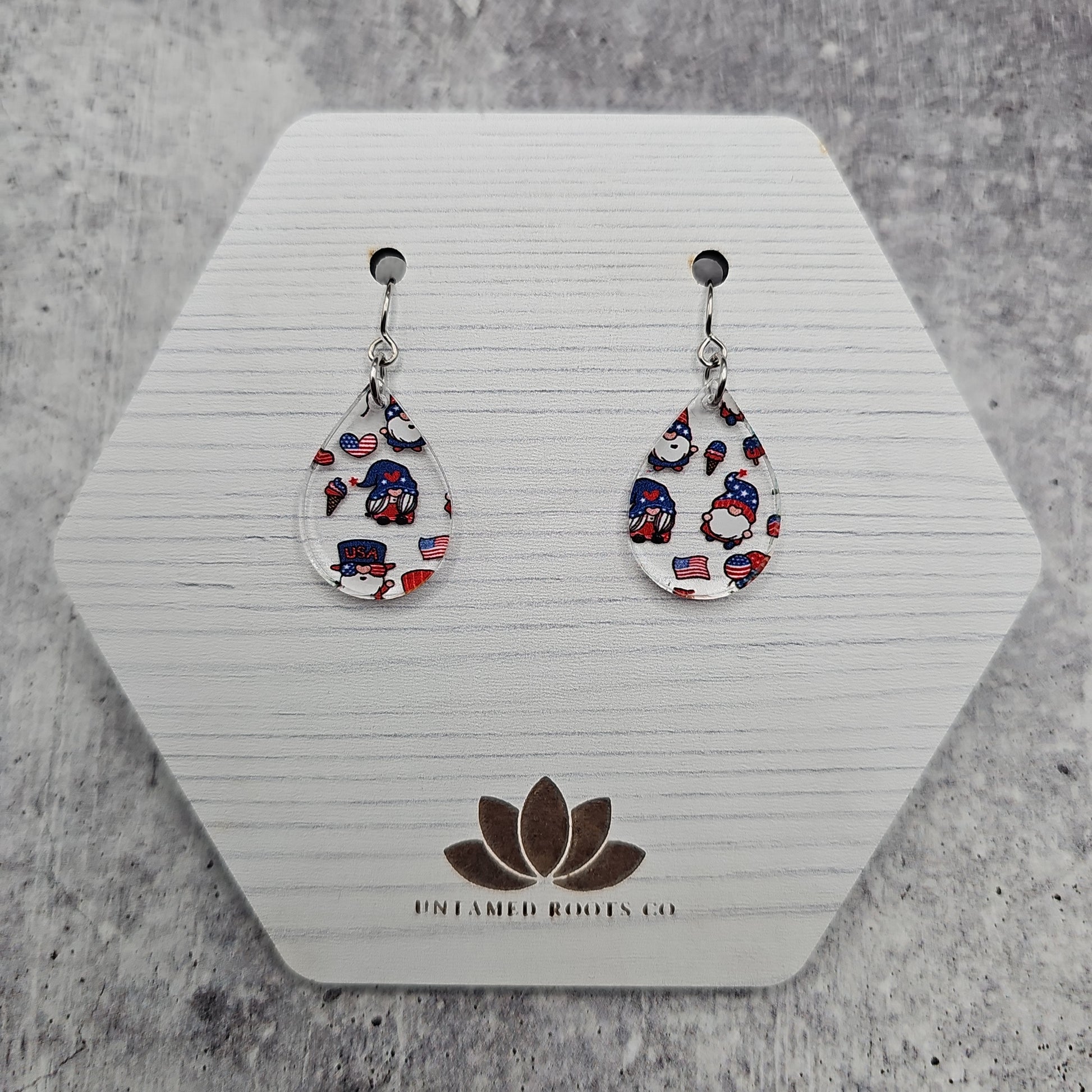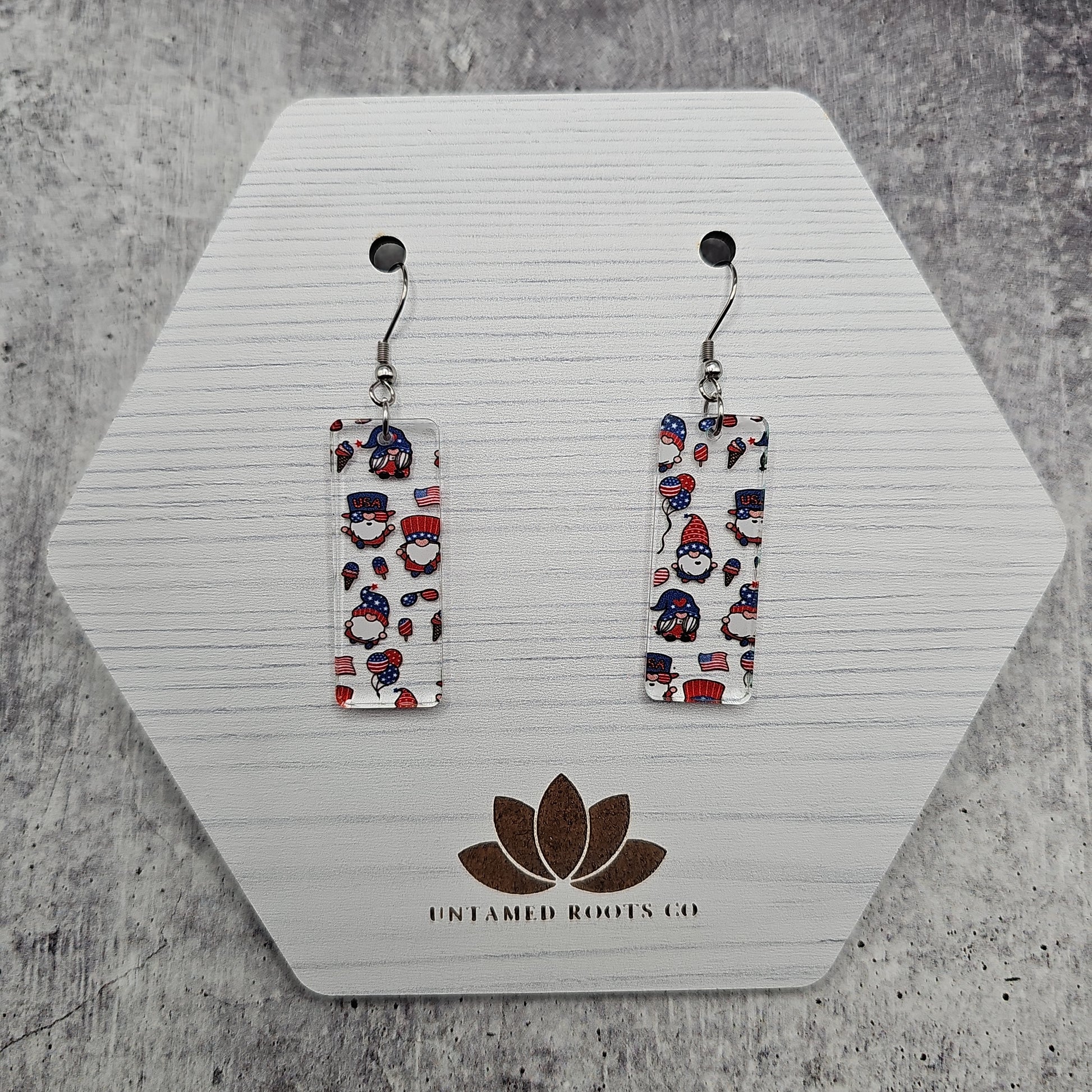 Available in 8 different sizes and shapes, these earrings feature a clear acrylic with printed gnomes in a Patriotic theme!