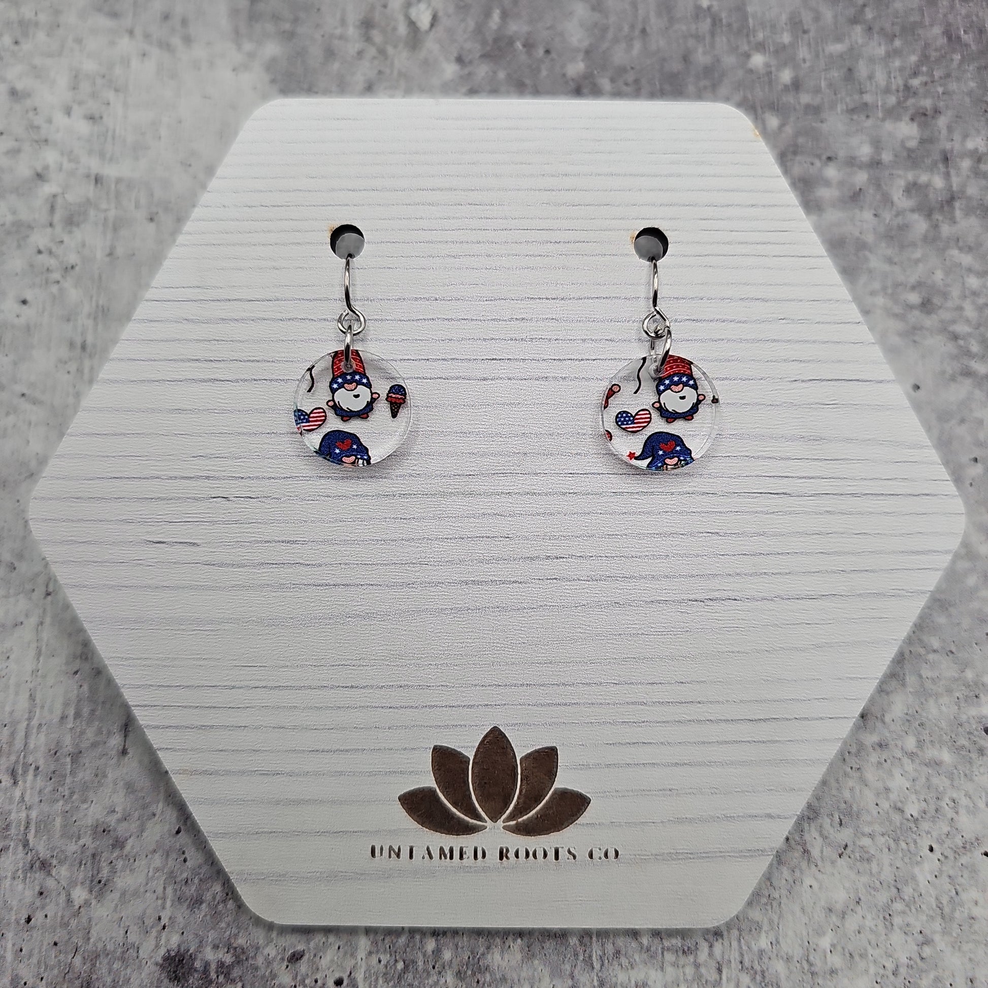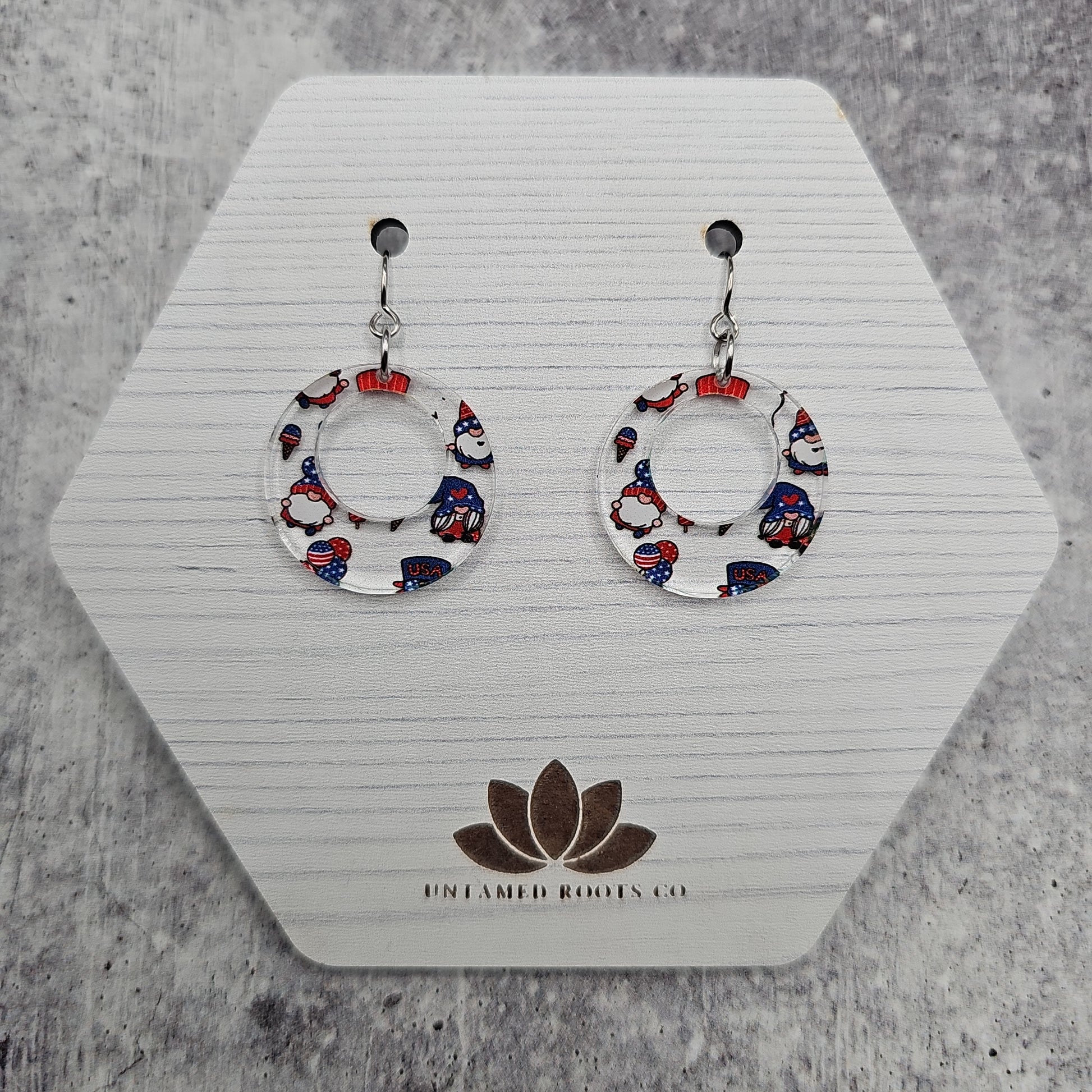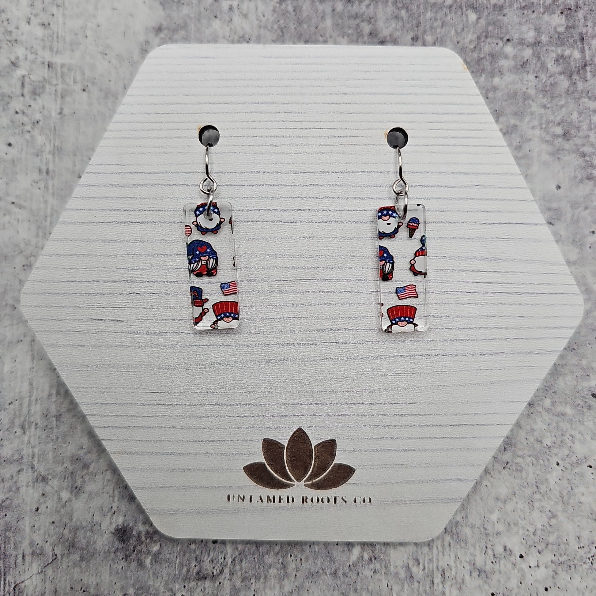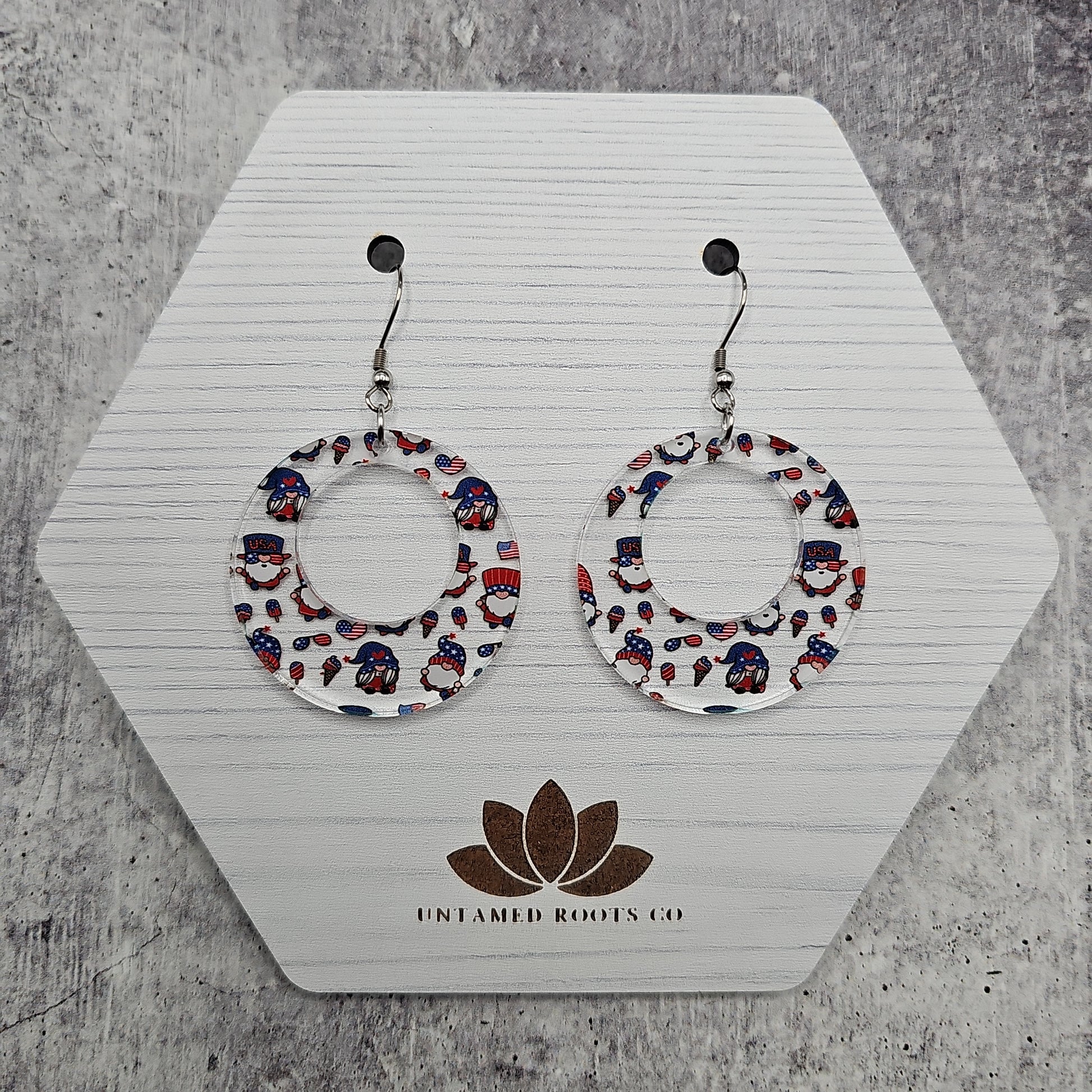 Available in 8 different sizes and shapes, these earrings feature a clear acrylic with printed gnomes in a Patriotic theme!