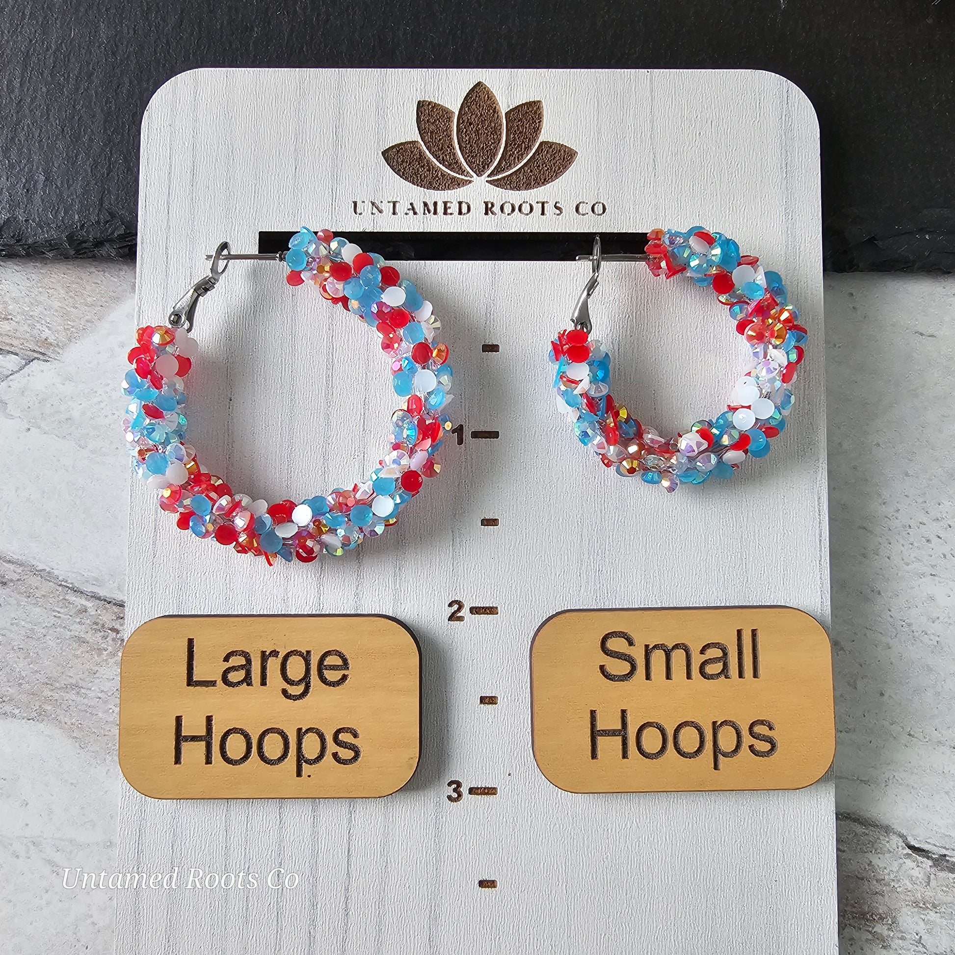 Make a statement with our Patriotic Super Chunky Glitter Hoop earrings. The iridescent chunky rhinestone glitter adds a touch of sparkle to any outfit. Hypoallergenic stainless steel hoops make these earrings perfect for those with sensitive ears.