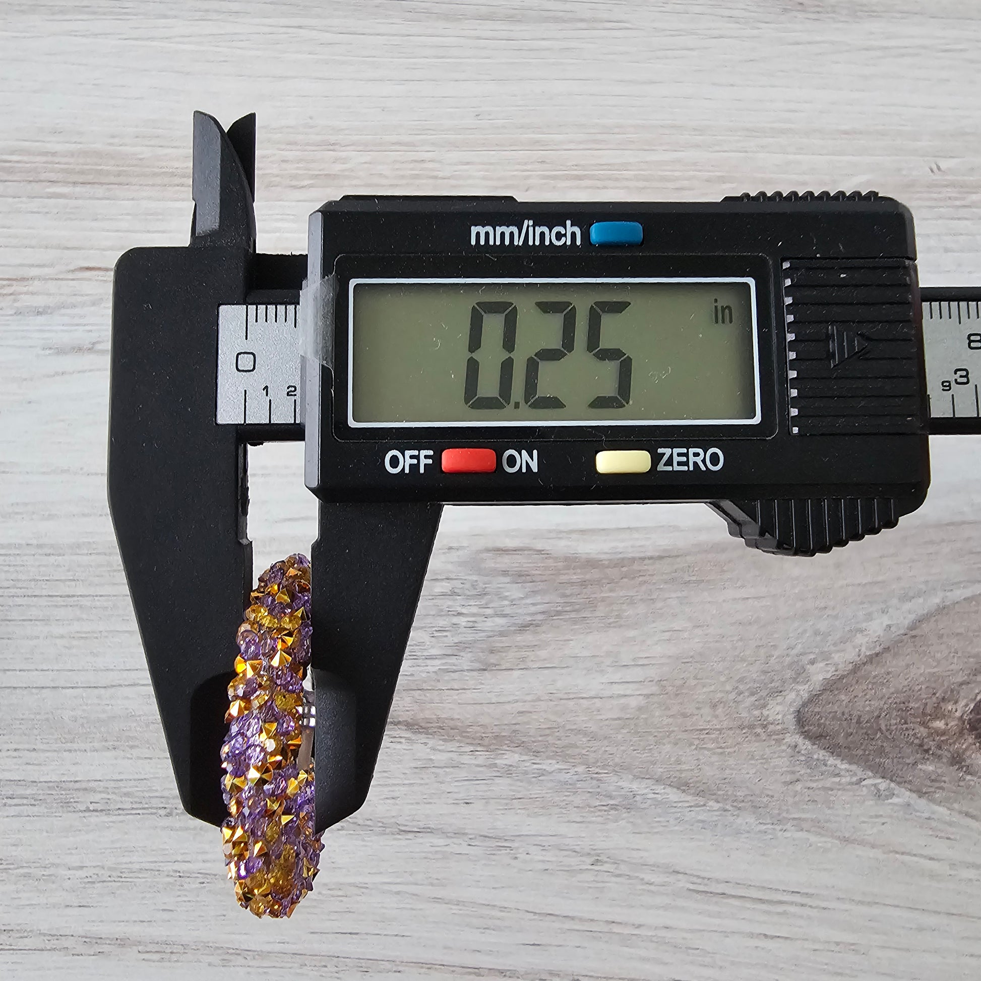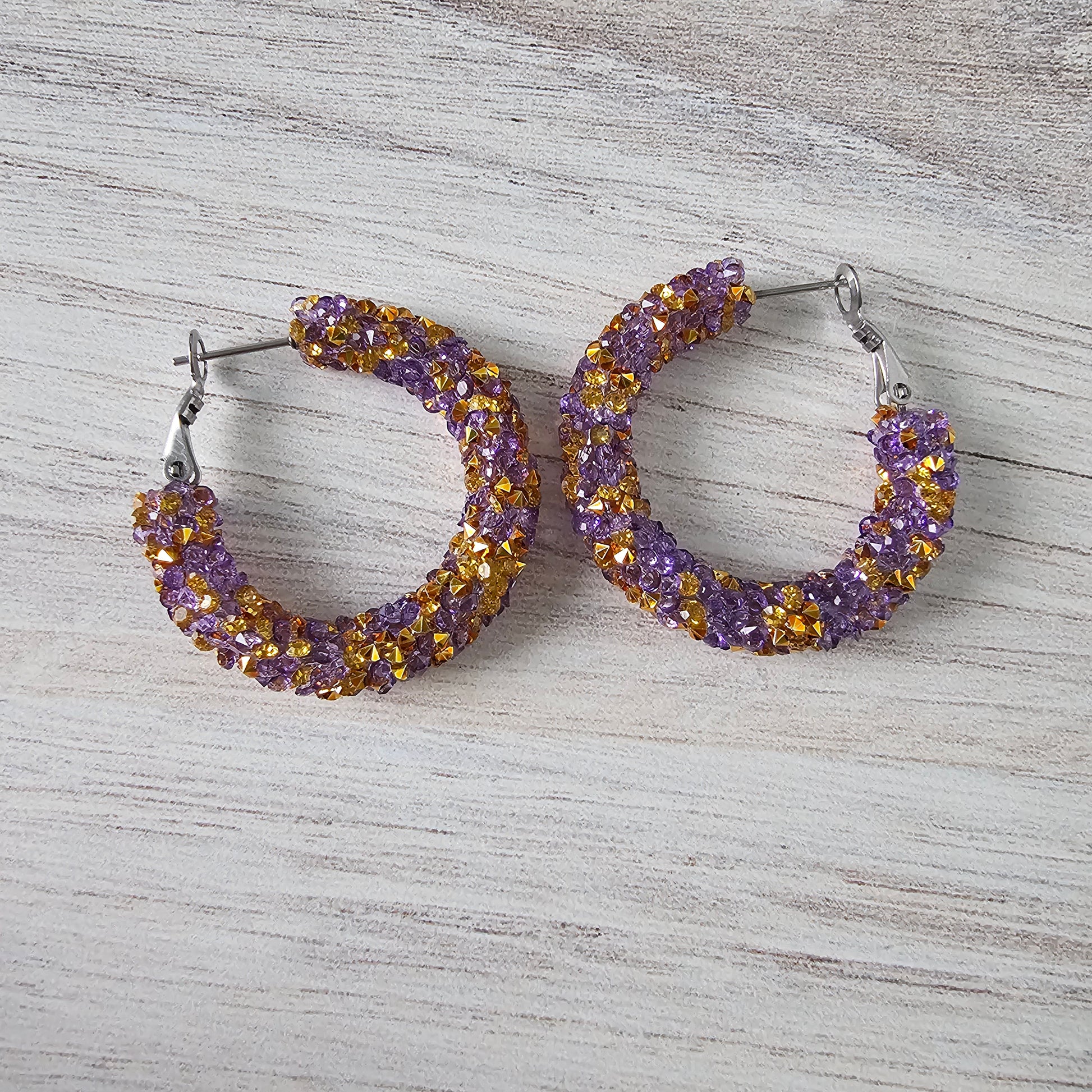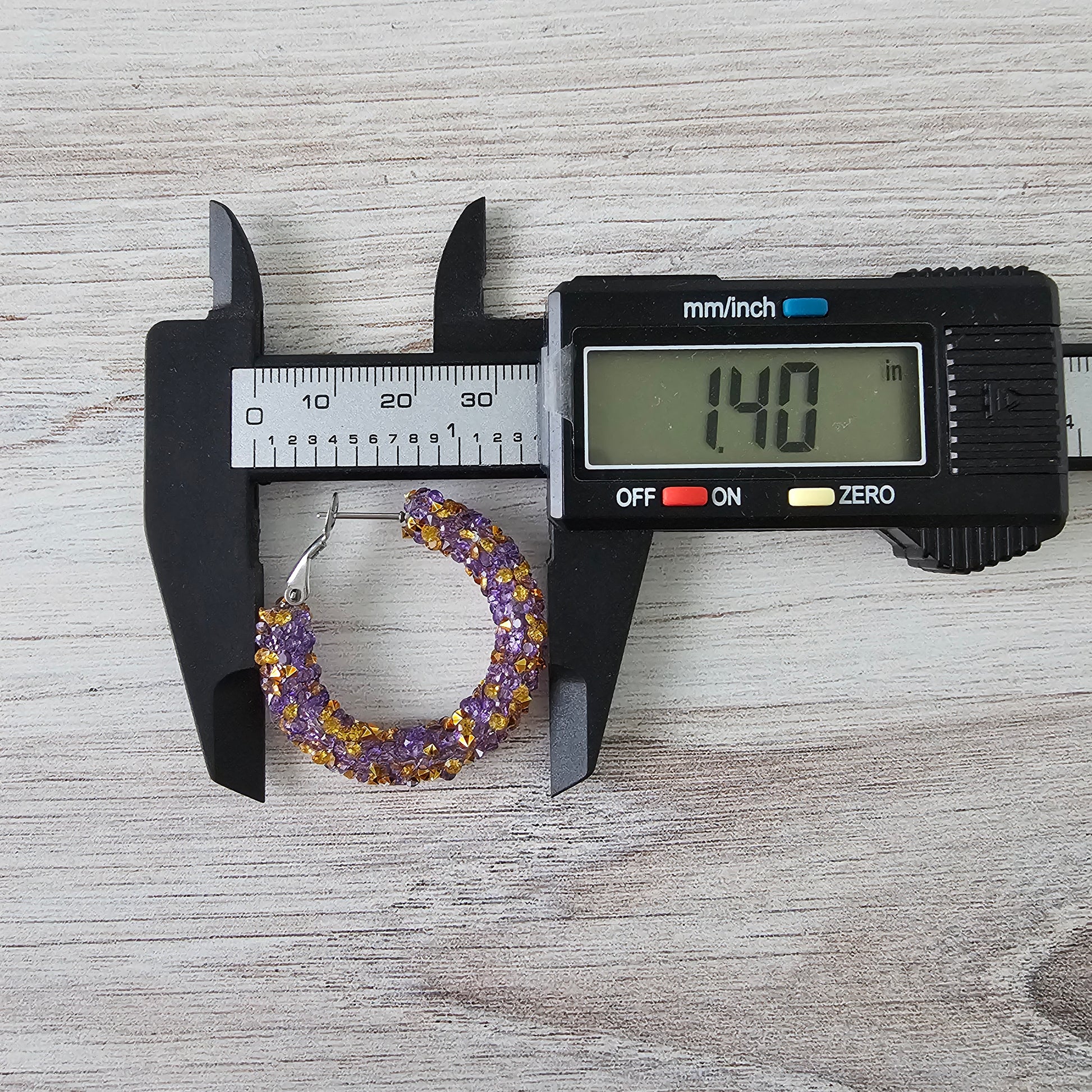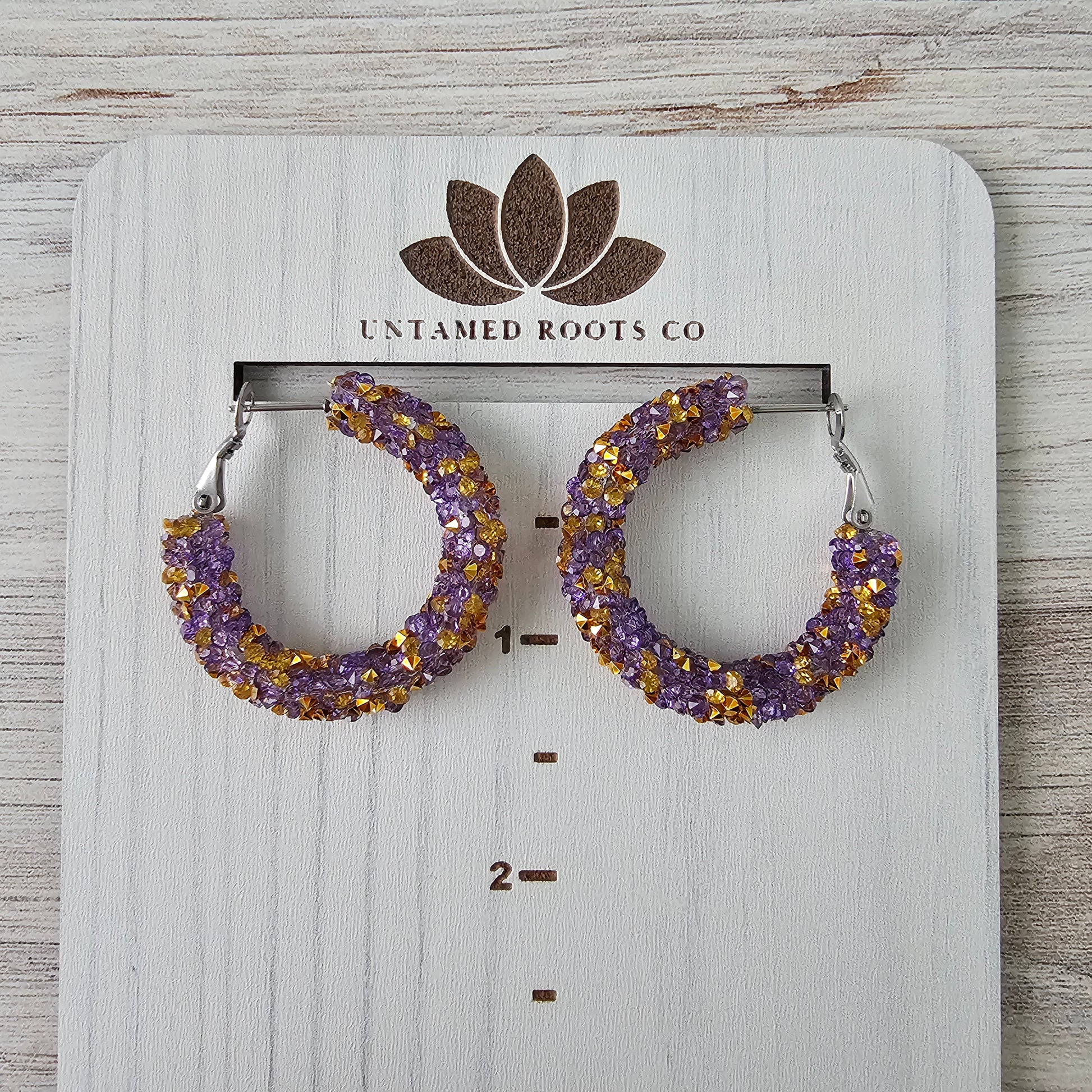 Sparkle and shine with our Puple & Gold Hoops! These 30mm hoops are adorned with purple and gold rhinestone glitter, perfect for showing off your team or school spirit. Made with hypoallergenic stainless steel, they're safe for sensitive ears and sealed to prevent any glitter mess. Hoop, there it is!