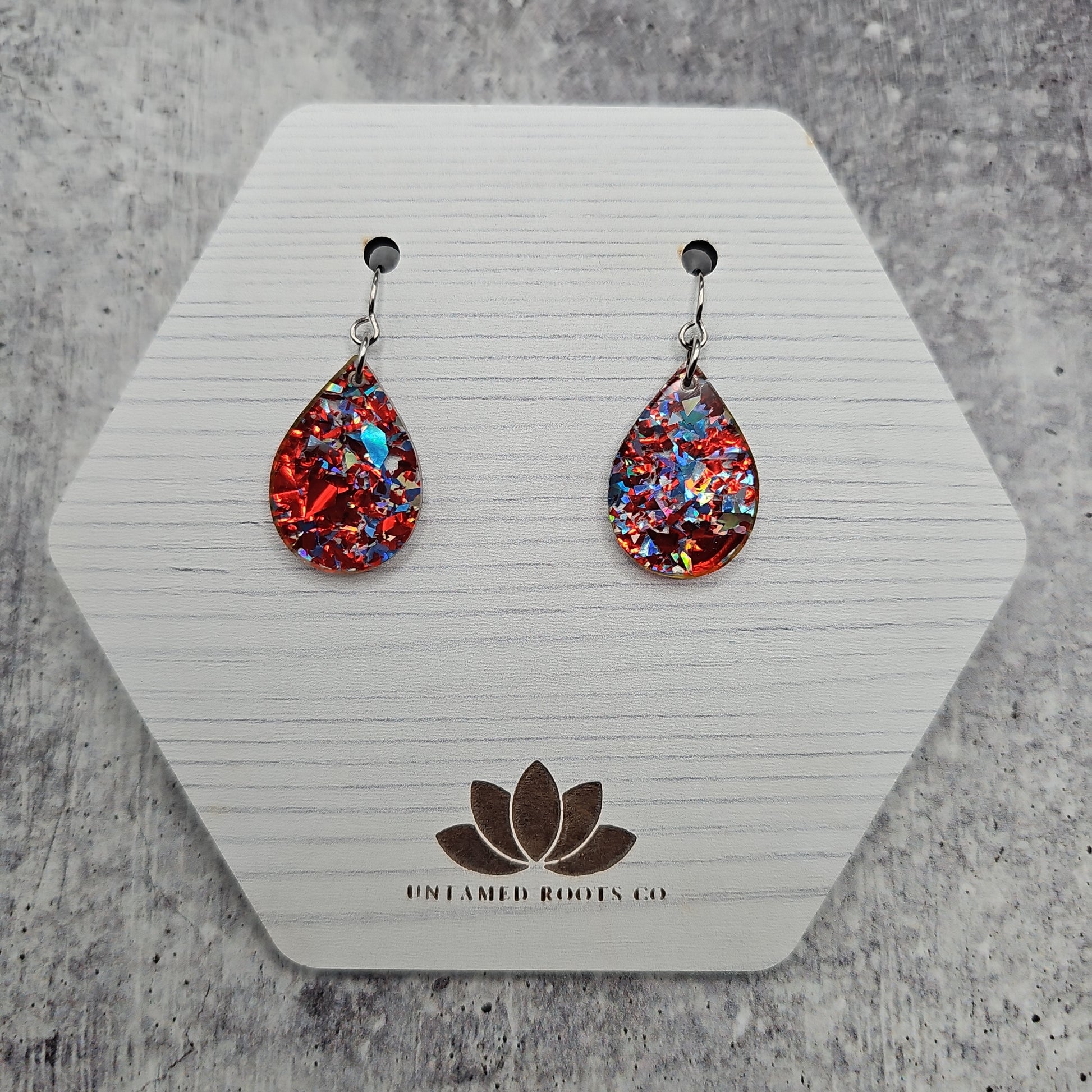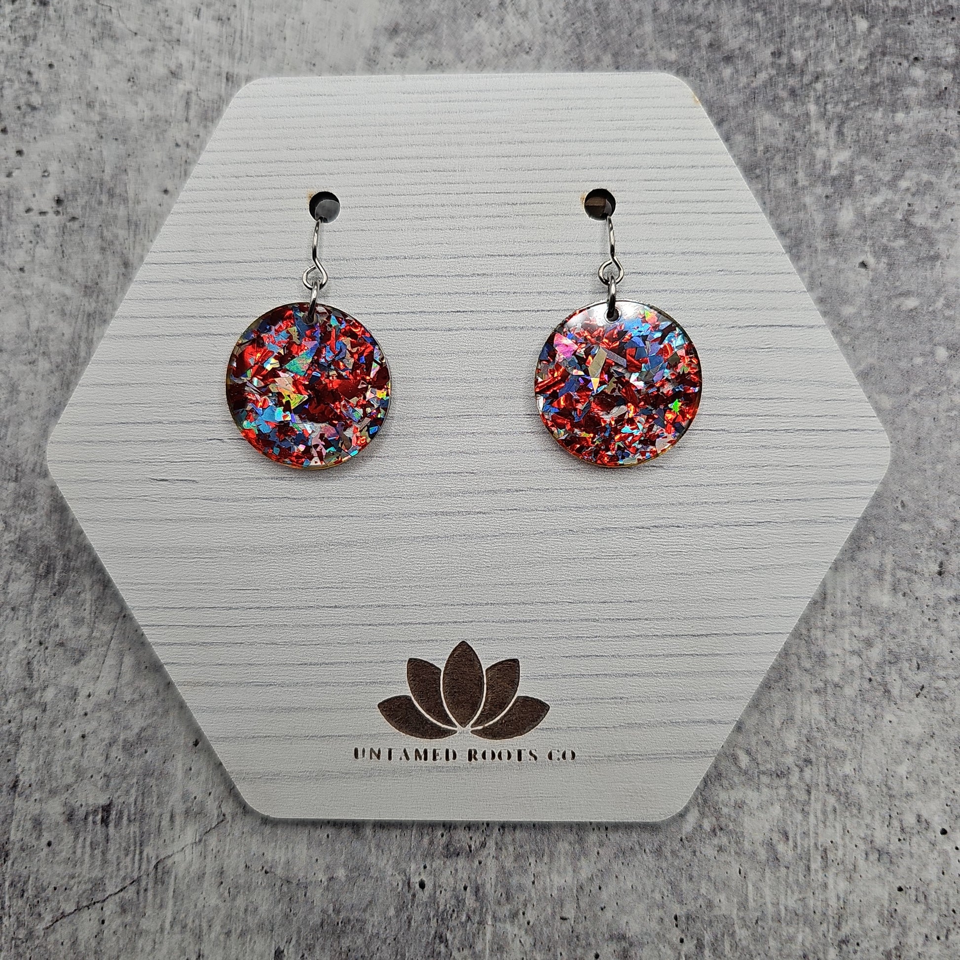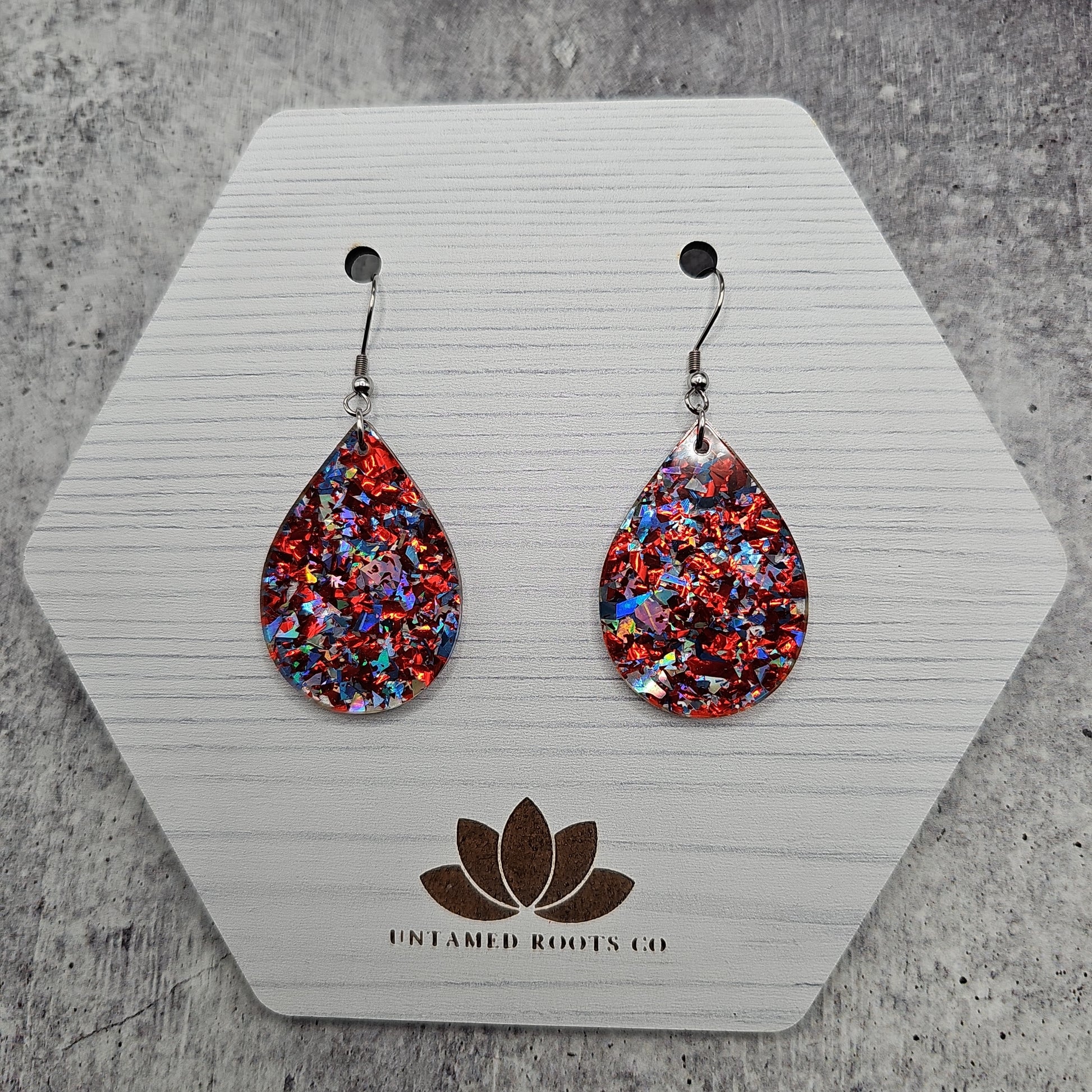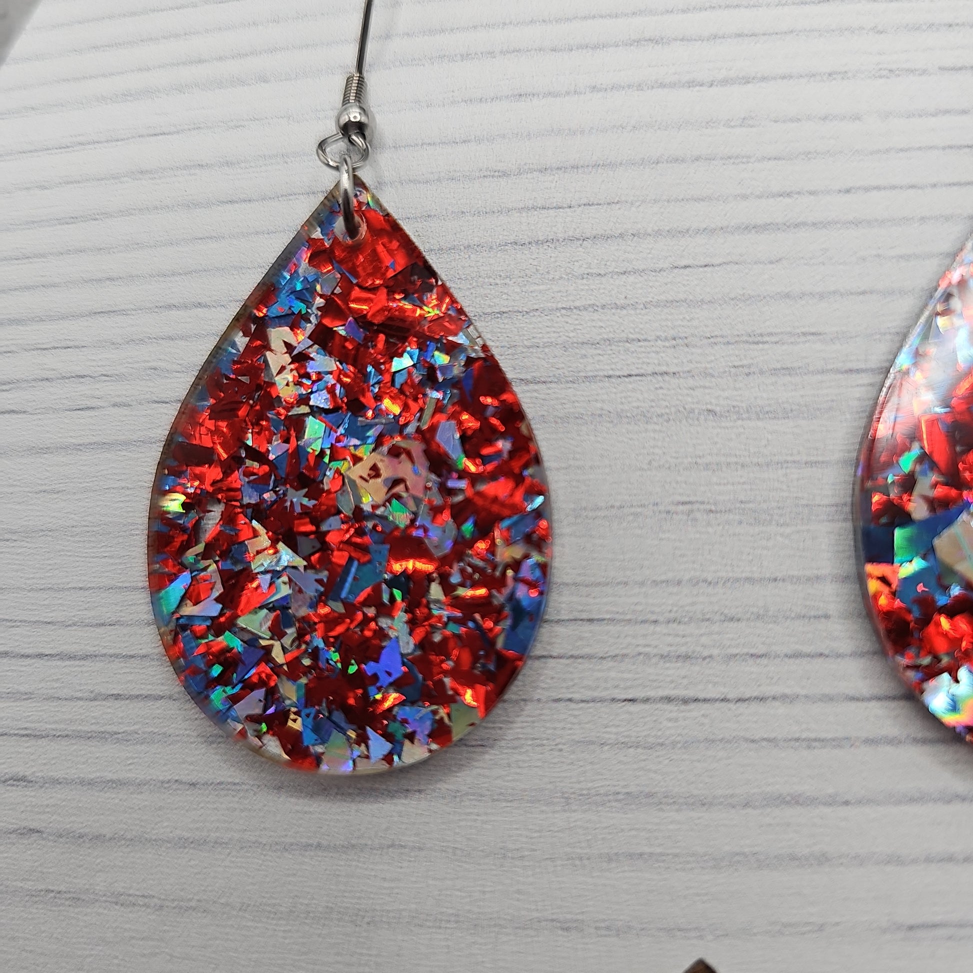 Available in 8 different sizes and shapes, these earrings feature iridescent chunky glitter in red, white, and blue colors!