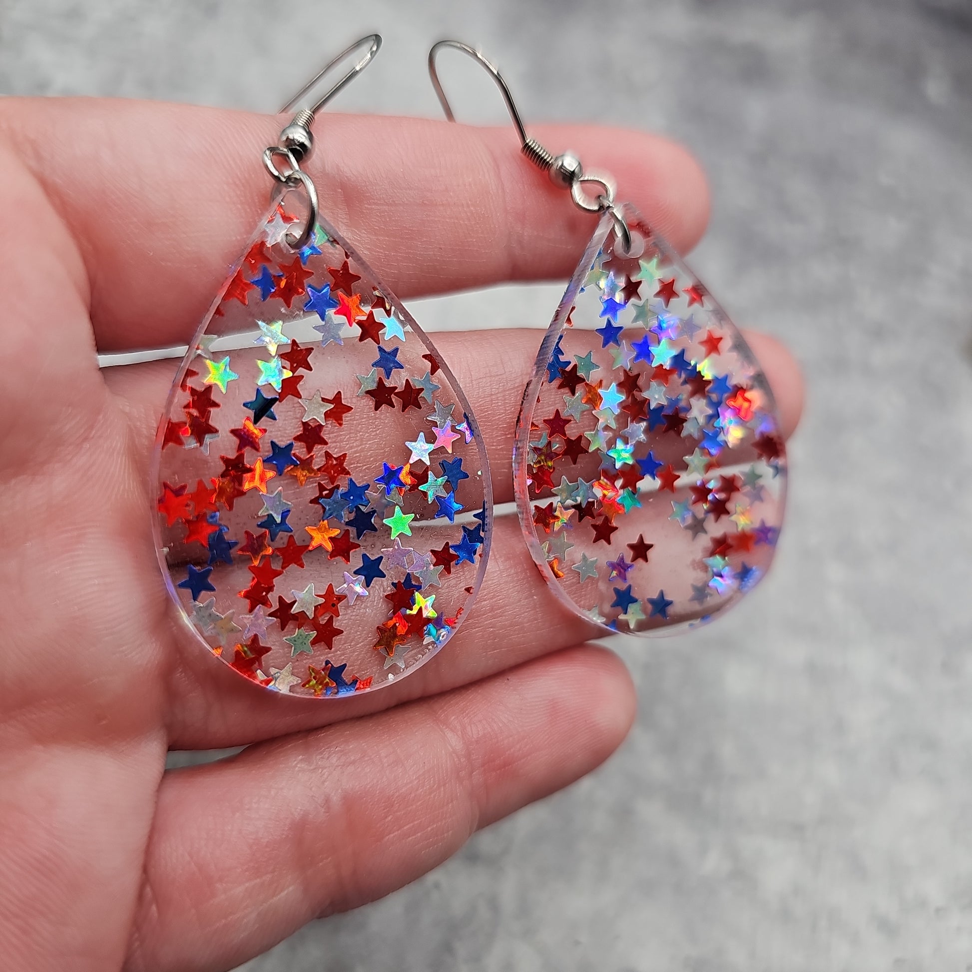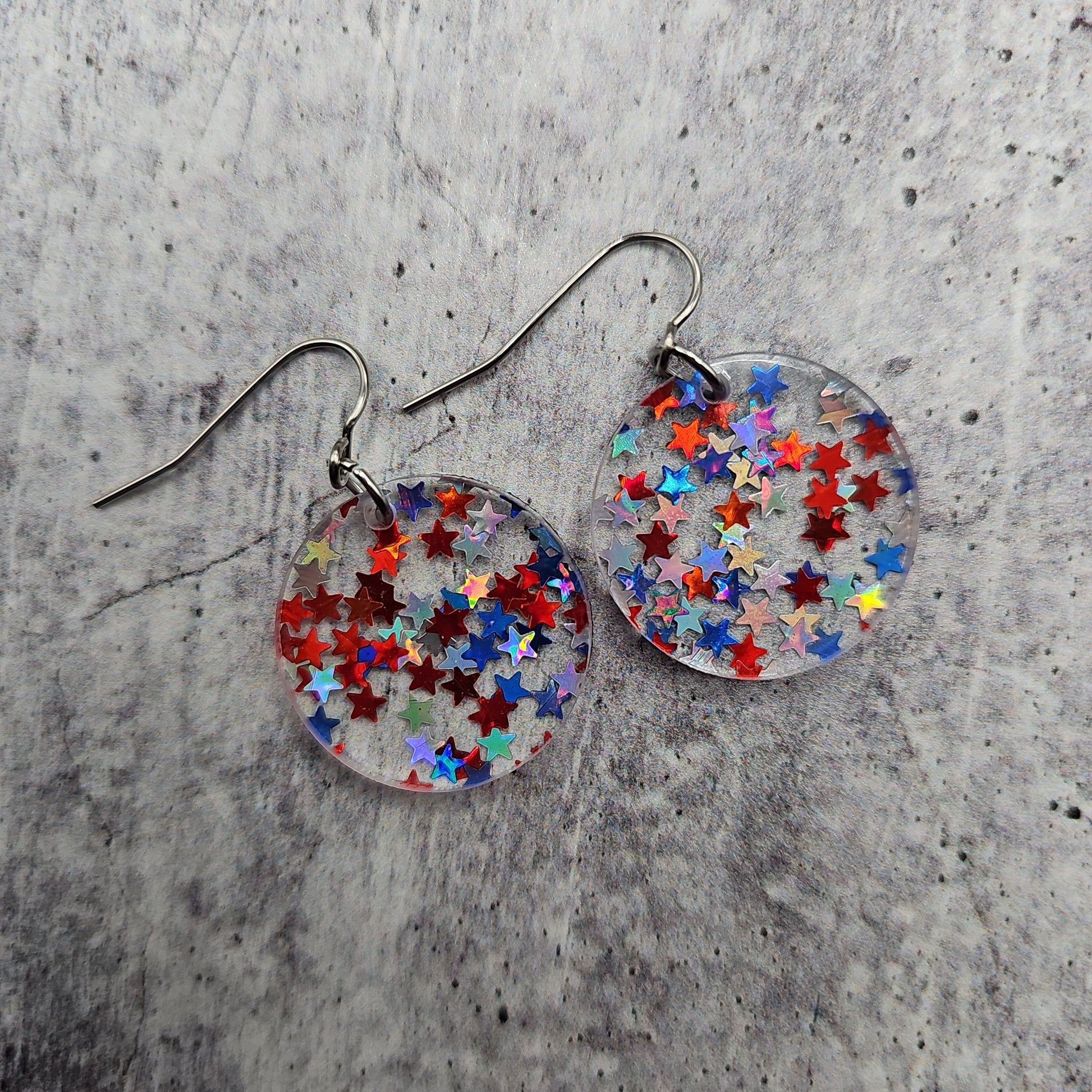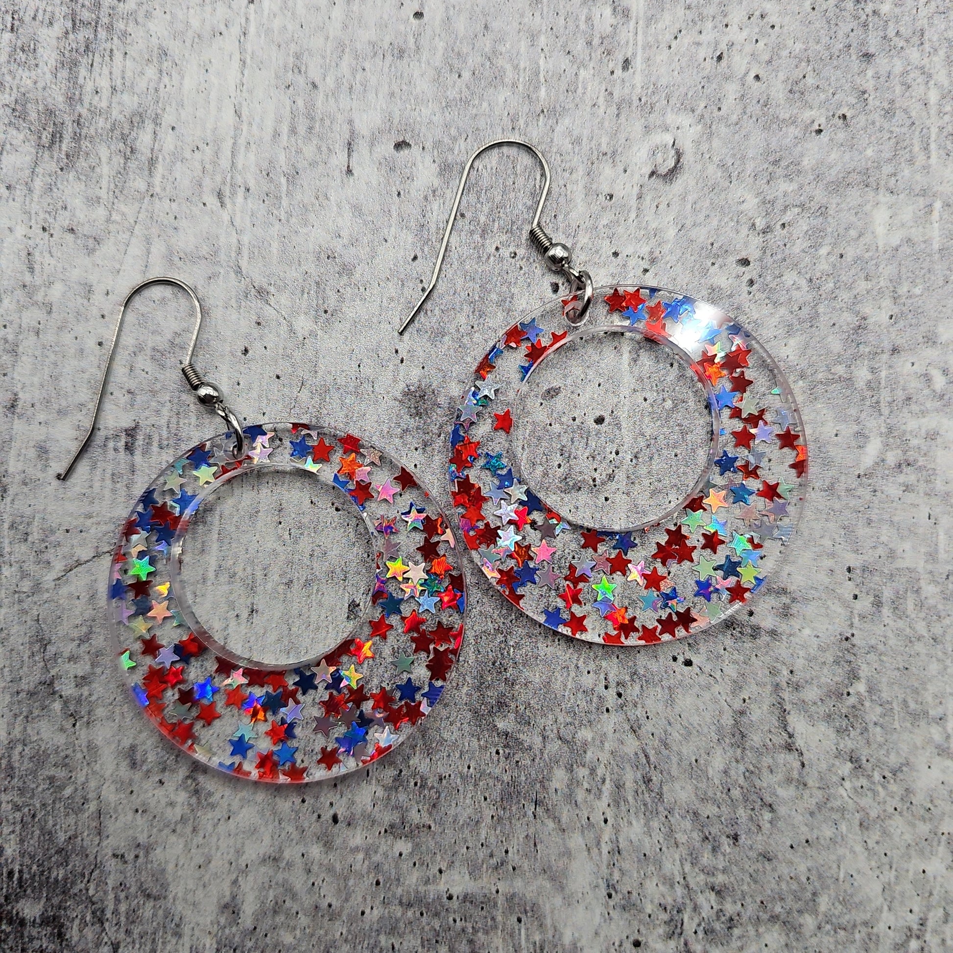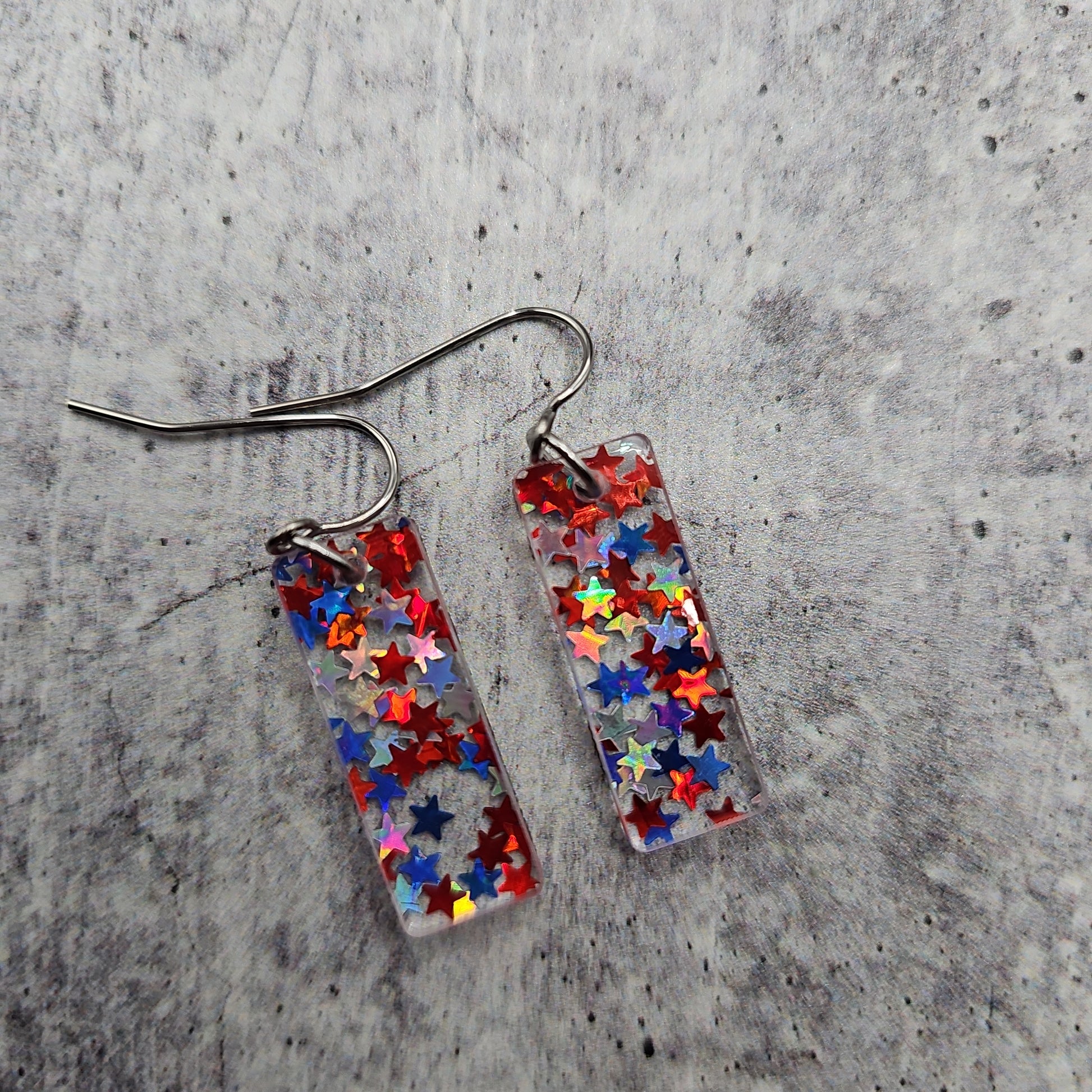 Available in 8 different sizes and shapes, these earrings feature iridescent stars in red, white, and blue colors!