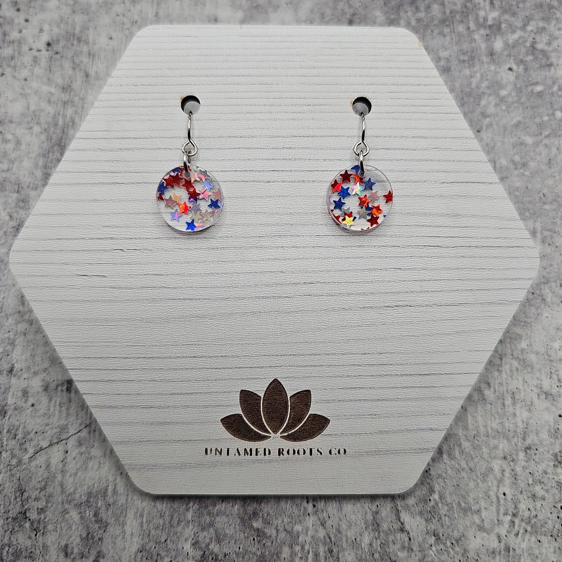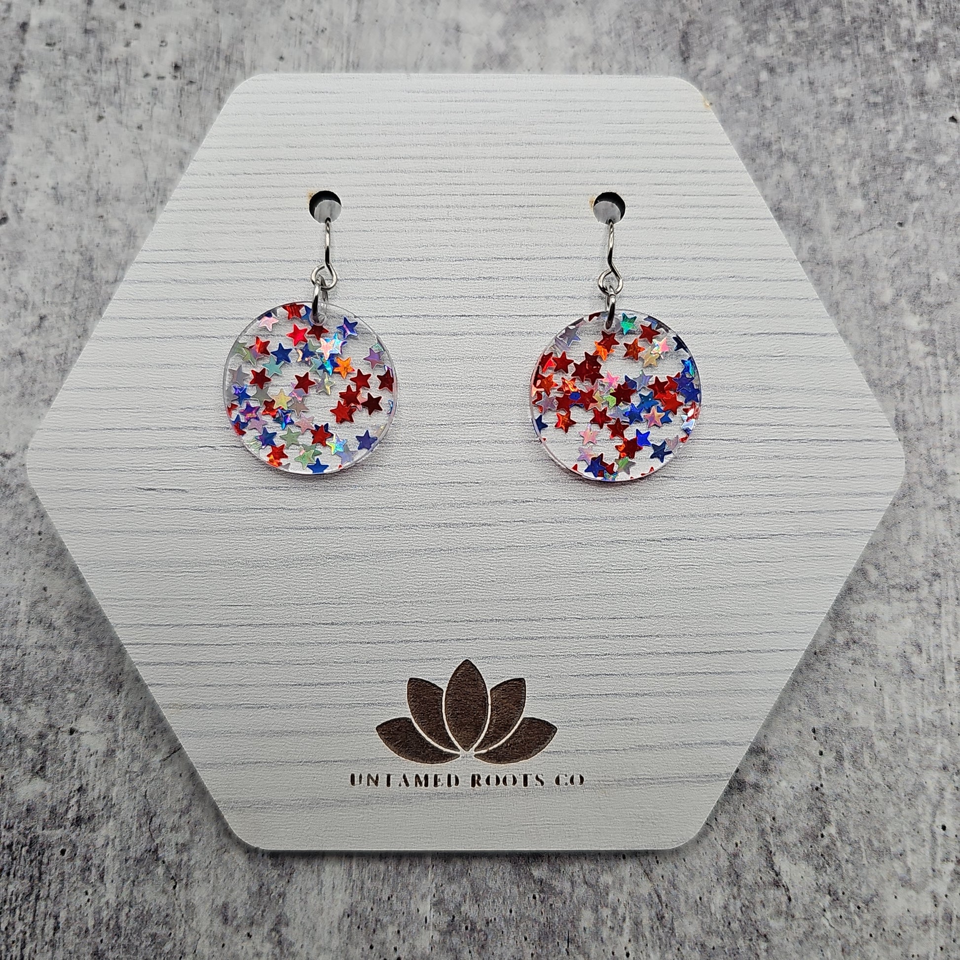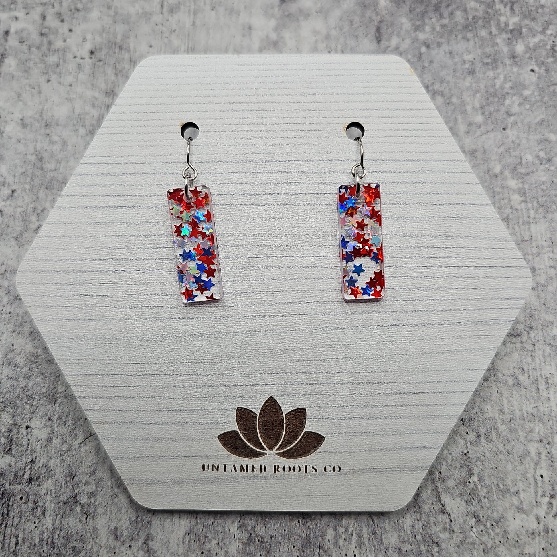 Available in 8 different sizes and shapes, these earrings feature iridescent stars in red, white, and blue colors!