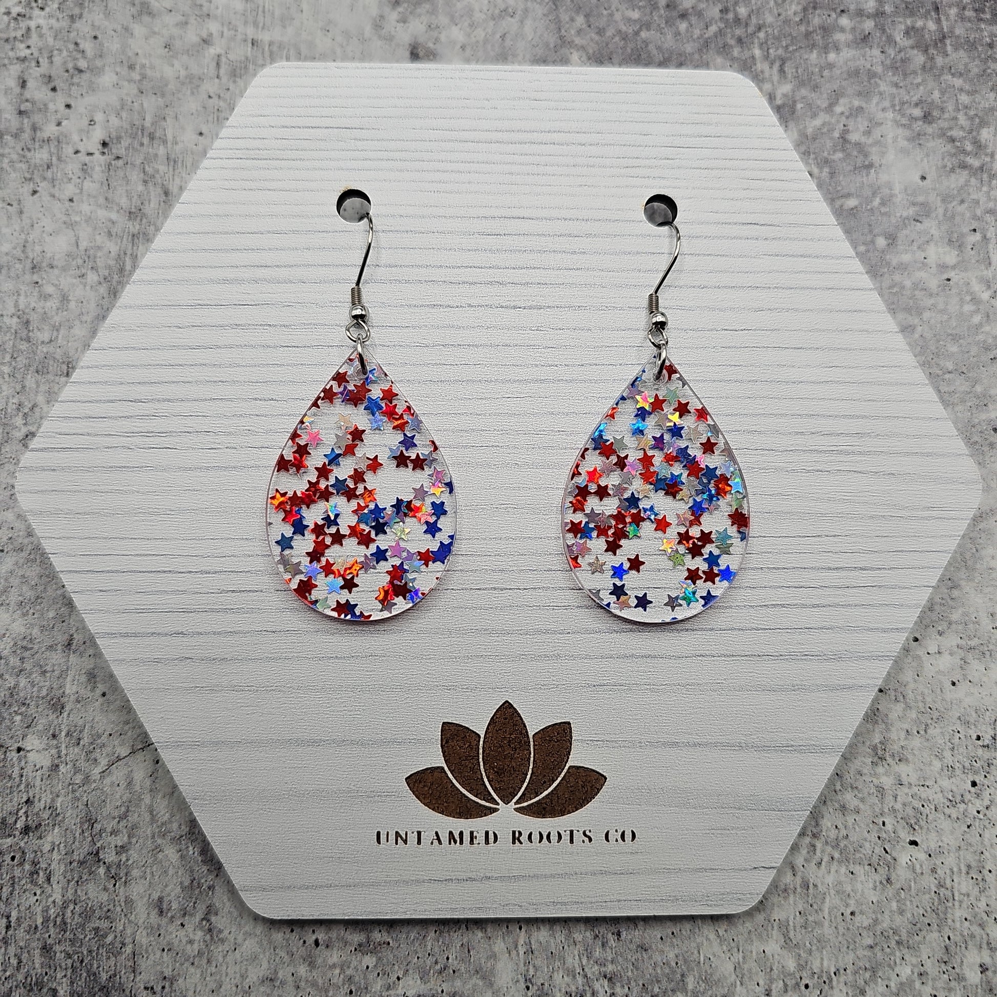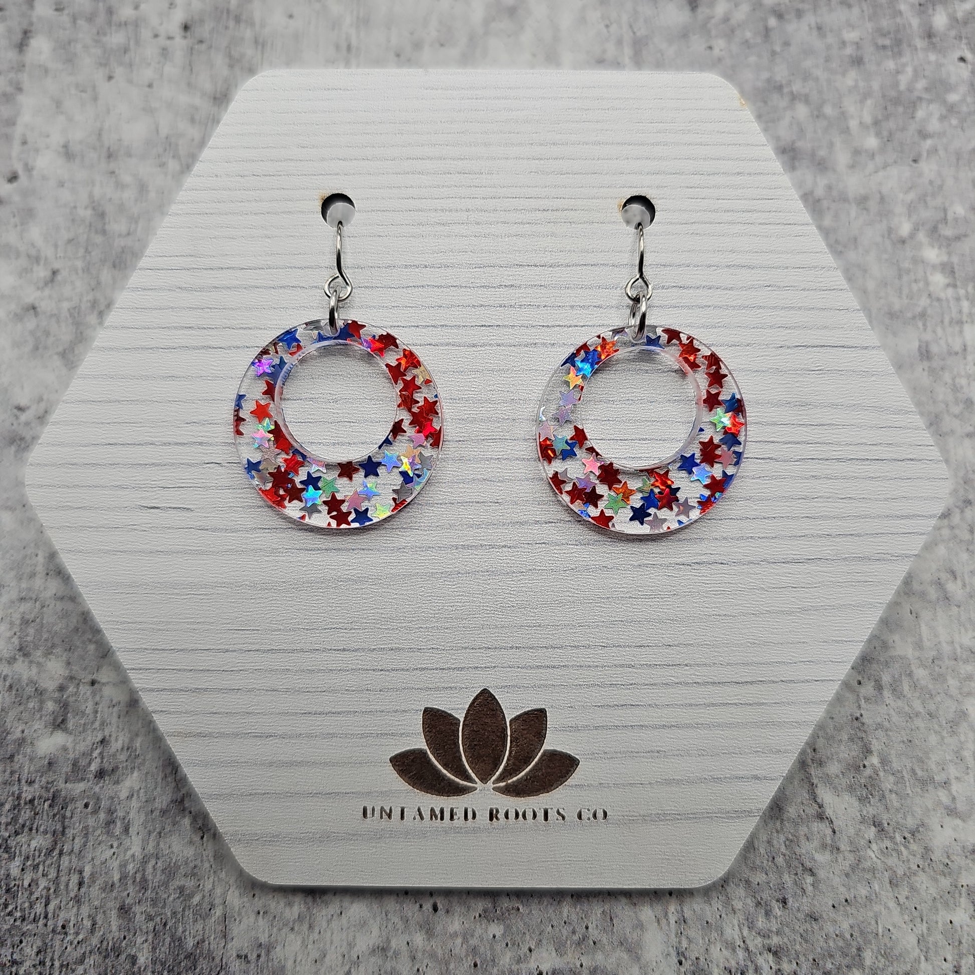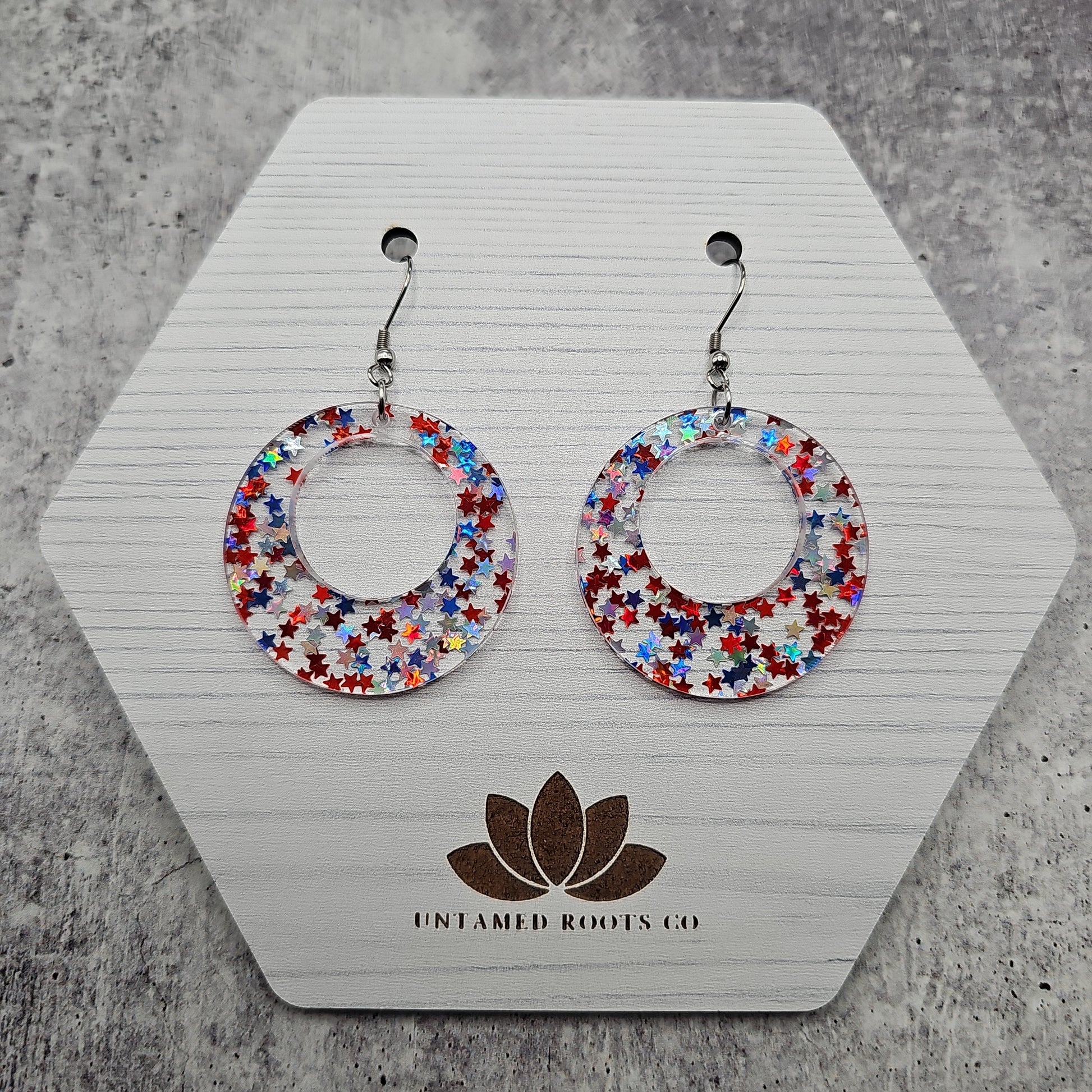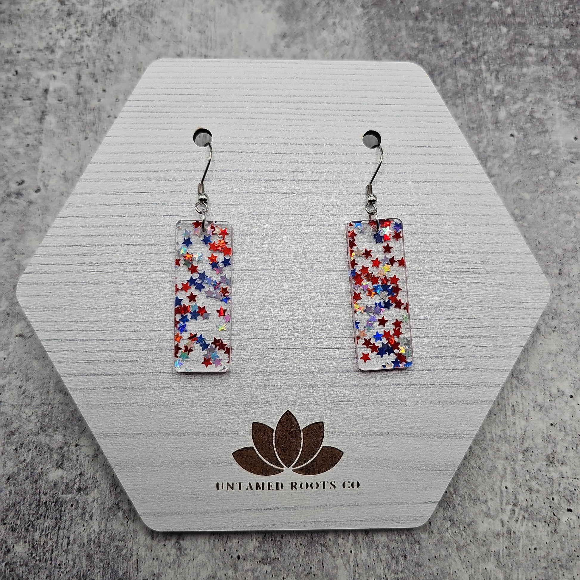 Available in 8 different sizes and shapes, these earrings feature iridescent stars in red, white, and blue colors!
