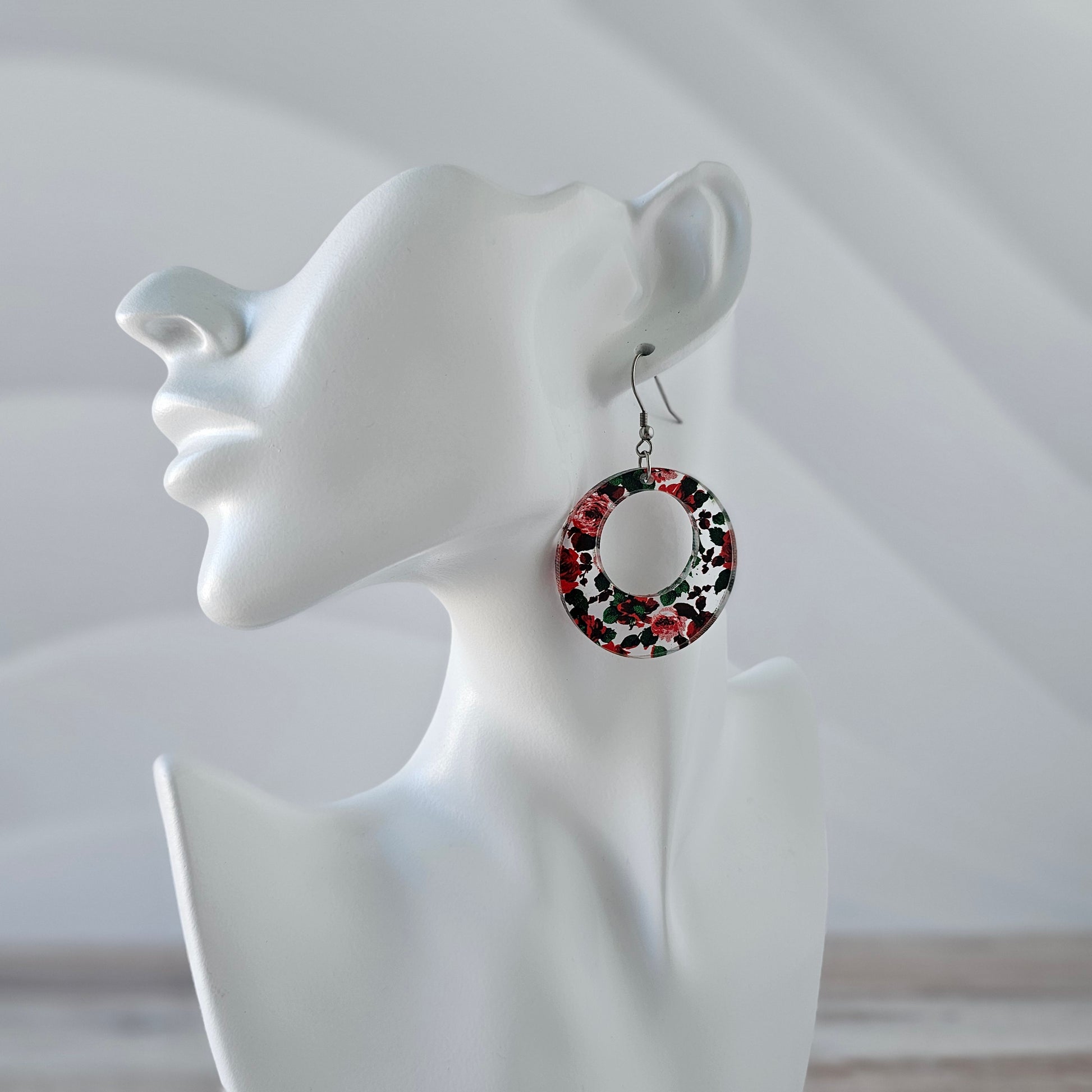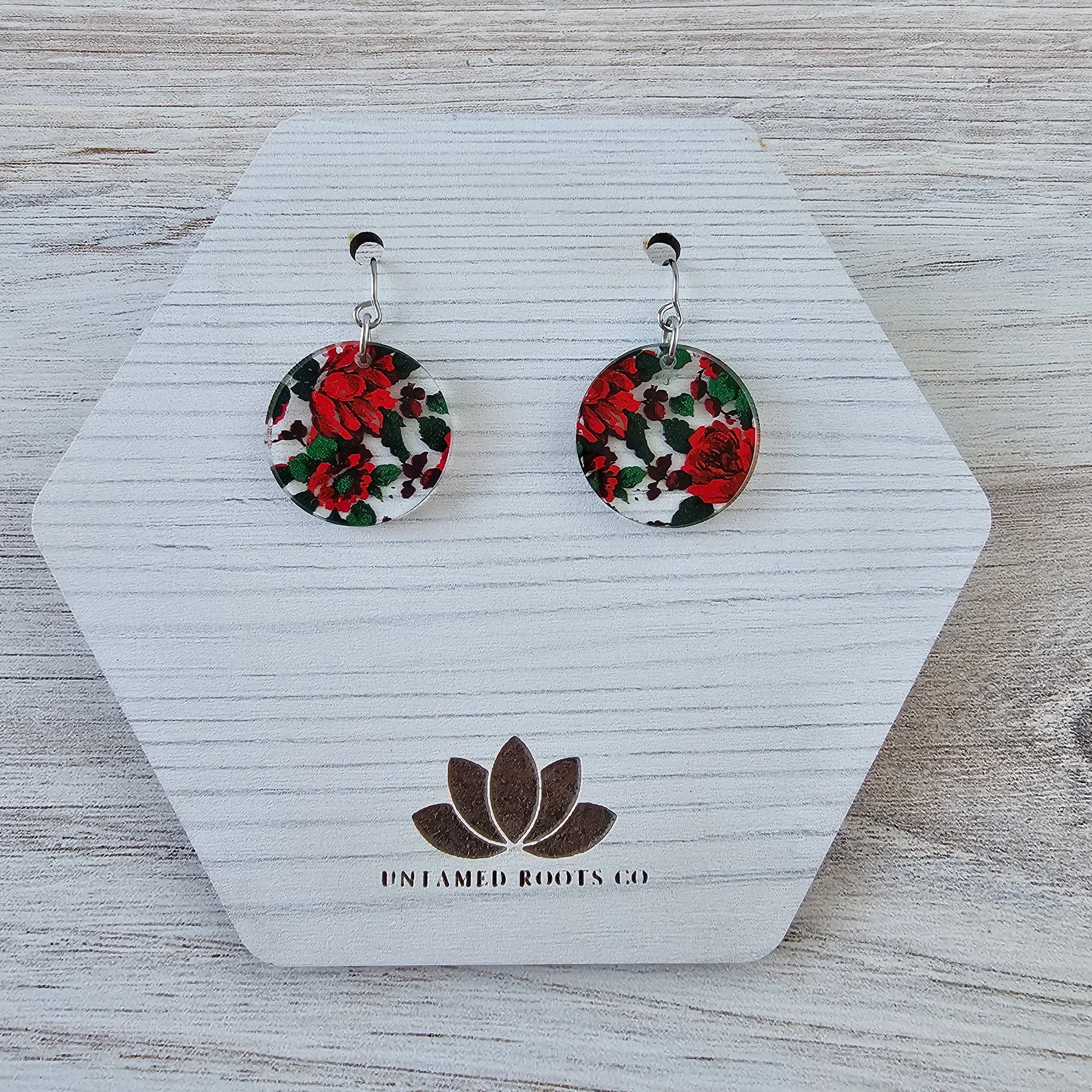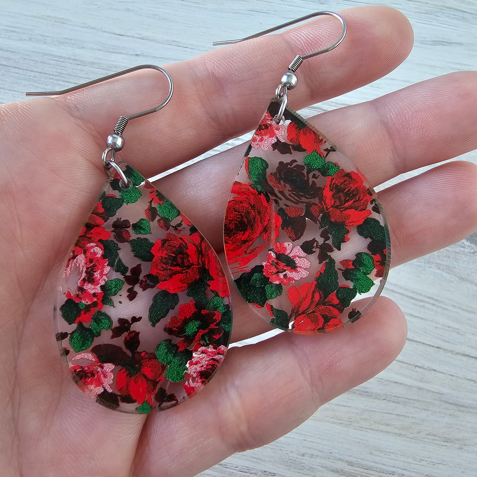 Available in 8 different sizes and shapes, these earrings feature a clear acrylic with a beautiful rose print!