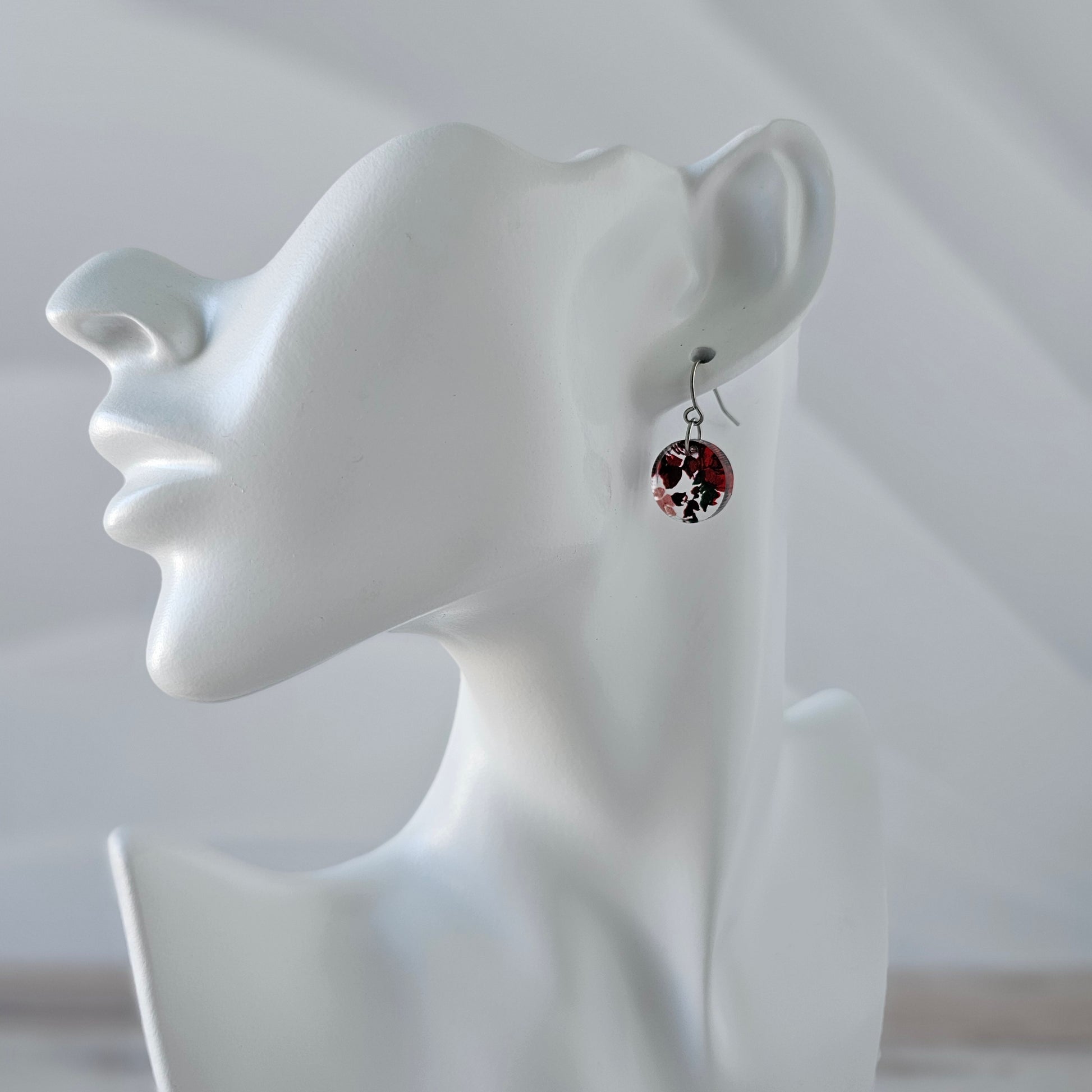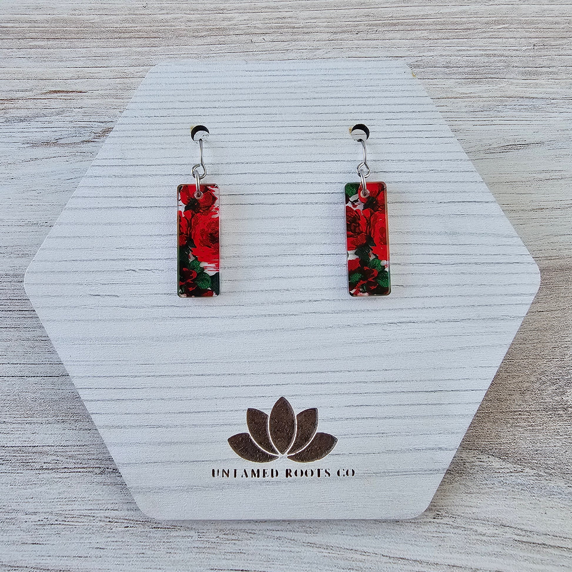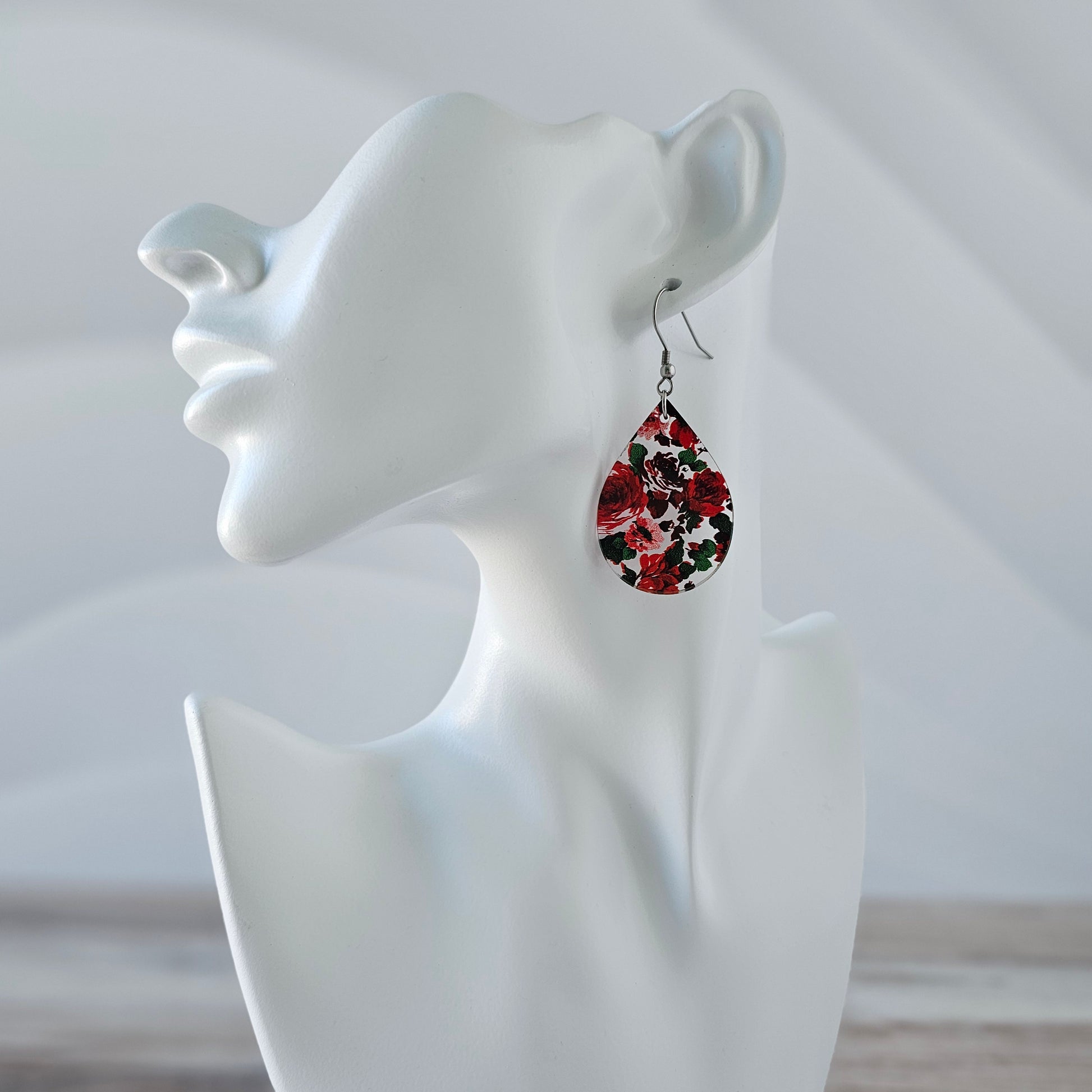 Available in 8 different sizes and shapes, these earrings feature a clear acrylic with a beautiful rose print!