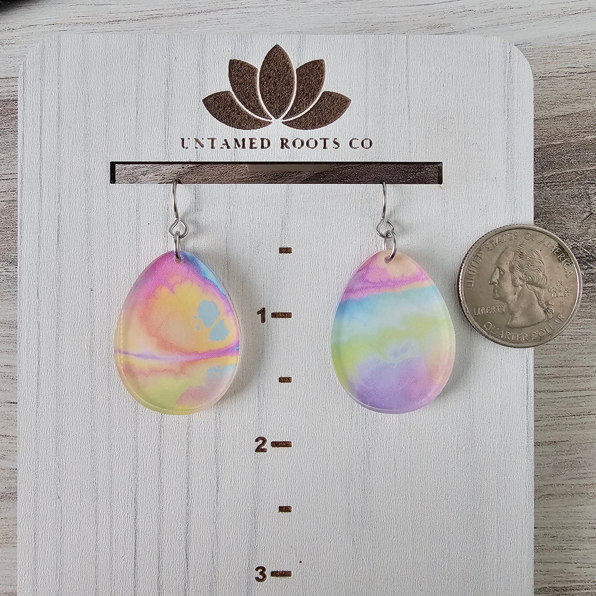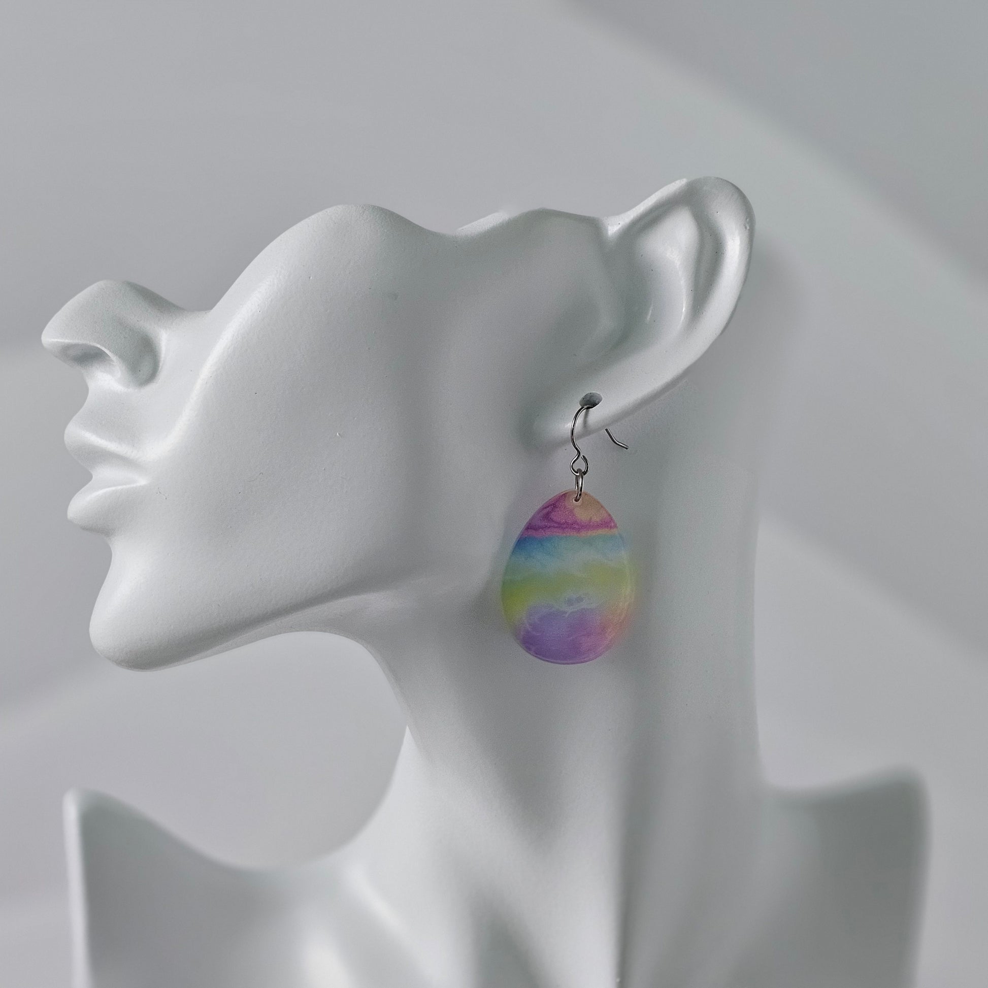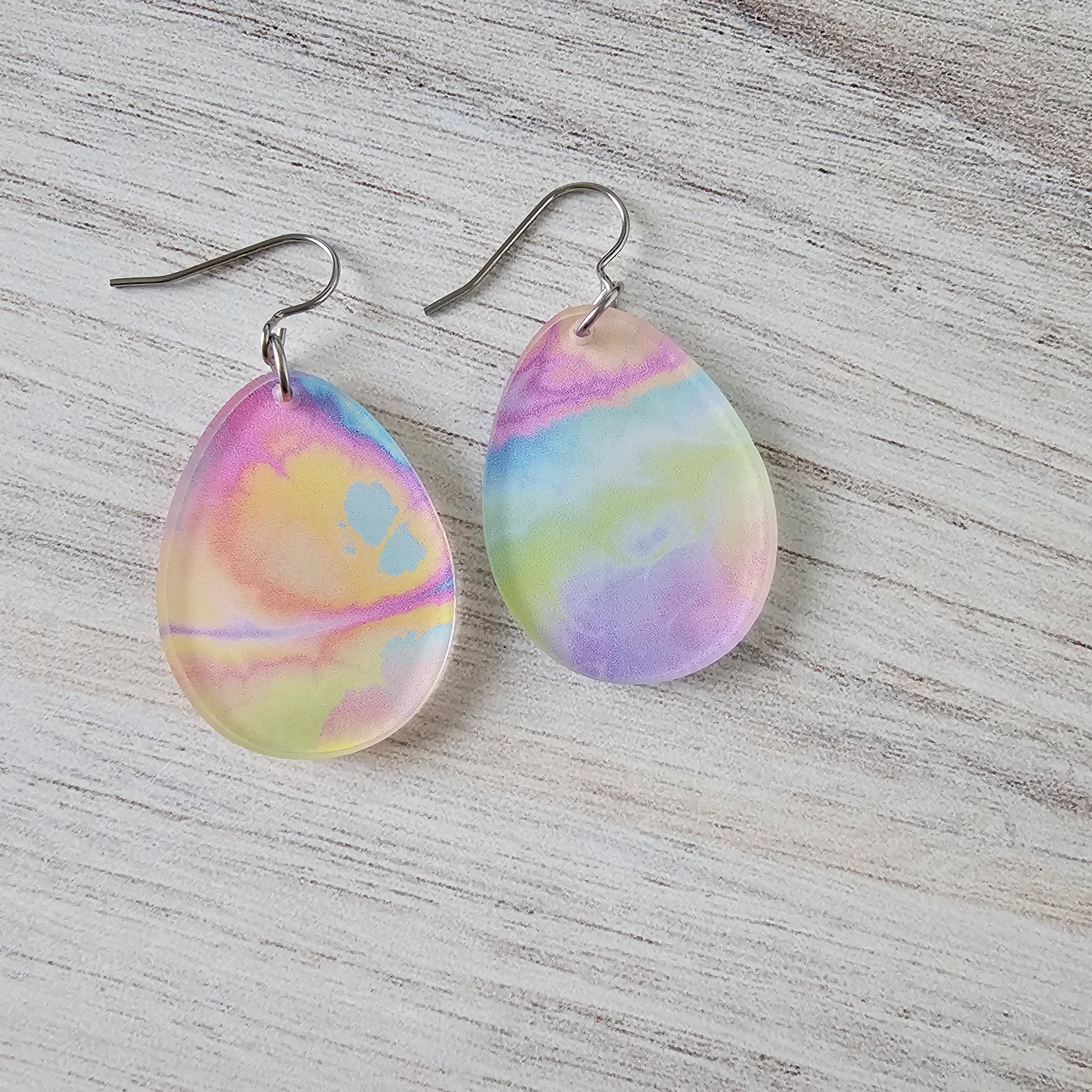 Sure to be an instant classic for Easter, these egg shaped earrings feature clear acrylic with fun pastel tie dye colors! Finished with hypoallergenic stainless steel earring wires for sensitive ears.