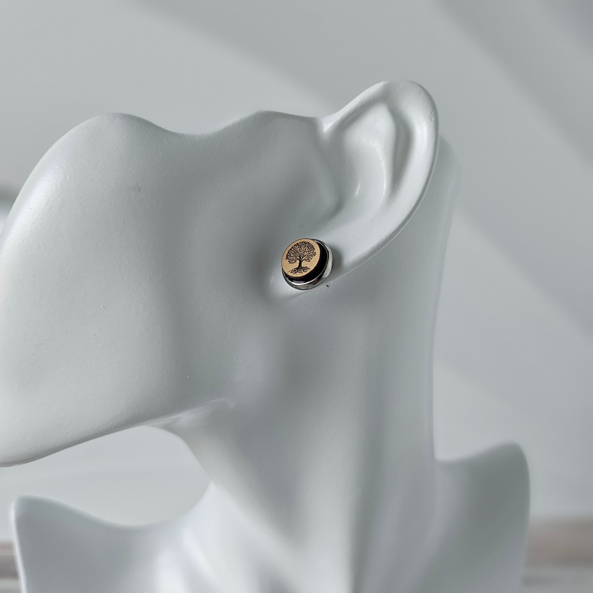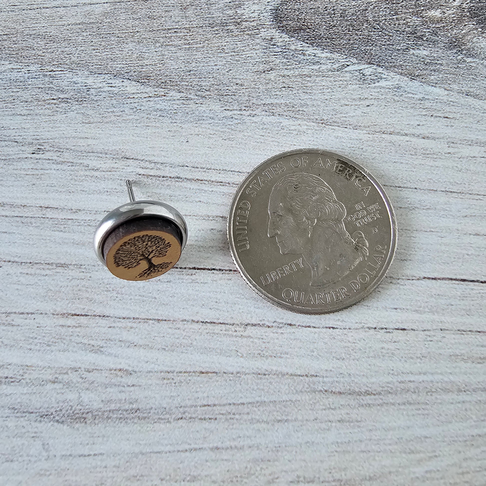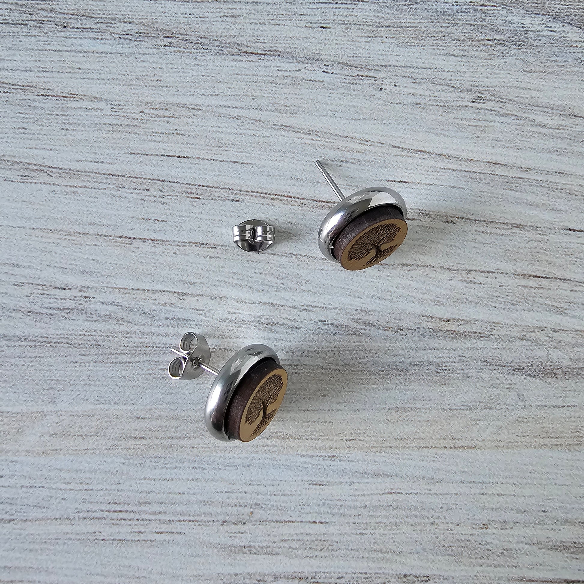 Engraved on eco friendly MDF wood with hypoallergenic stainless steel bezels/posts for sensitive ears.