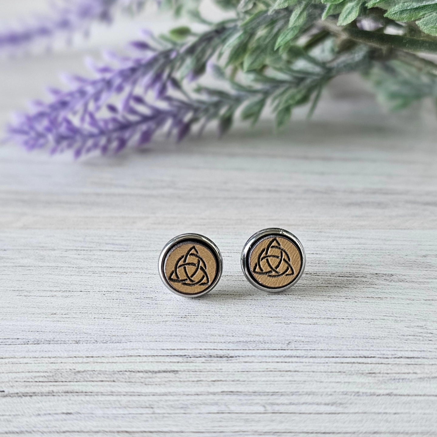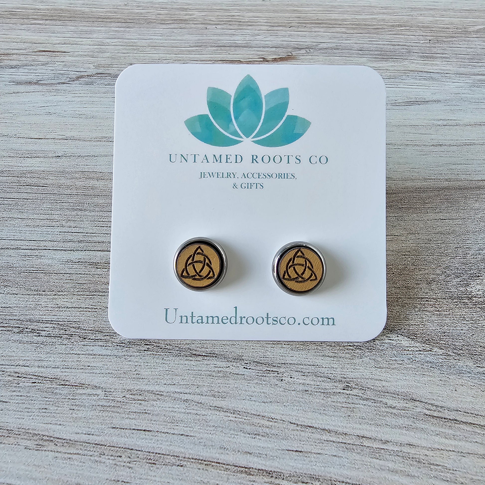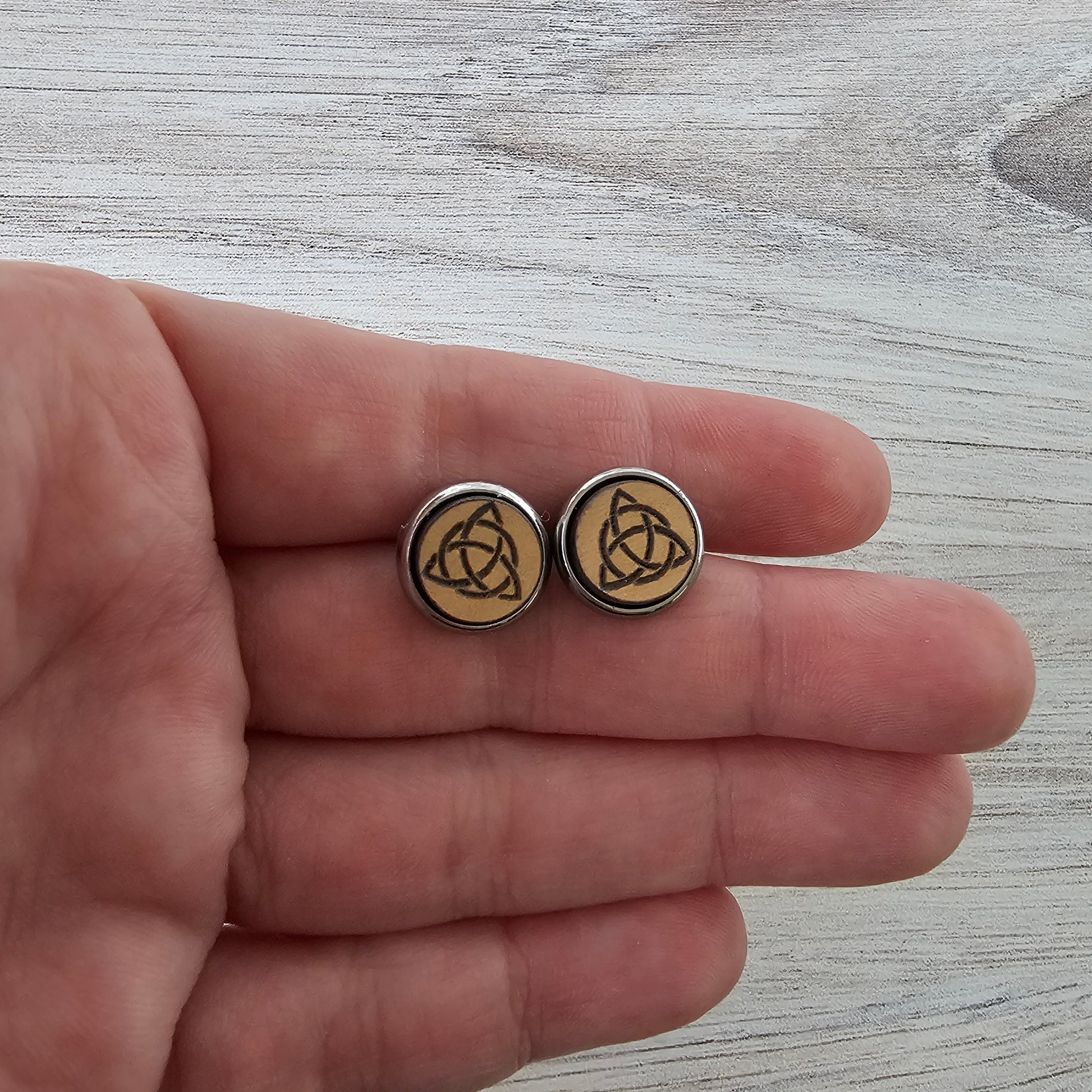 Engraved on eco friendly MDF wood with hypoallergenic stainless steel bezels/posts for sensitive ears.