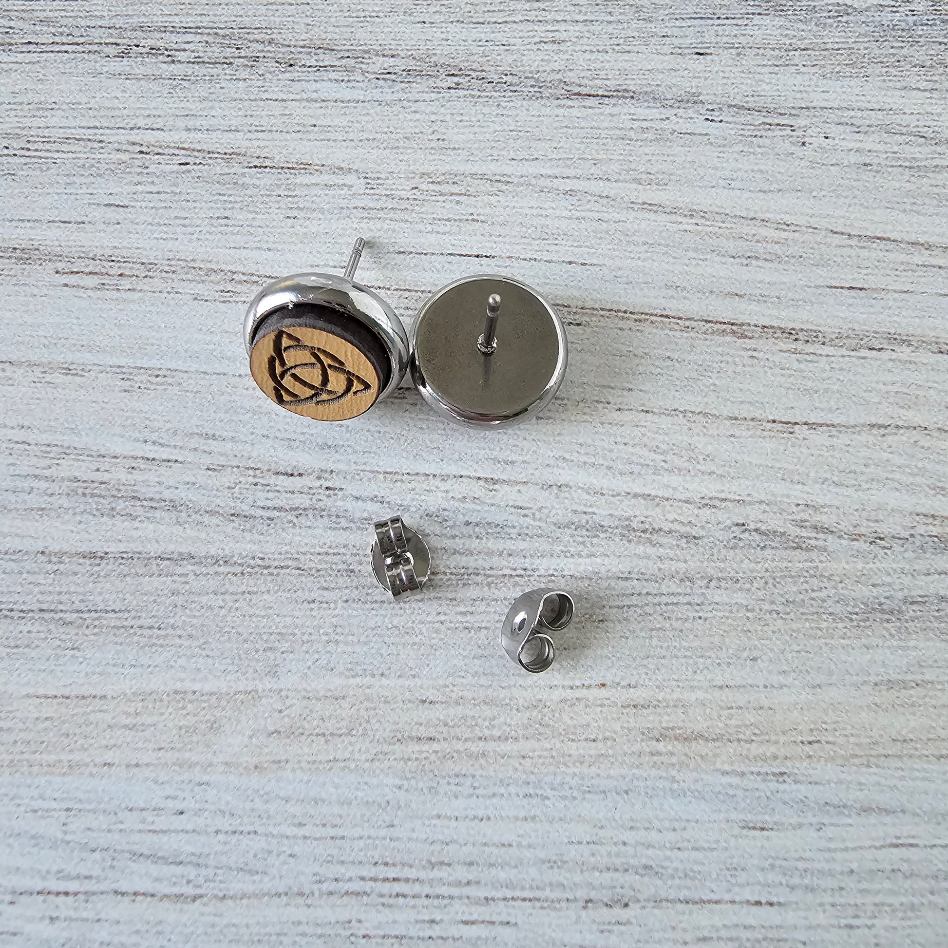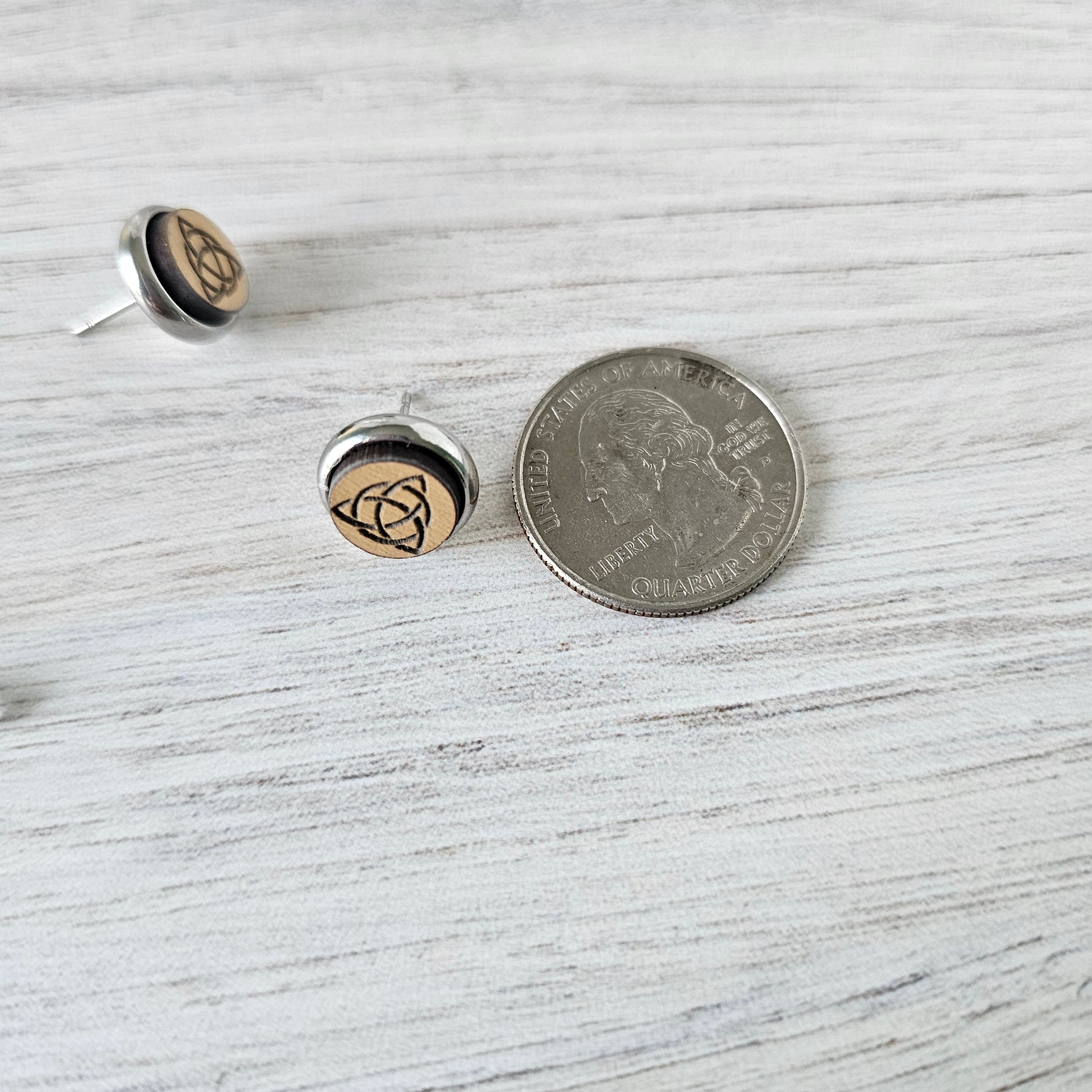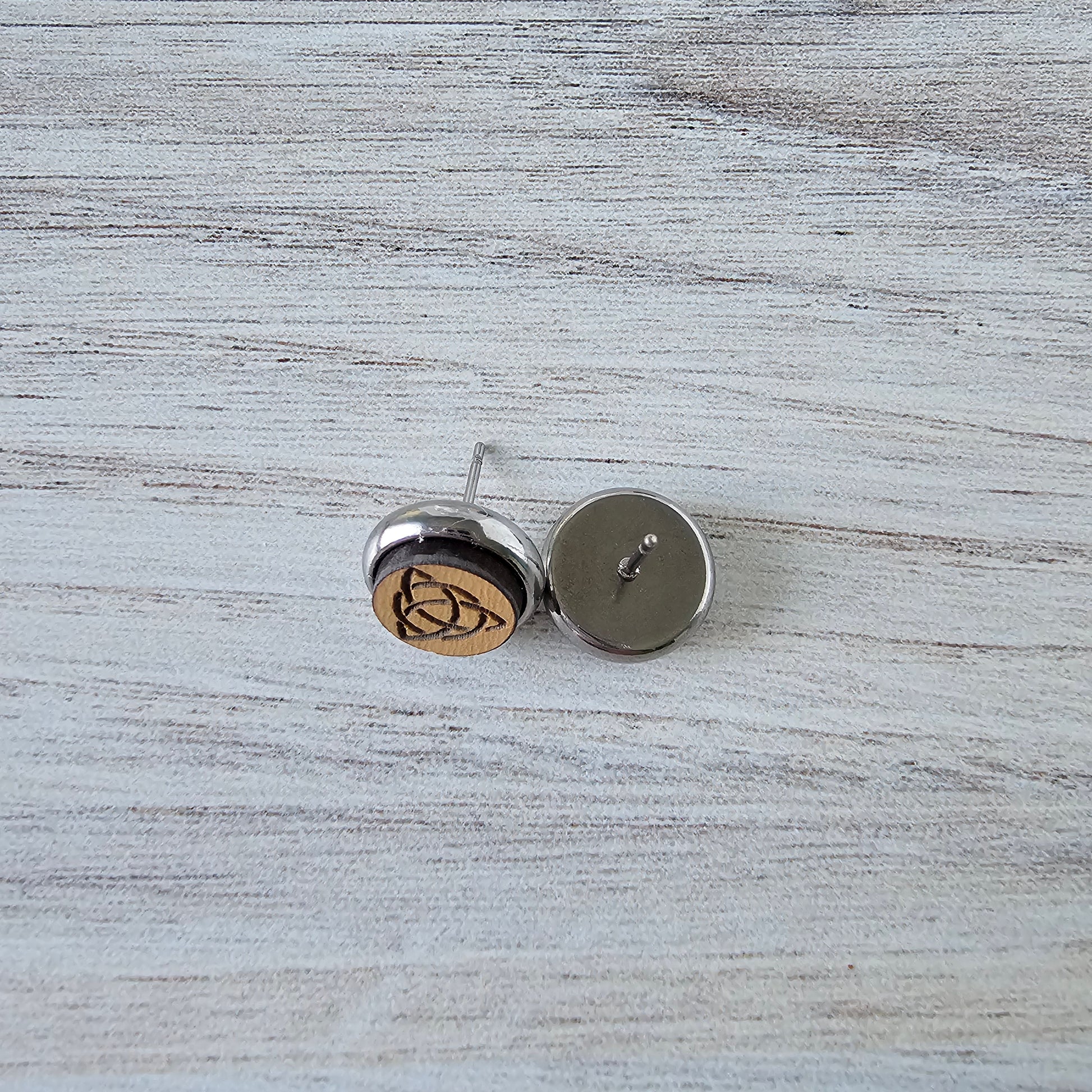 Engraved on eco friendly MDF wood with hypoallergenic stainless steel bezels/posts for sensitive ears.