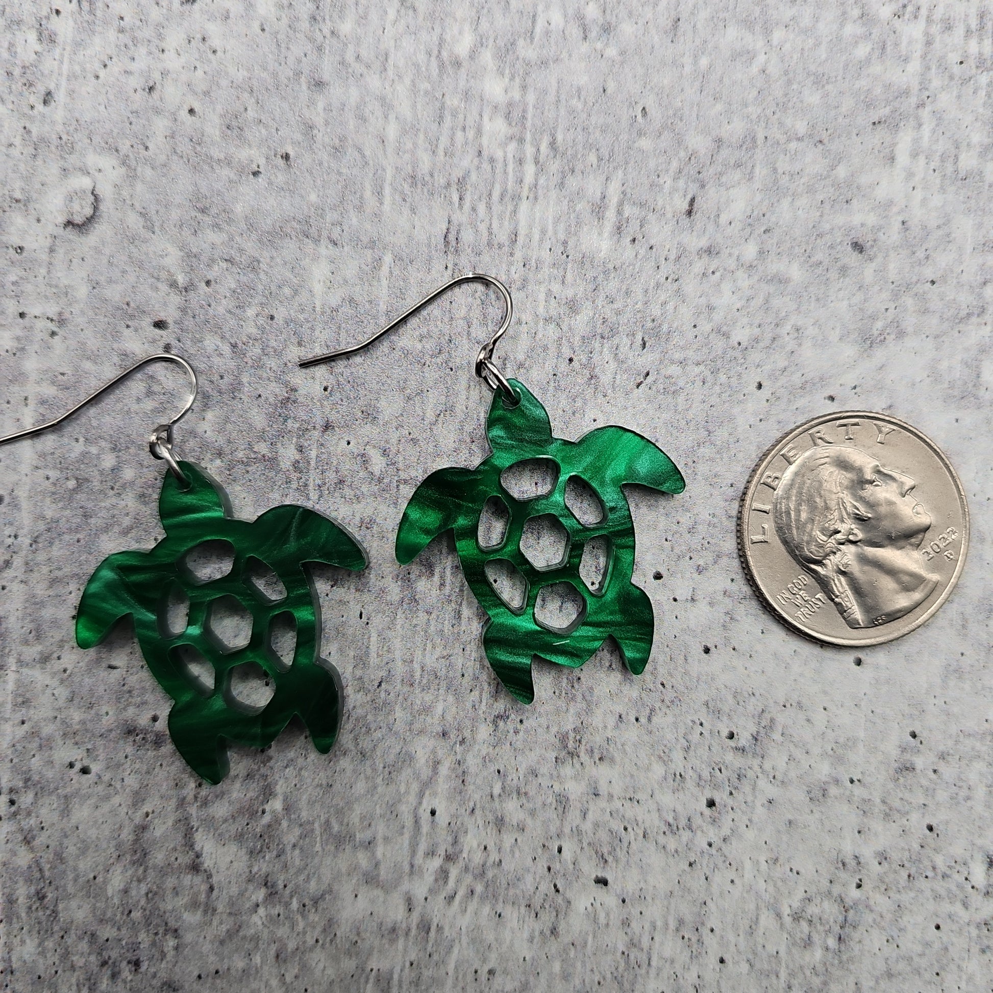 These Turtle Earrings are perfect for the ocean-lover in all of us! Crafted with beautiful green pearlescent acrylic and stainless steel hardware, they're as sturdy and stylish as a sea-faring turtle! Plus, their cute silhouette will ensure they stay your newest fashion favorite. So, treat yourself to these who-shell-ifully chic earrings!