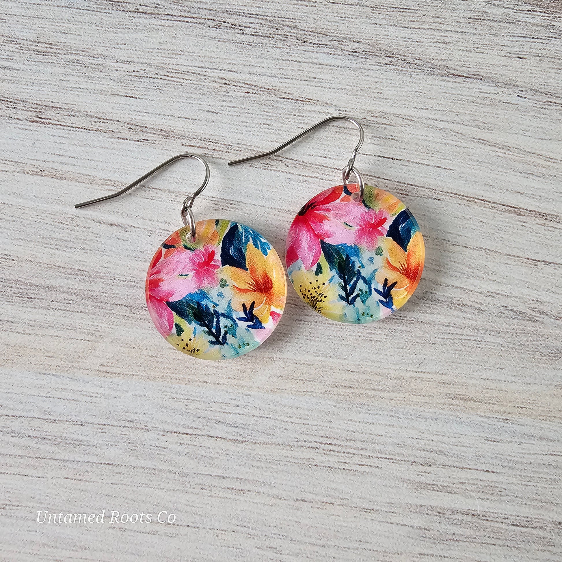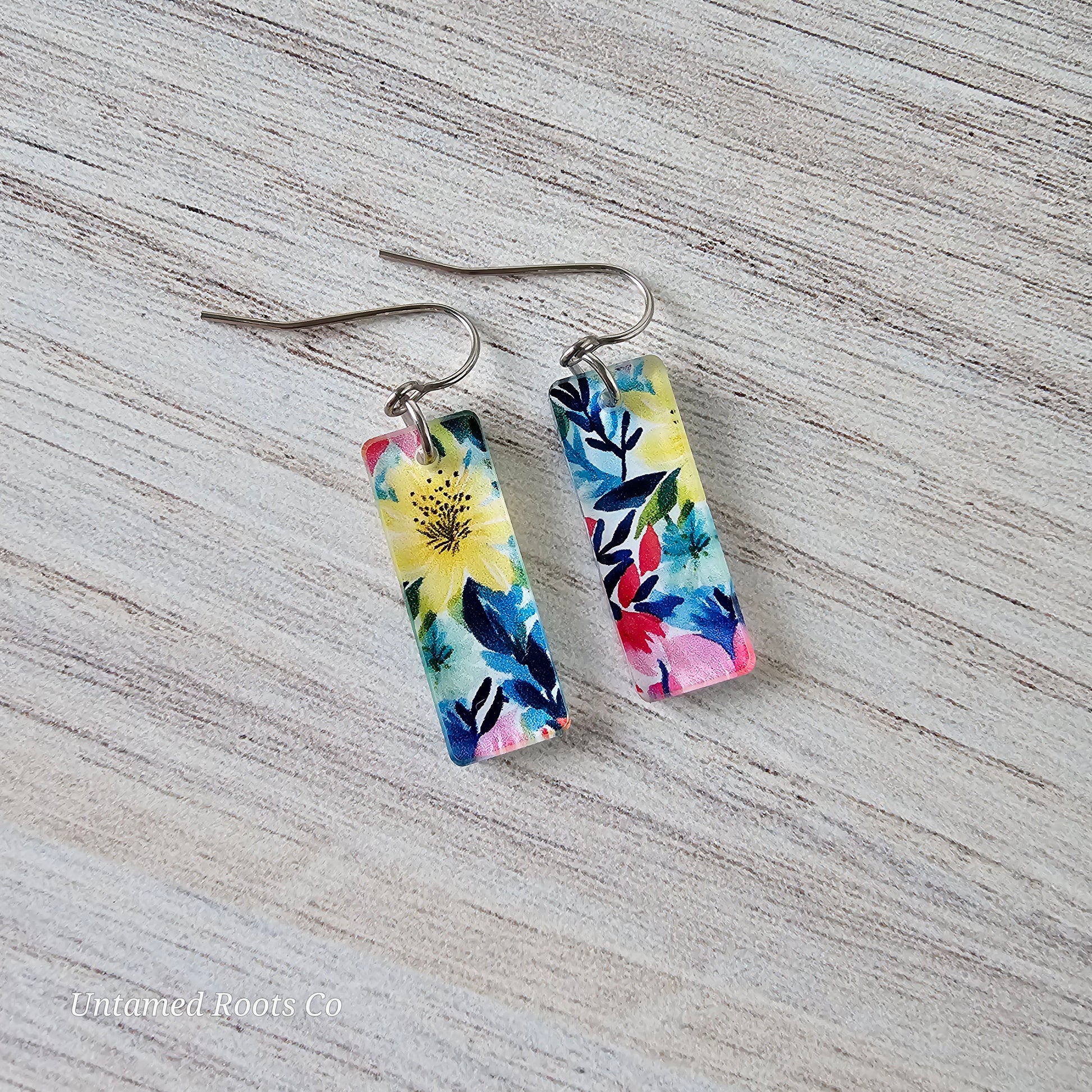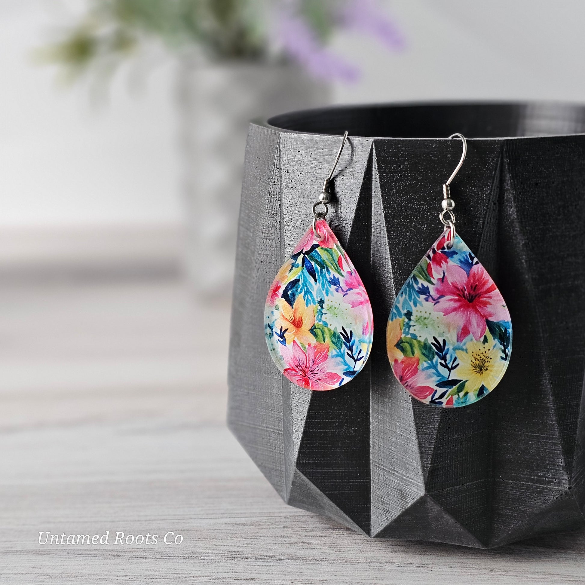Available in 8 different sizes and shapes, these earrings feature a clear acrylic with a vibrant watercolor floral print!